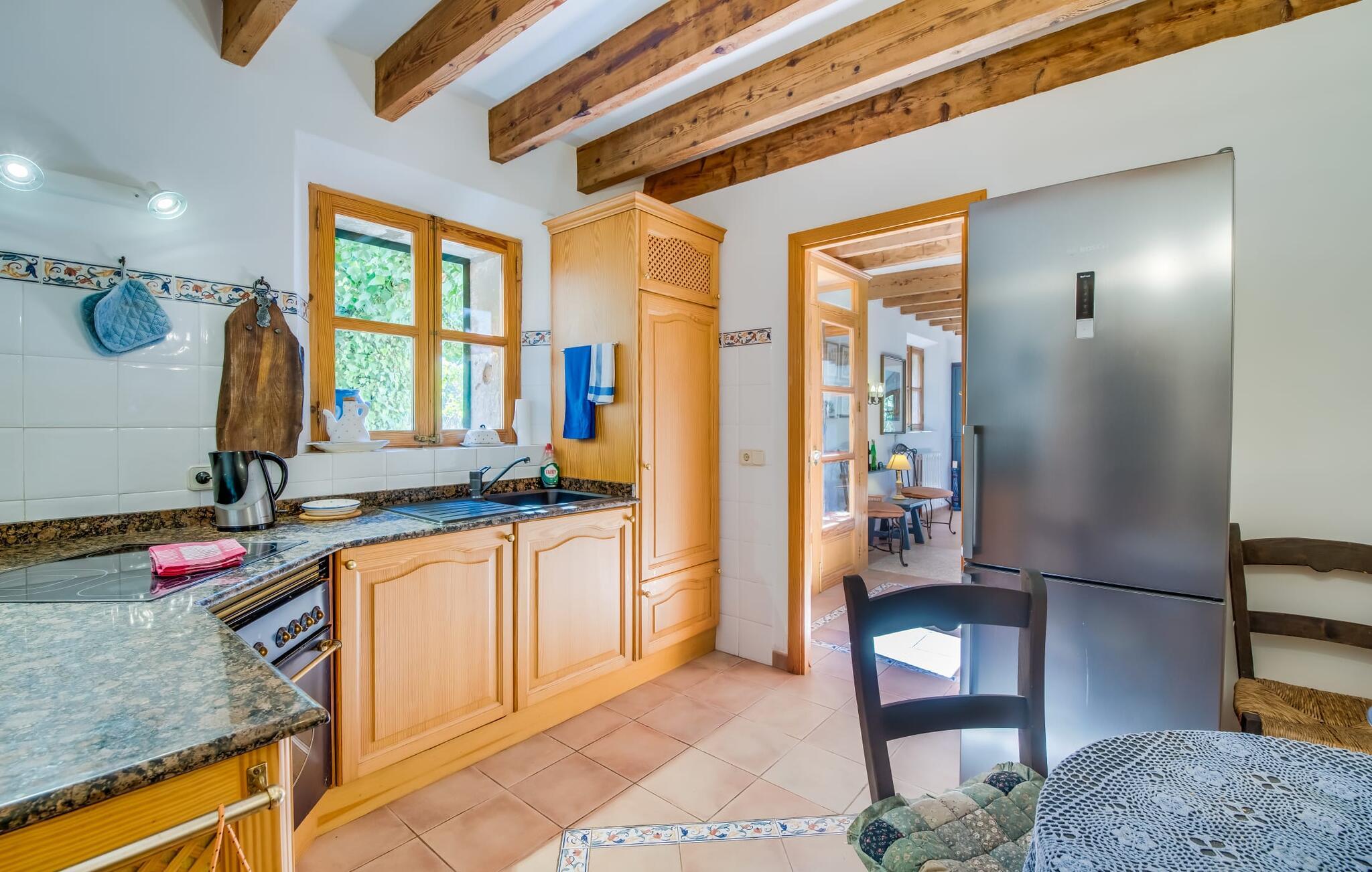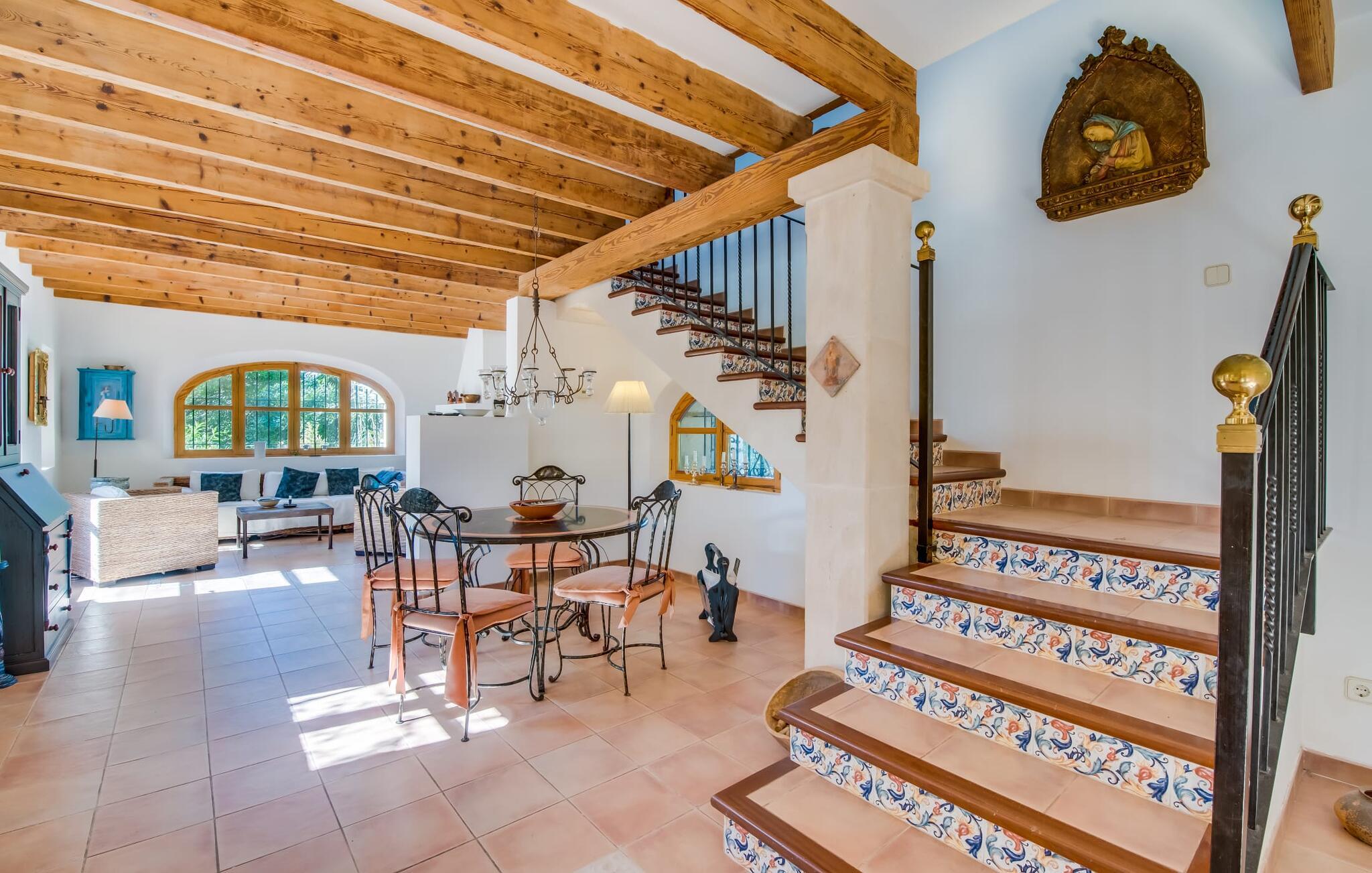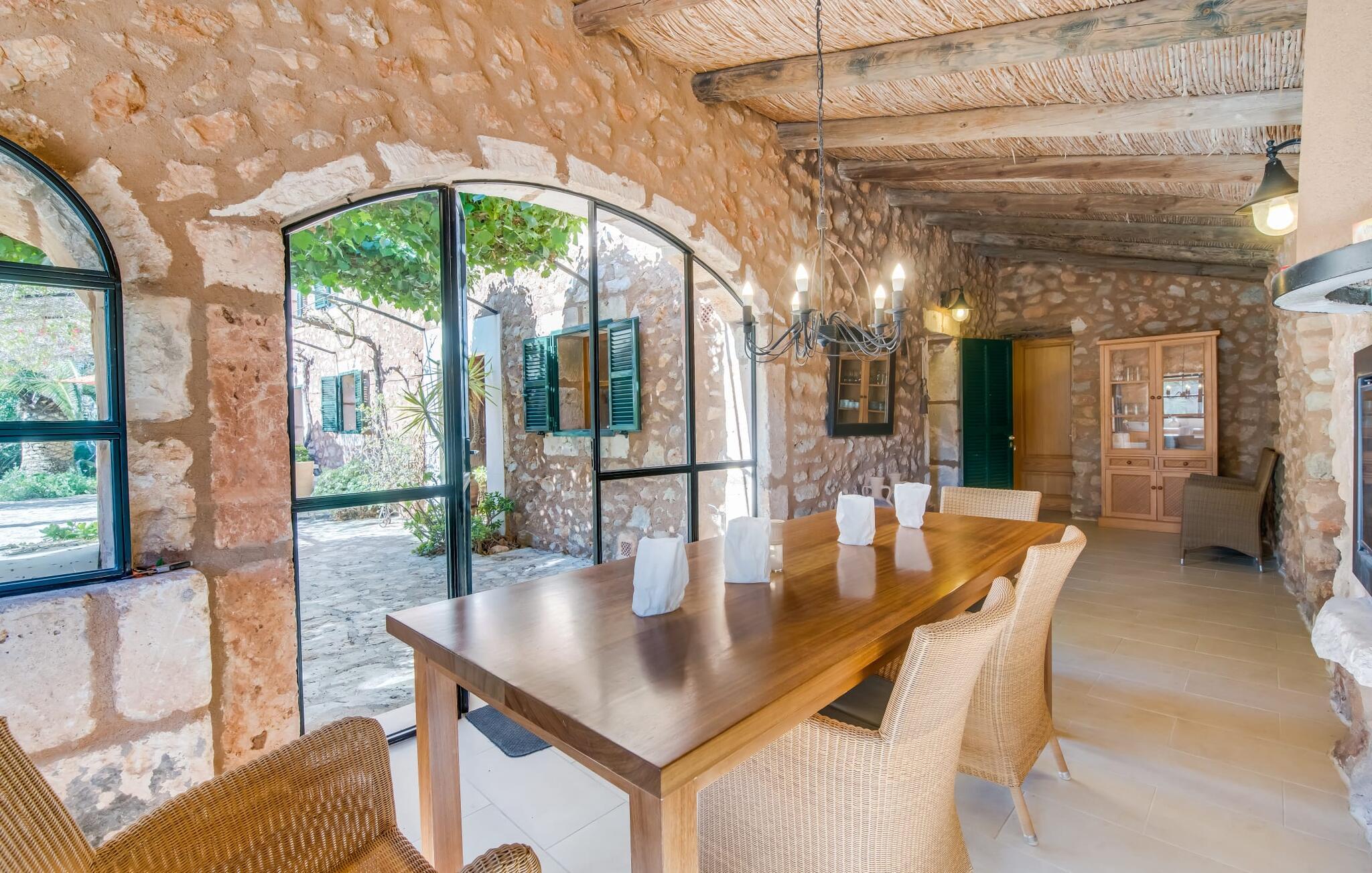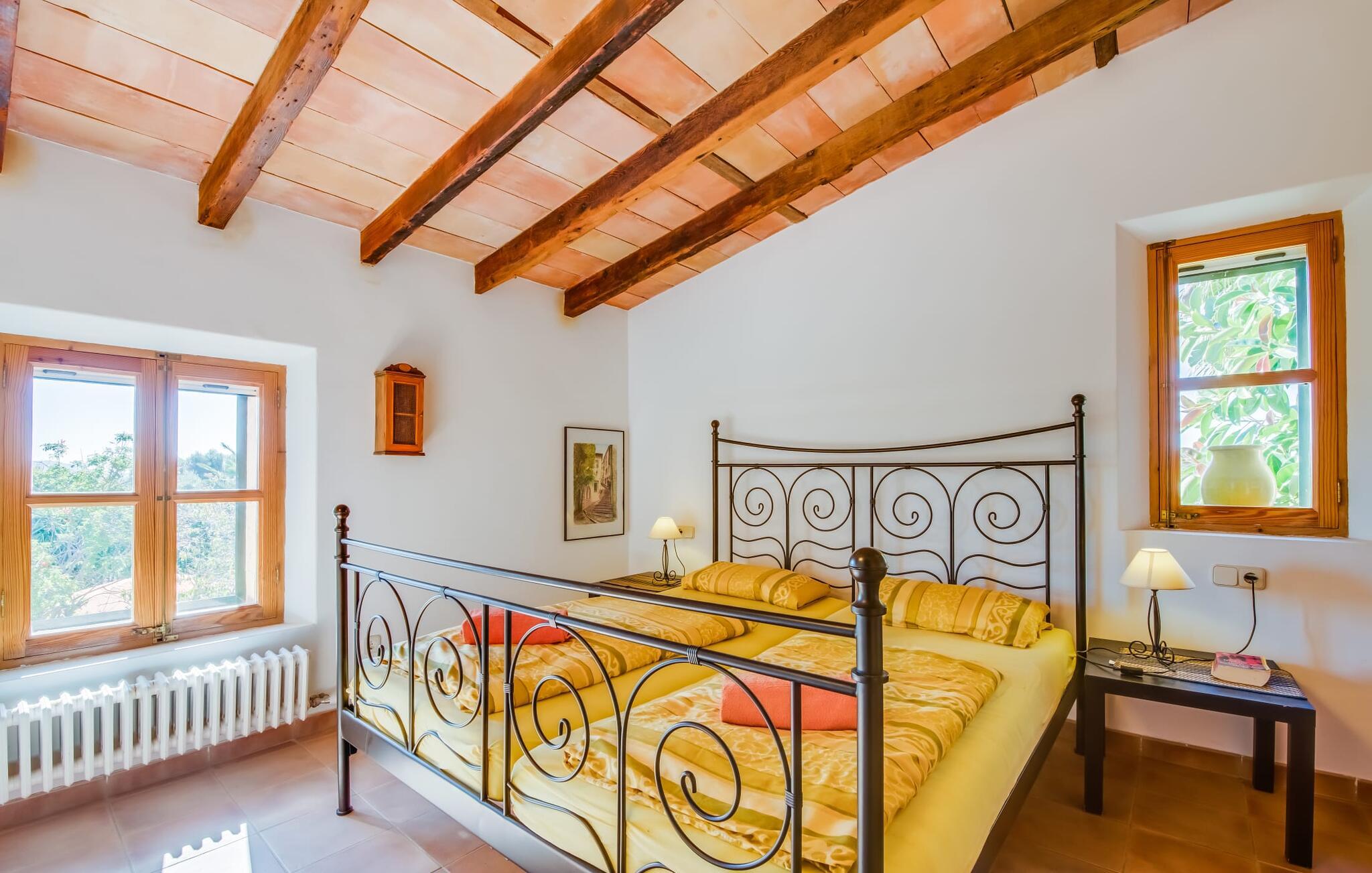 Citrontræer, palmer, kaktusser - "Son Pi" er omgivet af en vidunderligt fortryllende have, der næsten ikke kunne være mere naturlig og rustik. Ejendommen har ikke kun smukke planter, det omkringliggende område er også præget af frodig vegetation. Dette rundes af af det ru stengulv, som passer så vidunderligt ind i billedet, og selvfølgelig af selve villaen, der emmer af ren ro med sine grønne skodder. I kan finde siddepladser i delvis skygge af den tilgroede pergola, på komfortable rattanmøbler eller på den overdækkede terrasse foran huset. Hvis I ønsker det, kan I varme murstensgrillen op eller forkæle jer selv med en forfriskende svømmetur i den højkvalitets flisebelagte, velholdte pool - I kommer nemt ind via få trin. Der er også en udendørs bruser lige ved siden af poolen. Liggestole, mobile parasoller, masser af privatliv - I har alt hvad I behøver til en afslappende dag under den behagelige ø-sol. Praktisk for jeres ankomst: En asfalteret vej fører direkte til villaen og tilbyder plads til parkering. Interiøret er ikke mindre charmerende. Fuldstændig nyrenoveret, oprindeligt indrettet med stor sans for detaljer. Alt I skal gøre er at pakke jeres kufferter ud, og I vil føle jer afslappet. Masser af naturlige elementer, masser af træbjælker og stenvægge, plus varme farver og masser af naturligt lys. Den hyggelige stue/spisestue imponerer med sin smukke siddegruppe og store bord, men har også en pejs, der varmer jeres fødder på køligere aftener. Fra den anden ende af rummet kommer I ind i køkkenet, som er udstyret med mange praktiske faciliteter. Så smukt: den separate spisestue med en stor glasvæg og udsigt til haven. Et godt sted at afslutte dagen om aftenen med et knitrende bål. "Son Pi" har i alt tre dobbeltværelser, hvoraf to er ovenpå og har eget badeværelse og udsigt til havet i det fjerne. Alle værelser er venlige og komfortabelt indrettede, så intet står i vejen for en god nats søvn. Den østlige del af øen er præget af bølgende bakker, grøn vegetation og landlige vidder. Udover skøn fred og smukke gåture kan I også nyde nærheden til mange interessante byer og drømmestrande. Porto Cristo, den lille havn og fiskerlandsby med sit hvide sand og smukke strandpromenade, ligger 20 minutter væk i bil. "Son Pi" ligger på en lille gade, hvilket betyder, at der kan høres en del trafikstøj afhængig af vindretningen. Det positive er dog den næsten perfekte forbindelse til motorvej MA-15 og alle retninger på øen. Aktive rejsende vil måske tage til Pula Golfbane eller besøge en af de mange grotter i denne region, som bestemt er et besøg værd. Den charmerende villa "Son Pi" ligger i den smukke østlige del af øen, lige uden for Sant Llorenç des Cardassar. Udover gode restauranter og små butikker, finder I også nogle supermarkeder i byen til jeres ugentlige indkøb. Frisk frugt og grønt kan købes på det ugentlige marked i Son Servera, som kun ligger et kvarter væk i bil. Fantastisk: de smukke strande i Porto Cristo og Sa Coma er også kun 13 km væk.