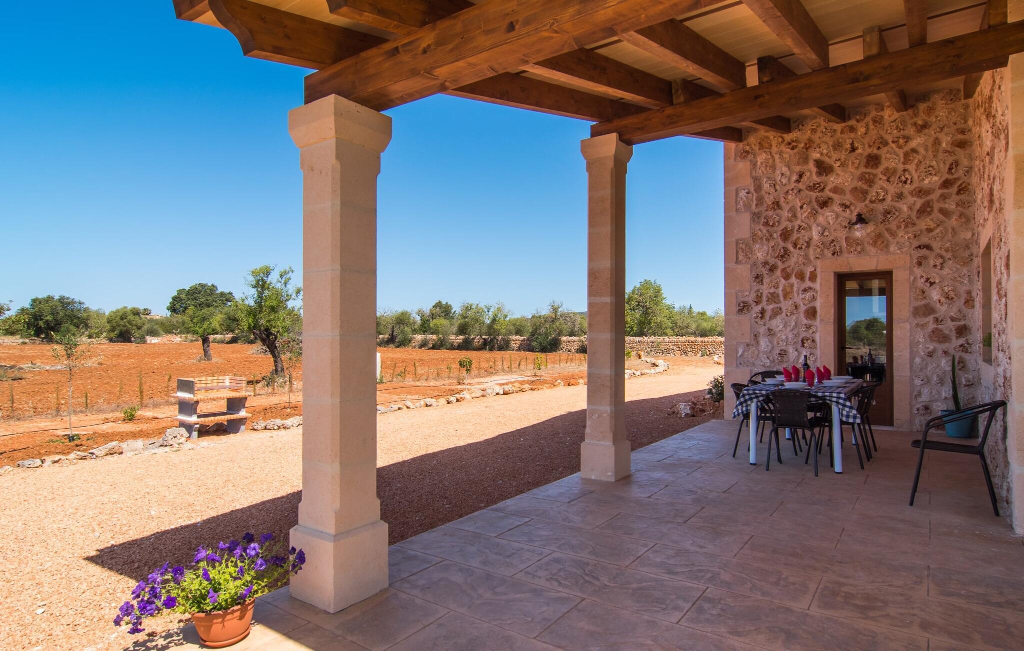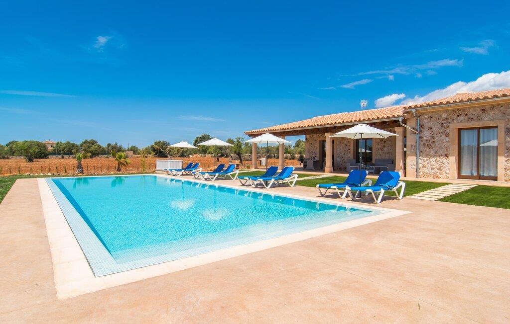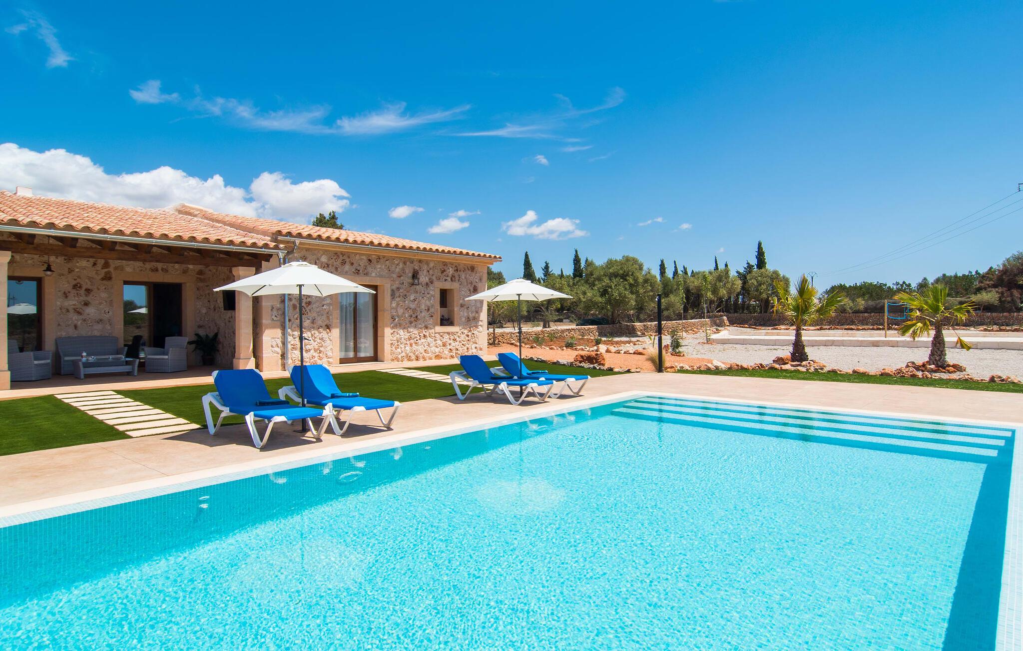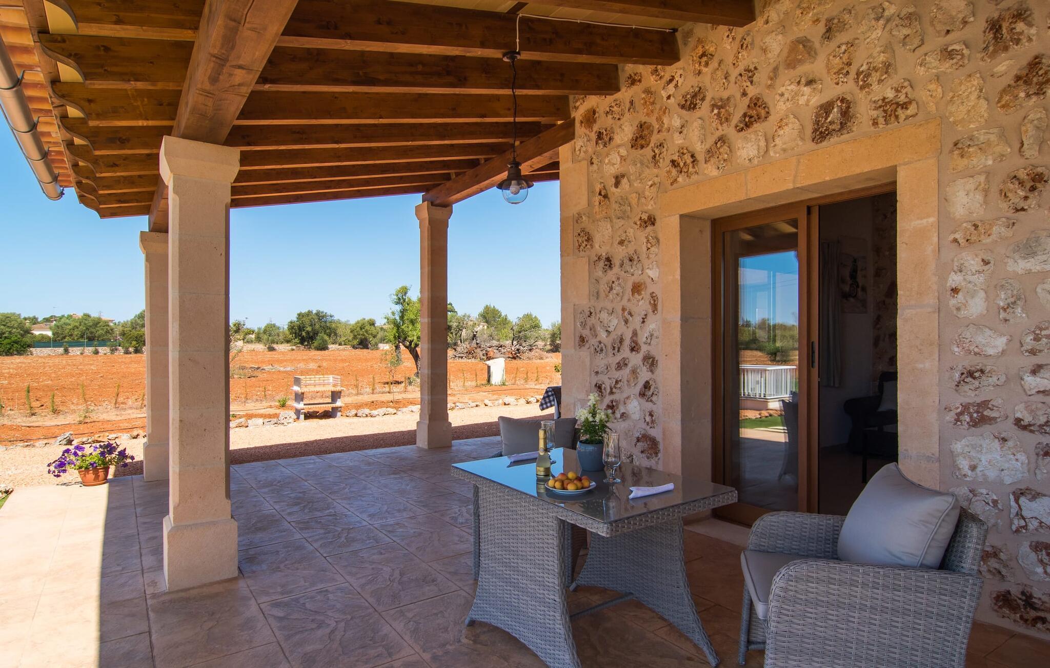 Vidunderligt komfortabelt og i en fantastisk afsondret beliggenhed på landet: Villaen "Son Pieras Nou" ligger kun få kilometer fra Llucmajor. I dette smukke hjørne af det sydlige Mallorca er der hverken naboer eller biler i sigte: Her kan I nyde absolut fred og ro midt i naturen og slappe af, som I vil. Det nybyggede naturstenshus ligger på en 28.000 m² stor grund med græsplæner og mange oliventræer. Hvis I kan lide at være aktiv, kan I gå ture med jeres medrejsende eller træne volleyball på den interne volleyballbane. Bagefter kan I køle af i den store, rektangulære pool med udendørs bruser, hvor børn også nyder at plaske og svømme. For at holde øje med dem kan forældre enten sidde på en af de behagelige liggestole eller... Sidde i skyggen på den overdækkede terrasse med forskellige indbydende siddemuligheder. Interiøret i "Son Pieras Nou" er designet med et godt øje for smagfulde detaljer. Naturfarver dominerer, hvidmalede vægge veksler med rustikke naturstensvægge, lofterne imponerer med flotte mørkebrune træbjælker og gulvet er flisebelagt i en flot lysebrun farve. Alt dette skaber en behagelig afslappet, landlig ferieatmosfære. Et arkitektonisk højdepunkt er fraværet af trapper: I villaen i stueetagen er alle værelser praktisk talt på ét plan. Disse omfatter den rummelige stue med to komfortable sofaer og flere lænestole foran fjernsynet eller spisepladsen, som åbner ud til køkkenet, med et elegant bord, designerstole og stemningsfuld belysning. Et andet højdepunkt er det ultra-chikke køkken, hvis stil passer perfekt til resten af huset, og hvorfra man kan nyde udsigten udenfor. Boligarealet er afrundet af tre soveværelser med aircondition og to moderne badeværelser, hvoraf det ene er en-suite. Lange gåture, lange cykelture – det typiske middelhavslandskab omkring jeres sommerhus er ideelt til udflugter. I vil sikkert leje en bil de 4 km til den nærmeste by Llucmajor. Byen var engang kendt som et industricenter, der primært specialiserede sig i skoproduktion. Men også her har landbruget altid spillet en vigtig rolle. Dette kan stadig ses i dag i de mange abrikos- og mandelmarker uden for bymuren. I Llucmajor finder I imponerende historiske bygninger, hyggelige caféer og talrige restauranter samt alt hvad I behøver til dagligdagen. Det er også værd at besøge det ugentlige marked om søndagen. S'Arenal Strand ligger kun 12,7 km derfra i bil. Med sit fine hvide sand, gode infrastruktur og livlige promenade tiltrækker den ikke kun familier, men også festglade turister. Den lille strand Caló de Sant Antoni, 14,9 km væk, er meget mere stille. Fantastisk fred midt i naturen og masser af bokomfort - hvis det lyder som jeres perfekte ferie, så er villaen "Son Pieras Nou" det rigtige sted for jer! Naturstenshuset med overdækkede terrasser ligger på en kæmpe grund kun 4 km fra Llucmajor, midt i det smukke landskab i den sydlige region af øen. Den nærmeste strand i S'Arenal ligger kun 12,7 km væk.