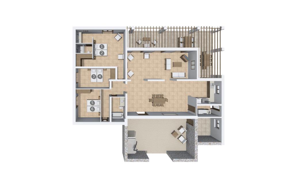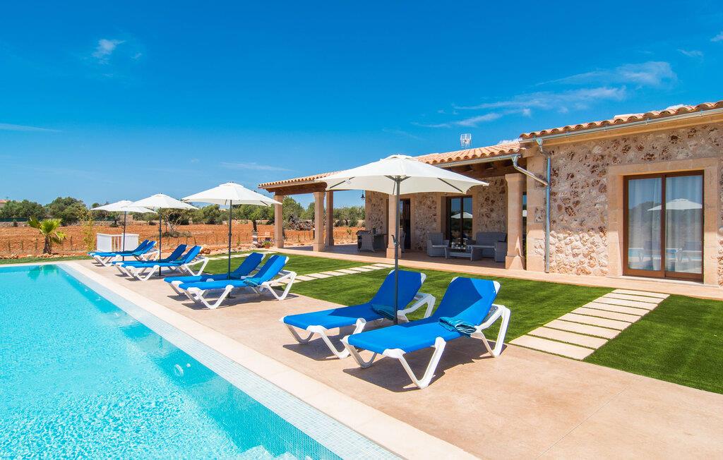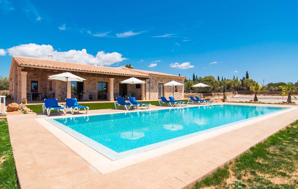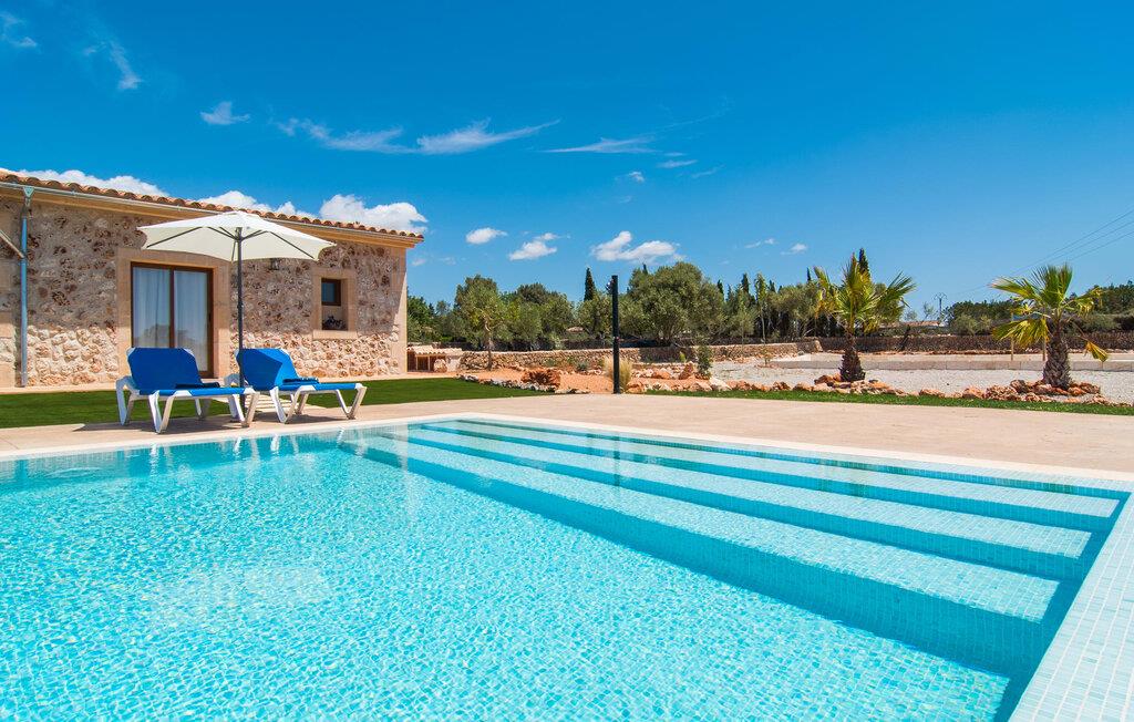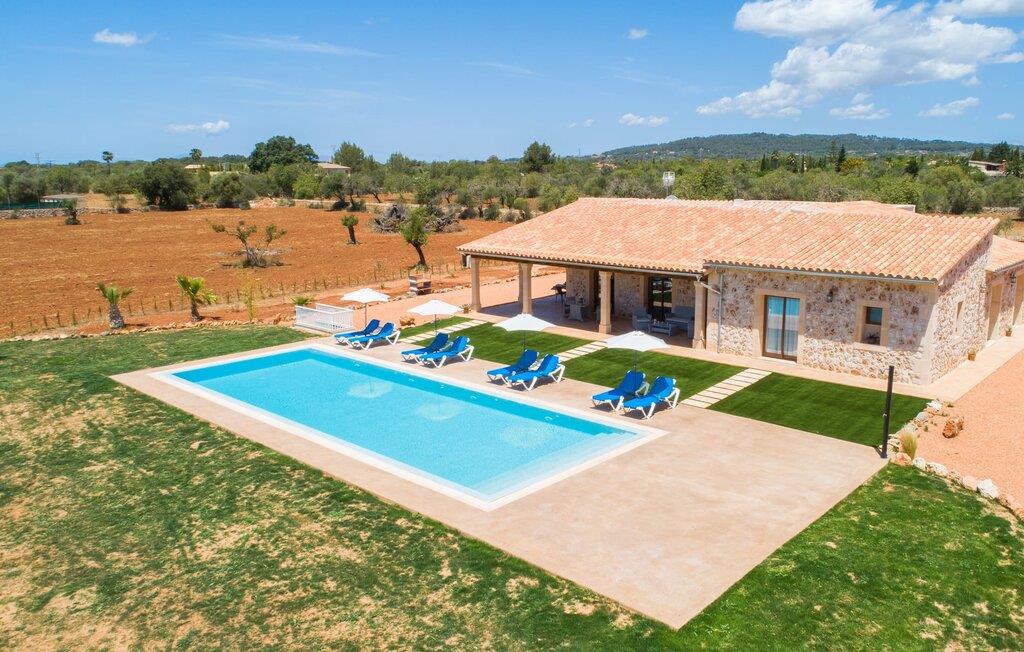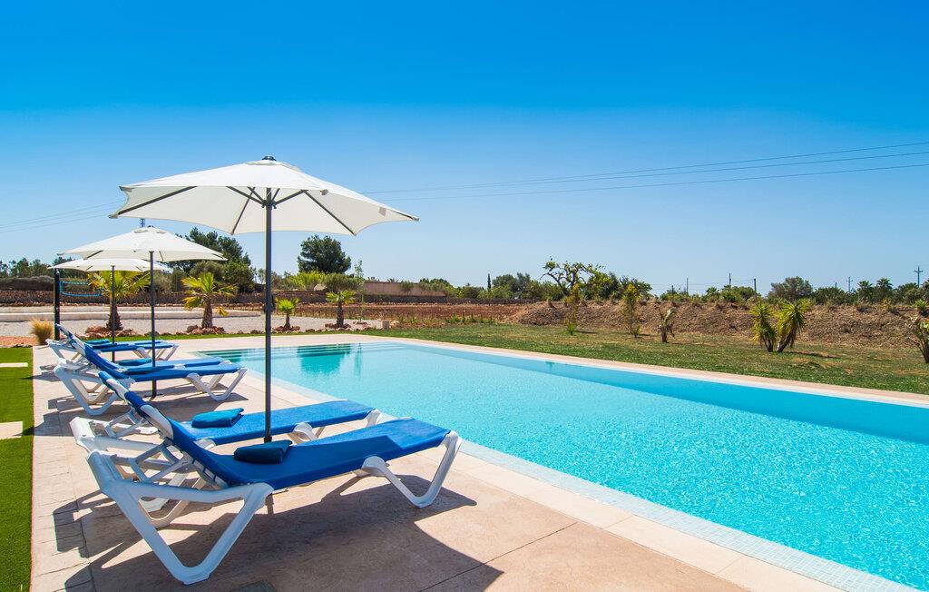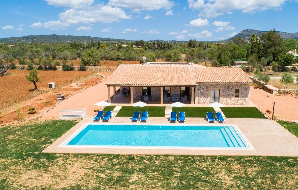 Vidunderligt komfortabelt og i en fantastisk afsondret beliggenhed på landet: Villaen "Son Pieras Nou" ligger kun få kilometer fra Llucmajor. I dette smukke hjørne af det sydlige Mallorca er der hverken naboer eller biler i sigte: Her kan I nyde absolut fred og ro midt i naturen og slappe af, som I vil. Det nybyggede naturstenshus ligger på en 28.000 m² stor grund med græsplæner og mange oliventræer. Hvis I kan lide at være aktiv, kan I gå ture med jeres medrejsende eller træne volleyball på den interne volleyballbane. Bagefter kan I køle af i den store, rektangulære pool med udendørs bruser, hvor børn også nyder at plaske og svømme. For at holde øje med dem kan forældre enten sidde på en af de behagelige liggestole eller... Sidde i skyggen på den overdækkede terrasse med forskellige indbydende siddemuligheder. Interiøret i "Son Pieras Nou" er designet med et godt øje for smagfulde detaljer. Naturfarver dominerer, hvidmalede vægge veksler med rustikke naturstensvægge, lofterne imponerer med flotte mørkebrune træbjælker og gulvet er flisebelagt i en flot lysebrun farve. Alt dette skaber en behagelig afslappet, landlig ferieatmosfære. Et arkitektonisk højdepunkt er fraværet af trapper: I villaen i stueetagen er alle værelser praktisk talt på ét plan. Disse omfatter den rummelige stue med to komfortable sofaer og flere lænestole foran fjernsynet eller spisepladsen, som åbner ud til køkkenet, med et elegant bord, designerstole og stemningsfuld belysning. Et andet højdepunkt er det ultra-chikke køkken, hvis stil passer perfekt til resten af huset, og hvorfra man kan nyde udsigten udenfor. Boligarealet er afrundet af tre soveværelser med aircondition og to moderne badeværelser, hvoraf det ene er en-suite. Lange gåture, lange cykelture – det typiske middelhavslandskab omkring jeres sommerhus er ideelt til udflugter. I vil sikkert leje en bil de 4 km til den nærmeste by Llucmajor. Byen var engang kendt som et industricenter, der primært specialiserede sig i skoproduktion. Men også her har landbruget altid spillet en vigtig rolle. Dette kan stadig ses i dag i de mange abrikos- og mandelmarker uden for bymuren. I Llucmajor finder I imponerende historiske bygninger, hyggelige caféer og talrige restauranter samt alt hvad I behøver til dagligdagen. Det er også værd at besøge det ugentlige marked om søndagen. S'Arenal Strand ligger kun 12,7 km derfra i bil. Med sit fine hvide sand, gode infrastruktur og livlige promenade tiltrækker den ikke kun familier, men også festglade turister. Den lille strand Caló de Sant Antoni, 14,9 km væk, er meget mere stille. Fantastisk fred midt i naturen og masser af bokomfort - hvis det lyder som jeres perfekte ferie, så er villaen "Son Pieras Nou" det rigtige sted for jer! Naturstenshuset med overdækkede terrasser ligger på en kæmpe grund kun 4 km fra Llucmajor, midt i det smukke landskab i den sydlige region af øen. Den nærmeste strand i S'Arenal ligger kun 12,7 km væk.