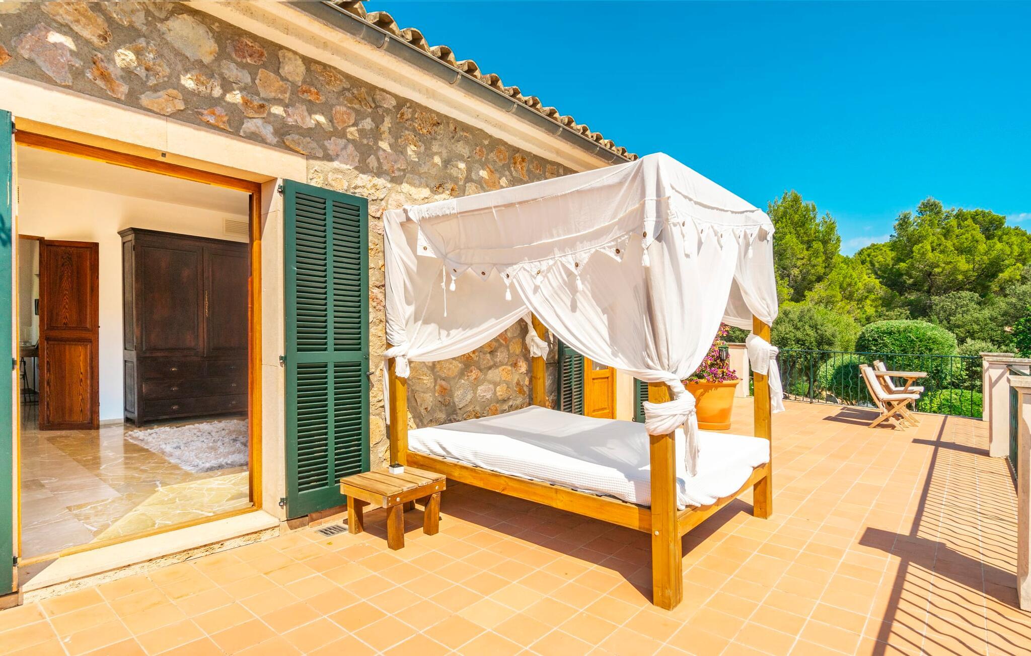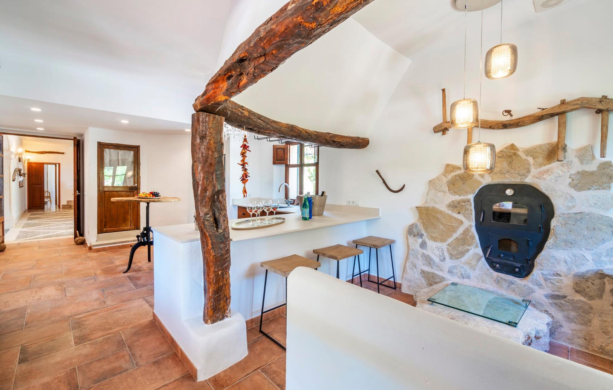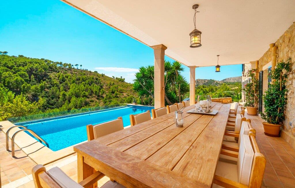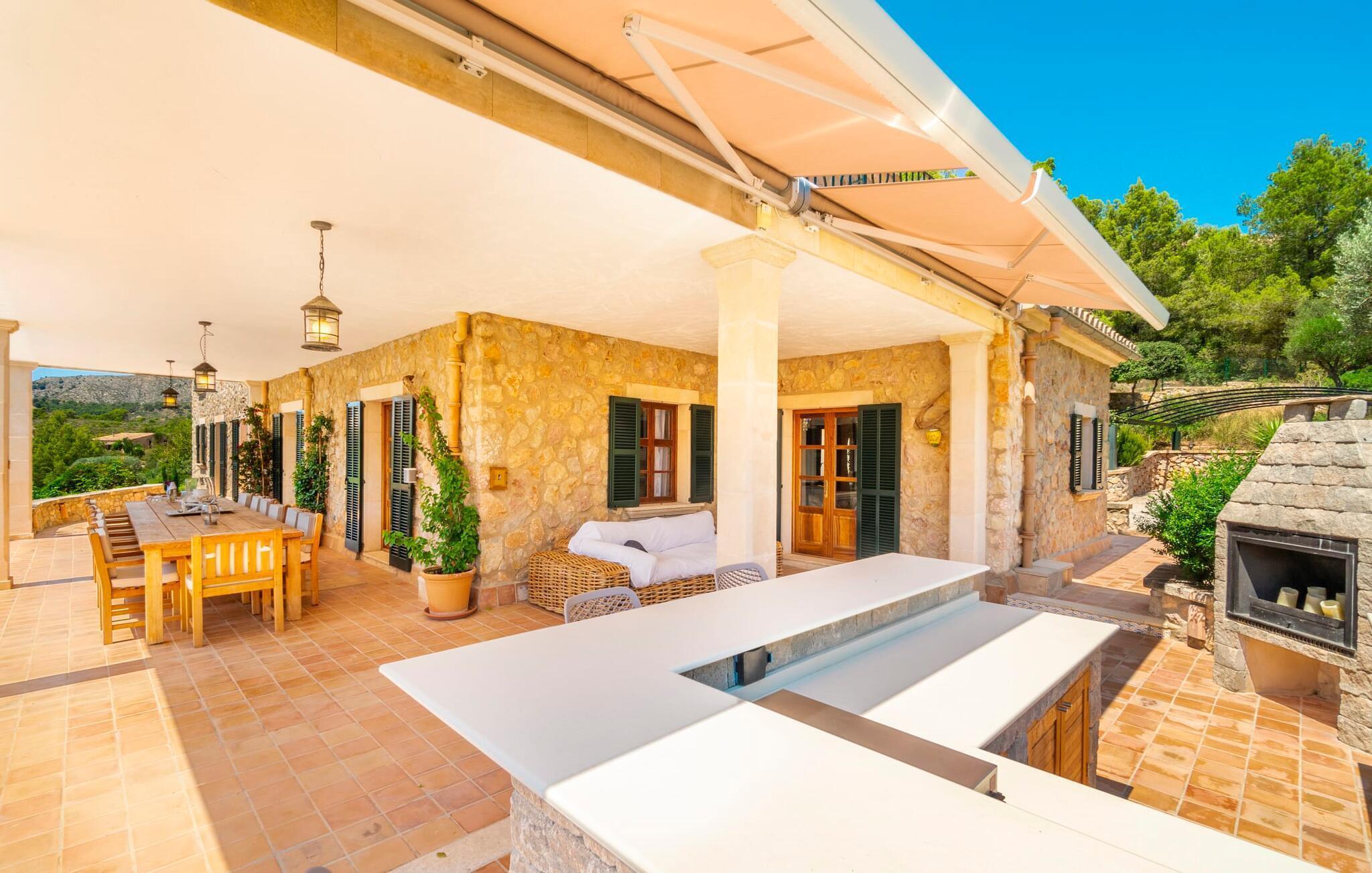 Ankom, sluk, nyd: Dette fristende feriemantra byder jer velkommen til den imponerende villa "Son Pujol de Andratx". Det smukke naturstenshus i to rummelige etager ligger ikke kun på en charmerende bjergskråning, men er også sydvendt og nyder godt af masser af sol og en behagelig ugenert beliggenhed. Det er ikke kun omgivet af forskellige overdækkede og udækkede indbydende terrassearealer, men tiltrækker også med endnu en terrasse på øverste etage og en kæmpe, alsidigt anlagt ejendom. En del af terrassearealet er udstyret med et spraykølesystem, som køler omgivelsestemperaturen med omkring 10 grader og holder hvepse væk. I kan gå rundt blandt velduftende rosmarin- og lavendelbuske, små oliventræer og palmer, men der er også plads til, at børn kan lege på plænerne. For sportsentusiaster er der et udendørs bordtennisbord, en pull-up bar og en boulebane i strandsandet. Hist og her er der skabt smukke hjørner til afslapning, for eksempel stilfulde liggestole eller en daybed med gardiner, der svajer romantisk i vinden - simpelthen fantastisk! Det gælder også infinity-poolen lige ved siden af huset, hvorfra man kan tage et kig på den omkringliggende natur. I kan nyde en lignende udsigt fra det ekstra lange spisebord på den overdækkede terrasse, som byder på plads nok til alle rejsende. Silbermühlen-grillen i det fuldt udstyrede udendørs stenkøkken tilbyder de bedste betingelser for kulinariske aftener af høj kvalitet i det fri. Storslåede stengulve, hvide vægge, flotte detaljer som gamle bjælker, glitrende lysekroner og elegante søjler – indretningen af jeres sommerhus er et sandt blikfang. "Son Pujol de Andratx" er blevet møbleret og dekoreret med stor smag, men også en god følelse af komfort. Værelserne er rummelige og lyse, det imponerende indgangsparti byder jer velkommen i stueetagen. Lad os derefter gå videre til et enkelt åbent rum, der rummer opholds- og spiseområderne samt køkkenet. Mens en stor sofa med afslapningsfunktion i stuen indbyder til at putte sig foran pejsen, er der et langt træbord i spisestuen til en overdådig middag. I kan tilberede de lækkerier, I vil servere, i køkkenet lige ved siden af. Hobbykokke vil blive begejstrede for pladsen og de absolut højkvalitets apparater. Når det er tid til søde drømme, kan I trække jer tilbage til et af de fem stilfulde soveværelser, hver med et smart en-suite badeværelse, pengeskab og aircondition. Det bakkede og skovklædte landskab omkring jeres ejendom er særdeles velegnet til lange gå- eller vandreture, da det er et af de smukkeste områder i den sydvestlige del af øen. Andratx er ca. 3,9 km væk med udlejningsbil. Den traditionelle by, populær som eksklusivt boligområde, ligger i Tramuntana-bjergenes dal og er bestemt et besøg værd. Med sine smalle gader og autentiske mallorcanske bybilleder giver Andratx ikke kun inspiration til mange kunstnere og forfattere, men tiltrækker også et internationalt publikum. Ud over de smukke kirker Santa Maria de Andratx og s'Arracó og Castel de Son Mas, som nu bruges som rådhus, bør I også kigge forbi kulturcentret CCA Andratx, hvor moderne kunst er udstillet. For en dag på stranden kan I for eksempel tage til Platja de Sant Elm, kun 10 km væk. Takket være dets fine sand og let skrånende kyst er den særlig populær blandt familier med små børn. Stranden byder også på god infrastruktur og en promenade til slentreture. "Son Pujol de Andratx" er en villadrøm, der går i opfyldelse: et betagende, stort naturstenshus, bygget i en fantastisk sydvendt beliggenhed, afsondret beliggenhed på en skråning, på en kæmpe ejendom med en fortryllende have, kun 3,9 km fra Andratx . Bag huset kan I forvente ikke kun overdækkede og solrige terrasseområder, men også en fantastisk infinity-pool, hvorfra I kan nyde en imponerende udsigt over den omkringliggende natur. Stranden i Platja de Sant Elm ligger kun 10 km væk i bil. Bemærk venligst, at denne ejendom ikke accepterer ungdomsgrupper eller polterabender. En ungdomsgruppe på denne ejendom består af personer under 30 år. Book ikke denne ejendom, hvis I er en ungdomsgruppe eller en polterabendgruppe, da jeres reservation vil blive afvist, når den er booket, hvilket også kan være tilfældet ved ankomst til ejendommen eller under jeres ophold, og I vil ikke modtage en refusion.
