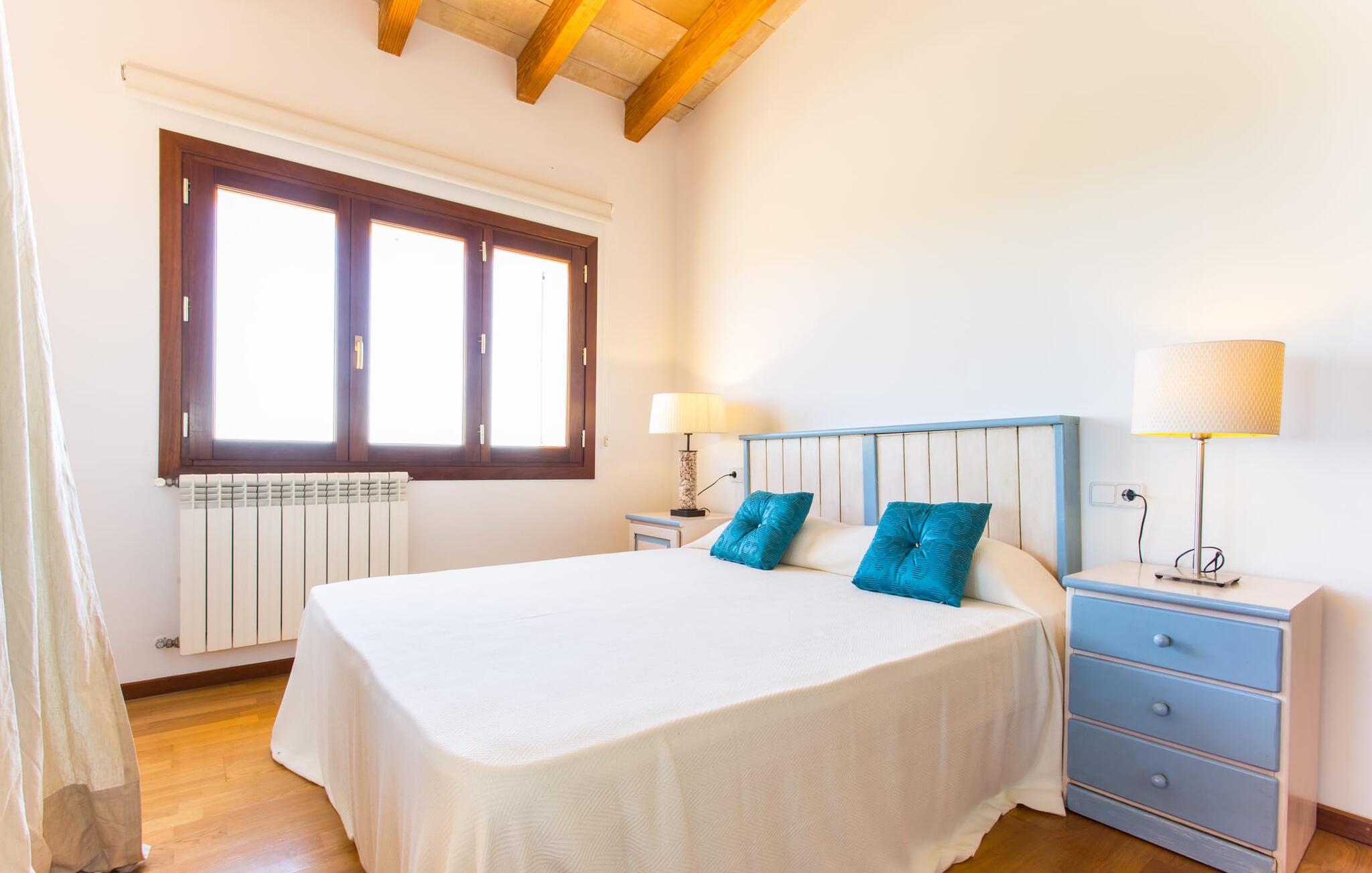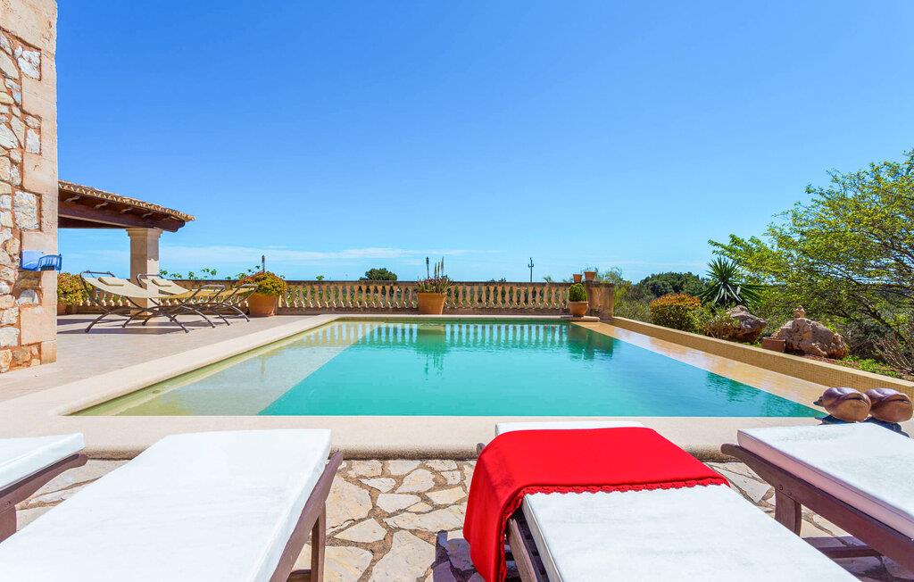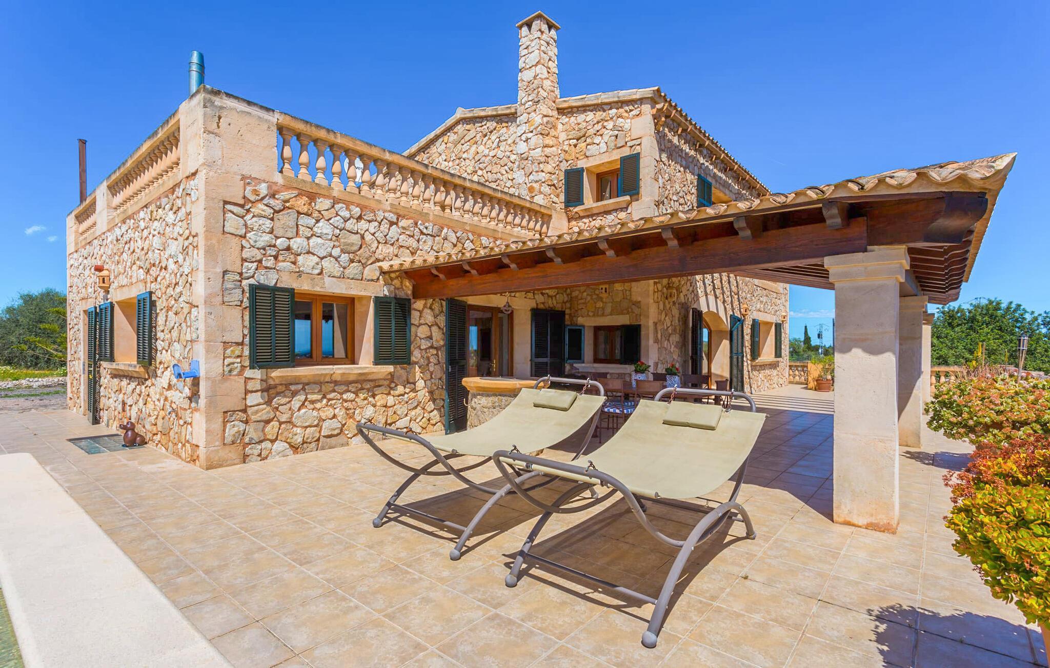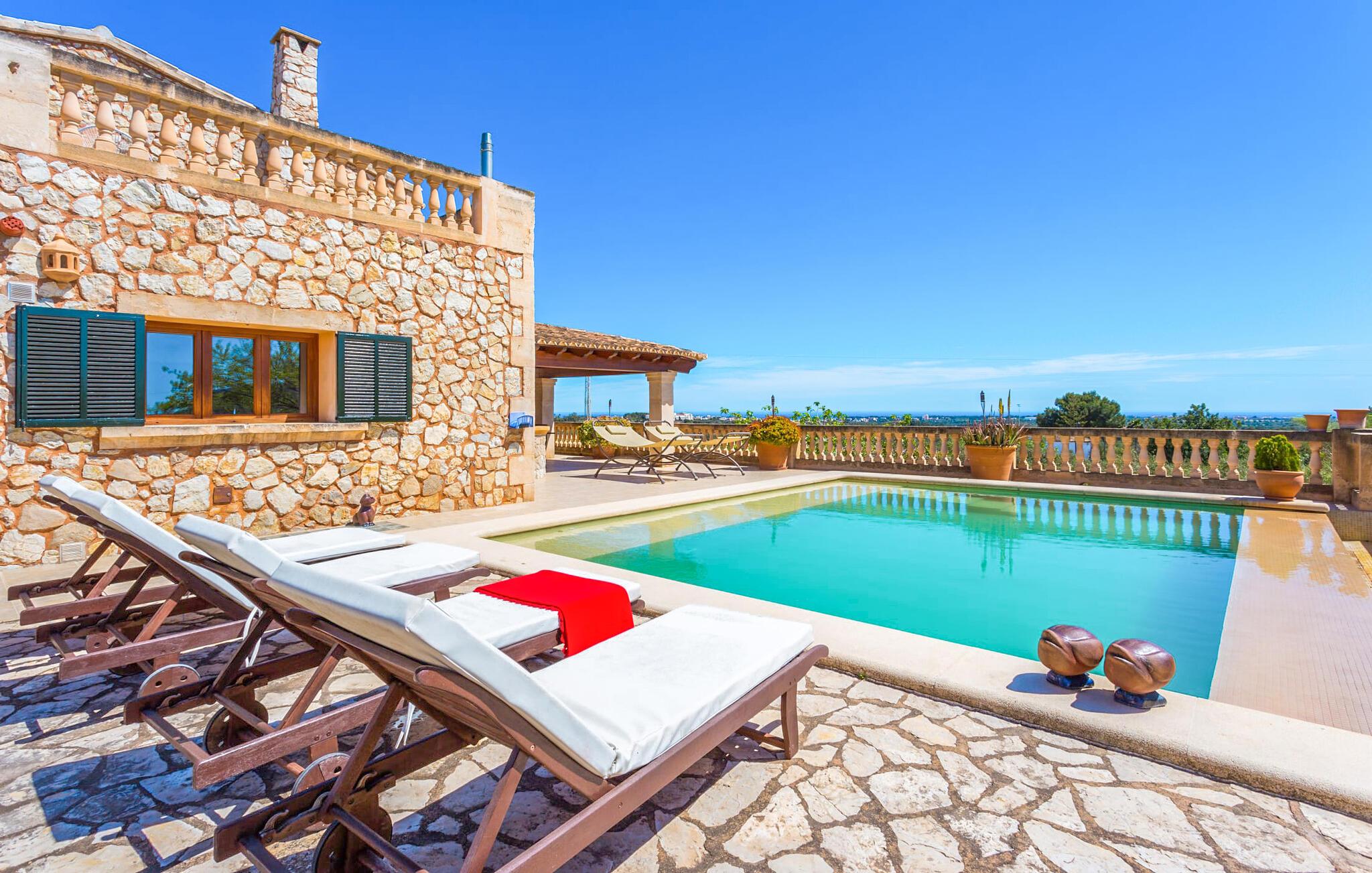 Det moderne feriehus "Son Ropit" med en smuk stenfacade har en høj beliggenhed på en lille bakke i det landlige lavland nær Mallorcas østkyst. Huset, poolområdet og terrasserne er velsignet med en vidunderlig udsigt over landskabet nær Portocristo og ud til havet. Den rummelige finca til 6 personer er omgivet af velholdt ejendom med den mest typiske vegetation på øen. jeres private indkørsel løber gennem midten og ender i en parkeringsplads til flere biler bag huset. Til siden af huset er der en skøn, forhøjet, sydøstvendt solterrasse. Her indbyder komfortable liggestole og en stor, lavvandet pool til solbadning i timevis. En rummelig overdækket terrasse med en mobil grill er tilgængelig for afslappende lurer og omgængelige måltider i skyggen. I vil nyde dette hyggelige, oplyste sted, især på varme sommernætter. Interiøret i "Son Ropit" er lyst og venligt. Et elegant indgangsparti leder ind til en sommerlig indrettet stue. En bred glasdør giver nem adgang til den overdækkede terrasse. Lige ved siden af: et veludstyret køkken, hvor I kan forfine jeres morgenmad med frisk blandet frugtjuice. Spisepladsen med pejs er integreret i køkkenet. Også i stueetagen er der et komfortabelt soveværelse med dobbeltseng og et separat badeværelse med badekar. Trappen ved indgangen fører op til øverste etage. Det rummer yderligere to soveværelser med dobbeltsenge, hvoraf det ene har udgang til en stor overdækket terrasse med sensationel udsigt. På dette niveau er der også to individuelle badeværelser med badekar og en anden solterrasse med udsigt over poolen. Til selskabelige aftener finder I et godt udvalg af brætspil. Feriehuset ligger cirka 10 minutters kørsel fra Manacor og det livlige feriested Portocristo. Begge byer byder på gode indkøbsmuligheder. De smukke sandstrande i Cala Millor, Cala Mendia, S'Illot og Sa Coma ligger cirka 12 minutter væk i bil.