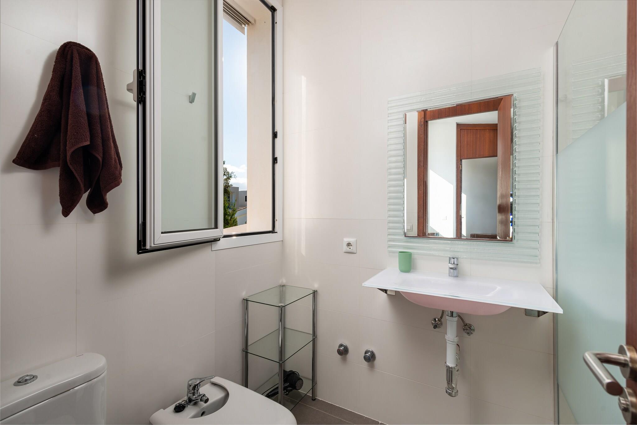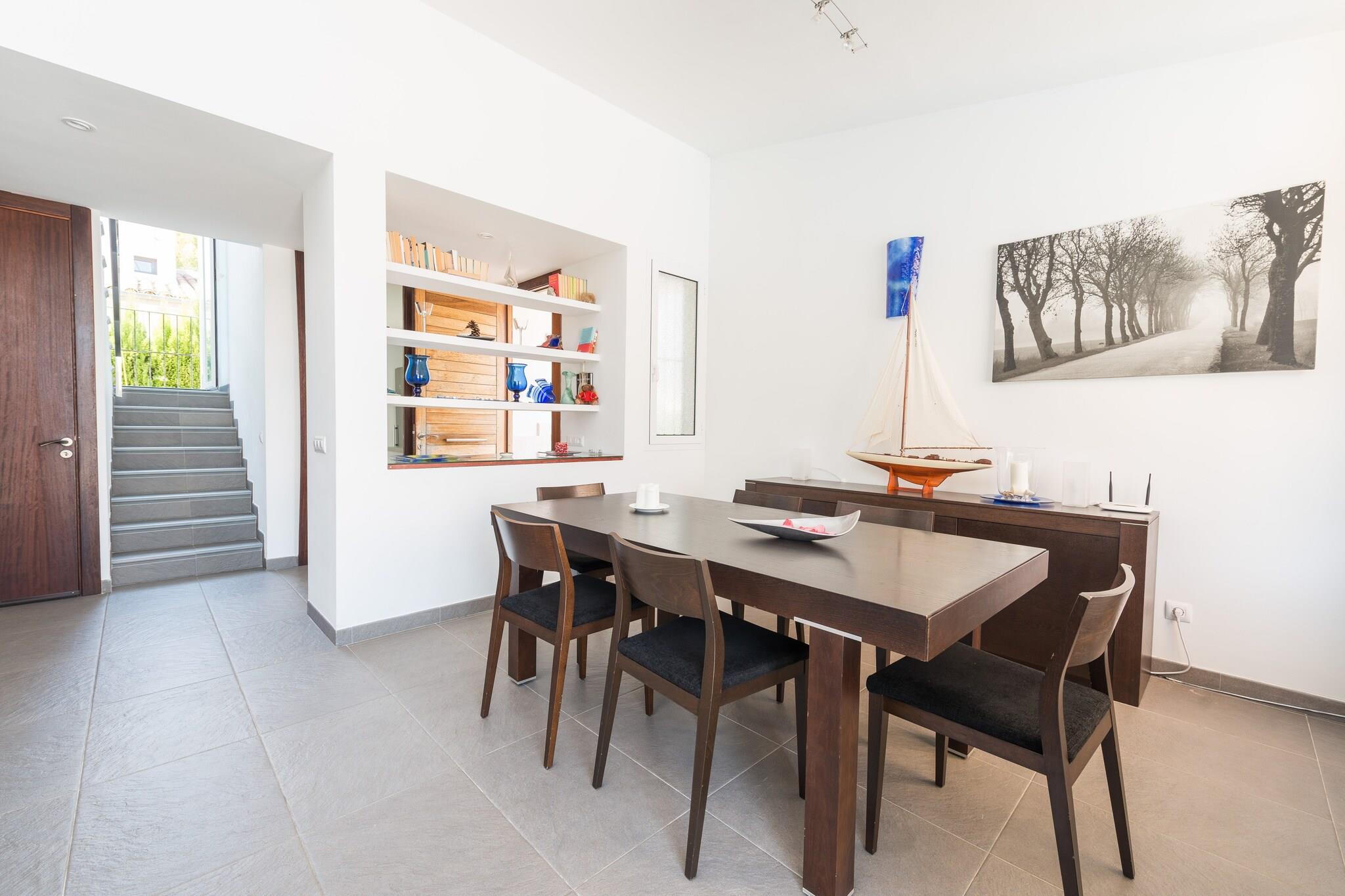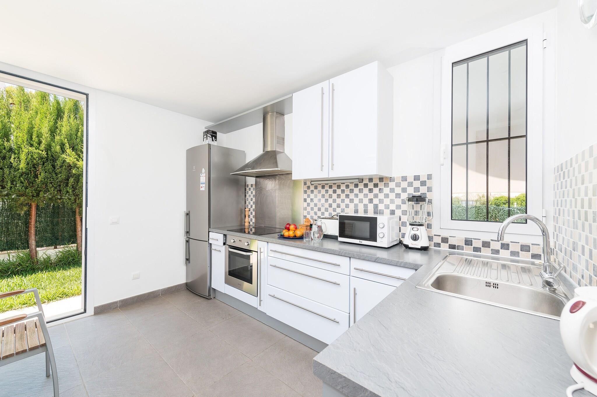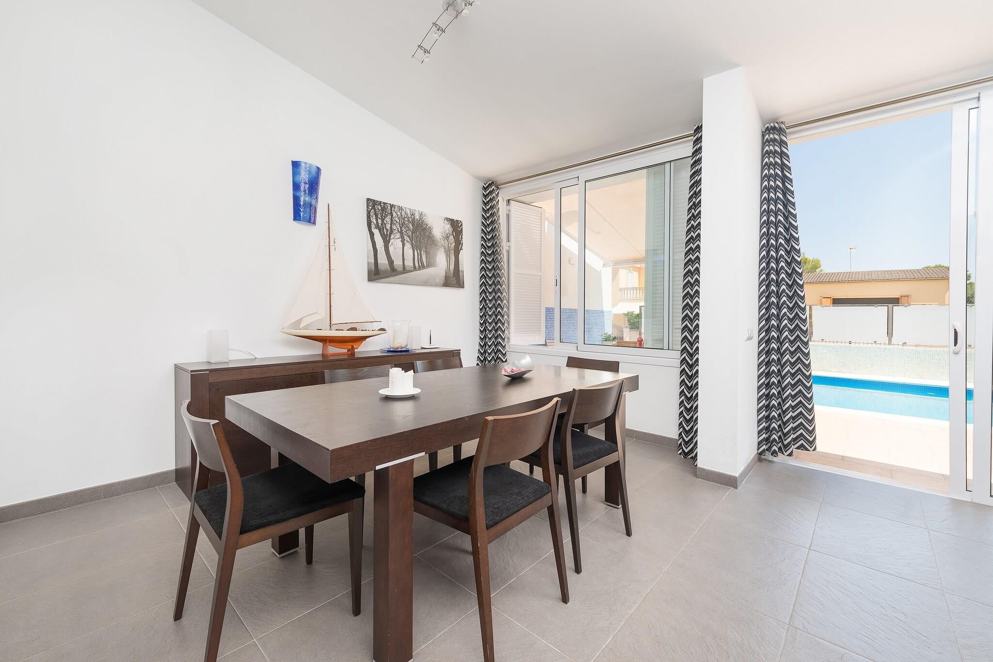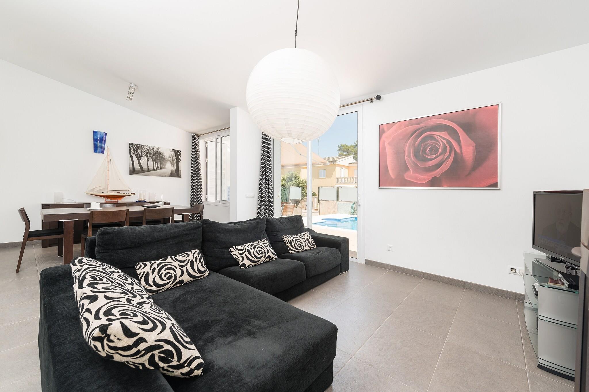Denne charmerende villa tilbyder et hyggeligt tilflugtssted for op til seks gæster, med tre velindrettede soveværelser og to badeværelser. Soveværelset i stueetagen, der er udstyret med en dobbeltseng, giver direkte adgang til haven, mens de to soveværelser ovenpå omfatter endnu en dobbeltseng og en køjeseng, der kan rumme både voksne og børn komfortabelt. Opholdsstuen er designet til afslapning og byder på aircondition, en hyggelig sofa, et spisebord til seks og et fjernsyn med spanske og tyske kanaler, suppleret med en pejs til køligere aftener. Beliggende i en rolig beliggenhed, ejendommen kan prale af en indhegnet grund med en 50 m² have og en rummelig 32 m² terrasse, ideel til udendørs spisning. Saltvandspoolen, der måler 6 x 4 meter, er perfekt til solbadning og svømning, med fire liggestole til rådighed for din komfort. En mobil grill er til rådighed til udendørs spisning, hvilket skaber et vidunderligt sted at nyde måltider udendørs. Villaen opererer på solenergi, hvilket forbedrer dens miljøvenlige appel. Det uafhængige køkken er fuldt udstyret med alle nødvendige apparater til et problemfrit ophold, herunder en vaskemaskine, strygejern og strygebræt. Gæsterne vil sætte pris på de to badeværelser, der hver har en bruser, hvilket giver bekvemmelighed på tværs af villaens begge niveauer. Ejendommen ligger i Son Serra de Marina og tilbyder fredelige omgivelser, mens de stadig er inden for rækkevidde af lokale faciliteter og attraktioner. Som reaktion på Coronavirus (COVID-19) er yderligere sikkerheds- og sanitære foranstaltninger i kraft på denne ejendom.