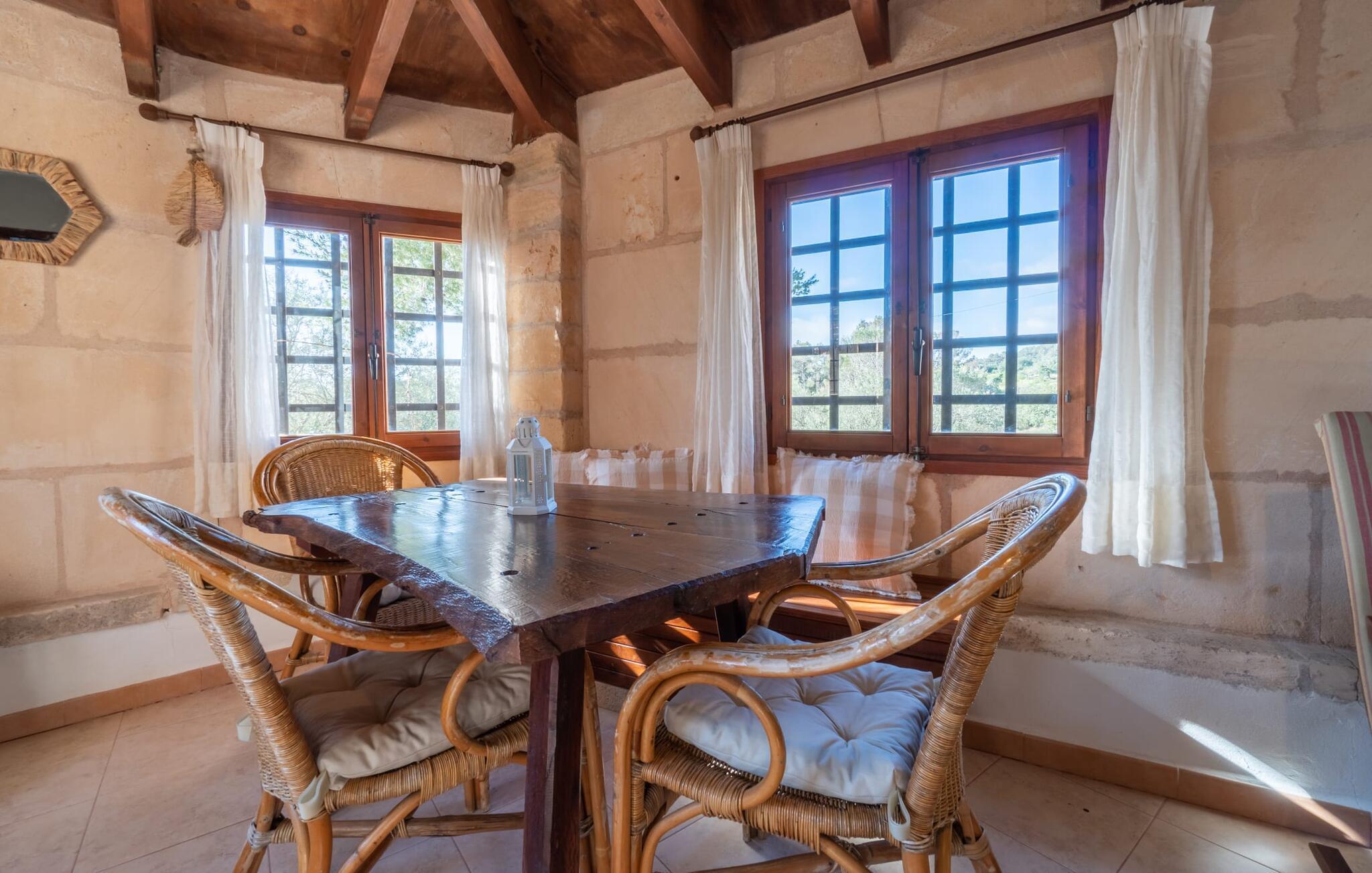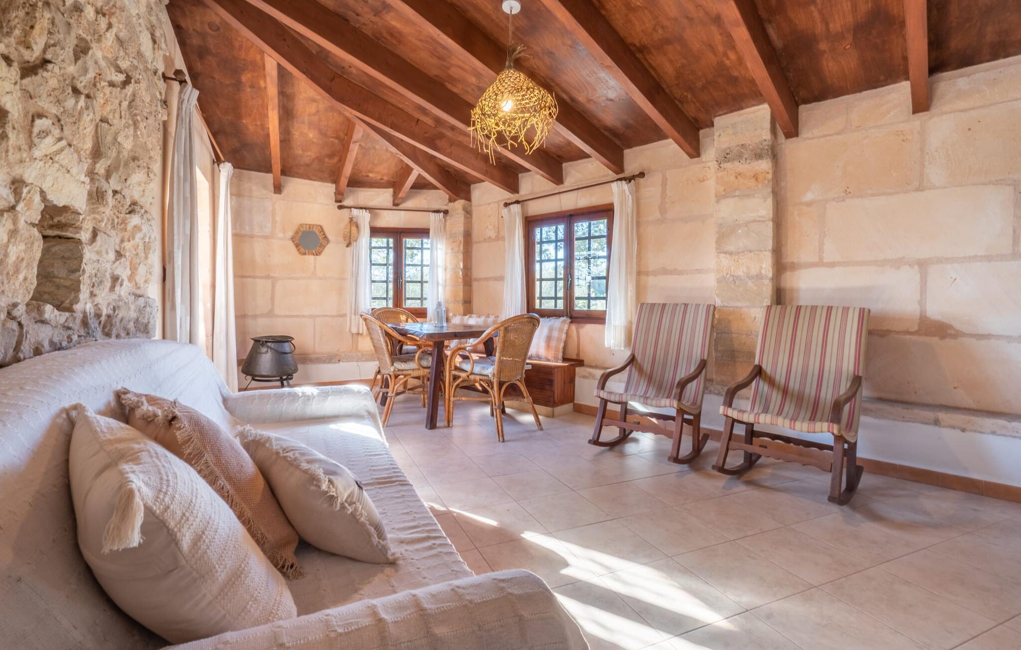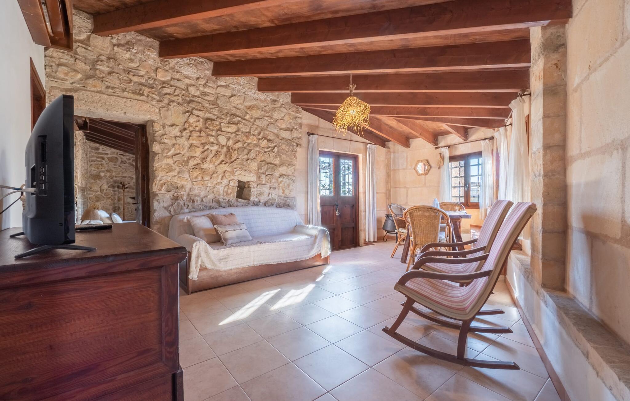 Lejligheden "Es Colomé" er beliggende i den charmerende agroturismo "Son Torrat", nær Petra i hjertet af Mallorca. Denne ejendom har smukt rustikke naturstensbygninger på en bjergskråning omgivet af frodige middelhavslandskaber, herunder sin egen frugthave. Gæsterne har plads nok til afslappede gåture eller kan nyde sportsaktiviteter som bordtennis og volleyball på hotellets egen bane. Den fælles pool med liggestole og parasoller tilbyder et forfriskende tilflugtssted, mens en separat babypool henvender sig til yngre gæster. Et iøjnefaldende træk er spabadet, der er beliggende i en stenhule, der minder om en romantisk grotte. jeres lejlighed har en privat solterrasse med spisemøbler, hvilket bidrager til den hyggelige atmosfære. Indretningen afspejler ejendommens rustikke charme, med ru pudsede vægge, naturstensaccenter og klassiske møbler, der skaber en harmonisk landlig atmosfære. Layoutet er praktisk, med alle bekvemmeligheder på ét plan, herunder en stue og spisestue med en komfortabel sofa og spisebord, et lille køkken, to soveværelser med dobbeltsenge og to badeværelser. En off-road lejebil anbefales for at få adgang til agroturismo. Hvis I elsker fred og natur og sætter pris på smukke landskaber, så er I kommet til det rette sted. Den smukt rustikke ferielejlighed "Es Colomé" ligger i absolut fred og ro på en blid skråning i den smukke natur i centrum af øen. Middelalderbyen Petra, som er særligt kendt for sine regionalt dyrkede vine Cabernet Sauvignon, Chardonnay. og Merlot, kan nås efter 4, 2 km, mens den nærmeste strand ligger 20 km væk.