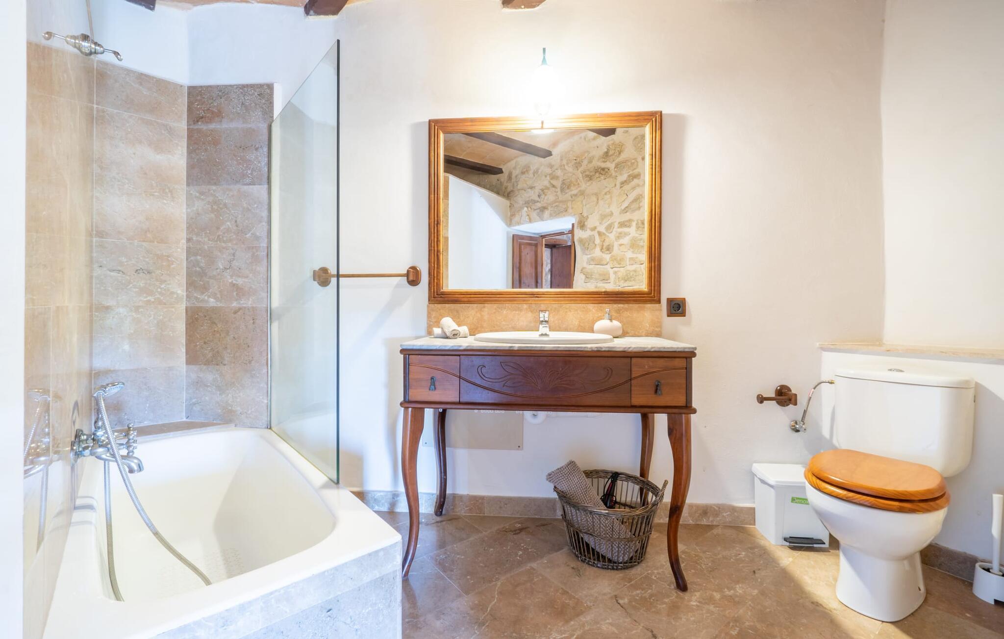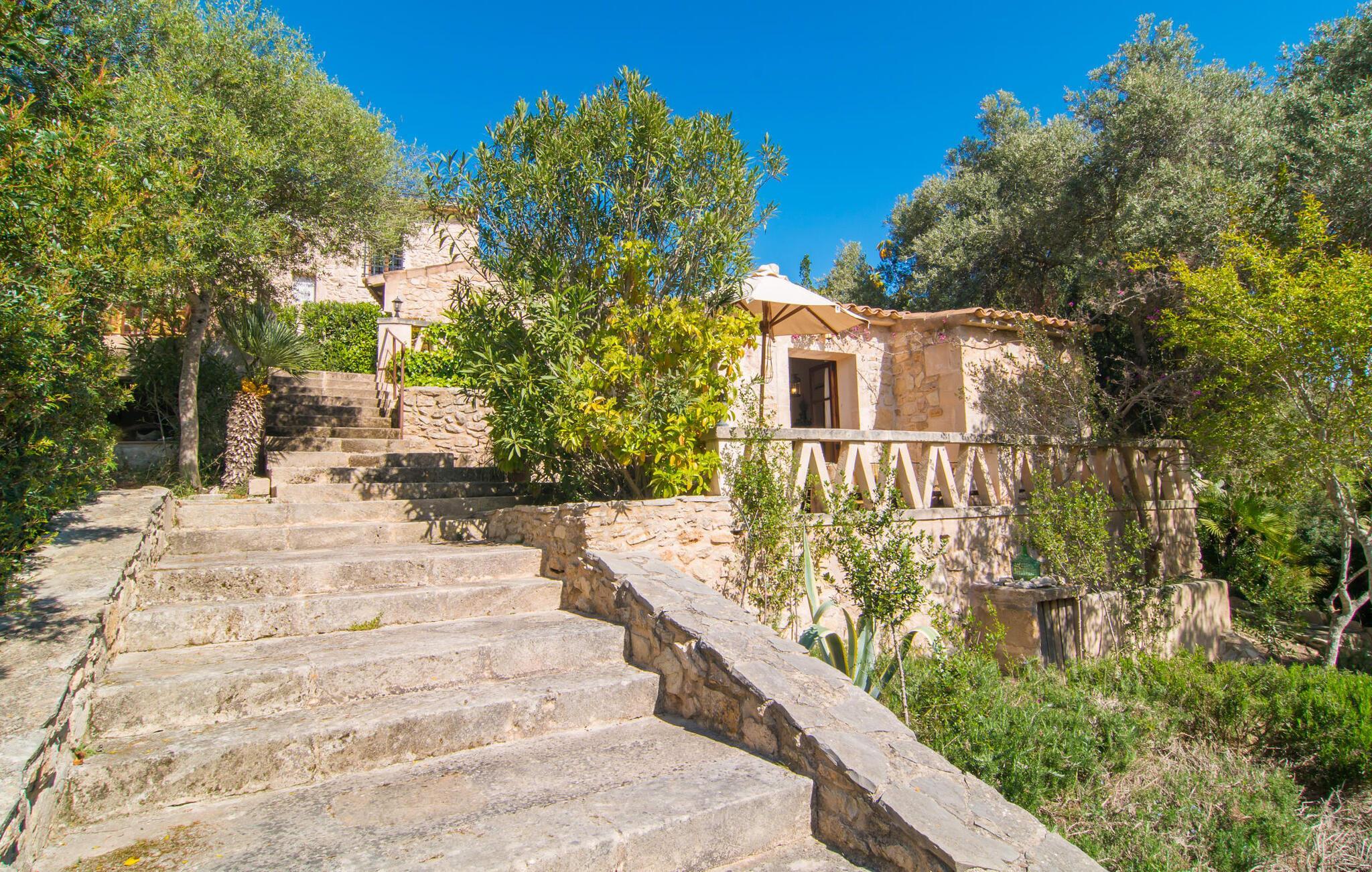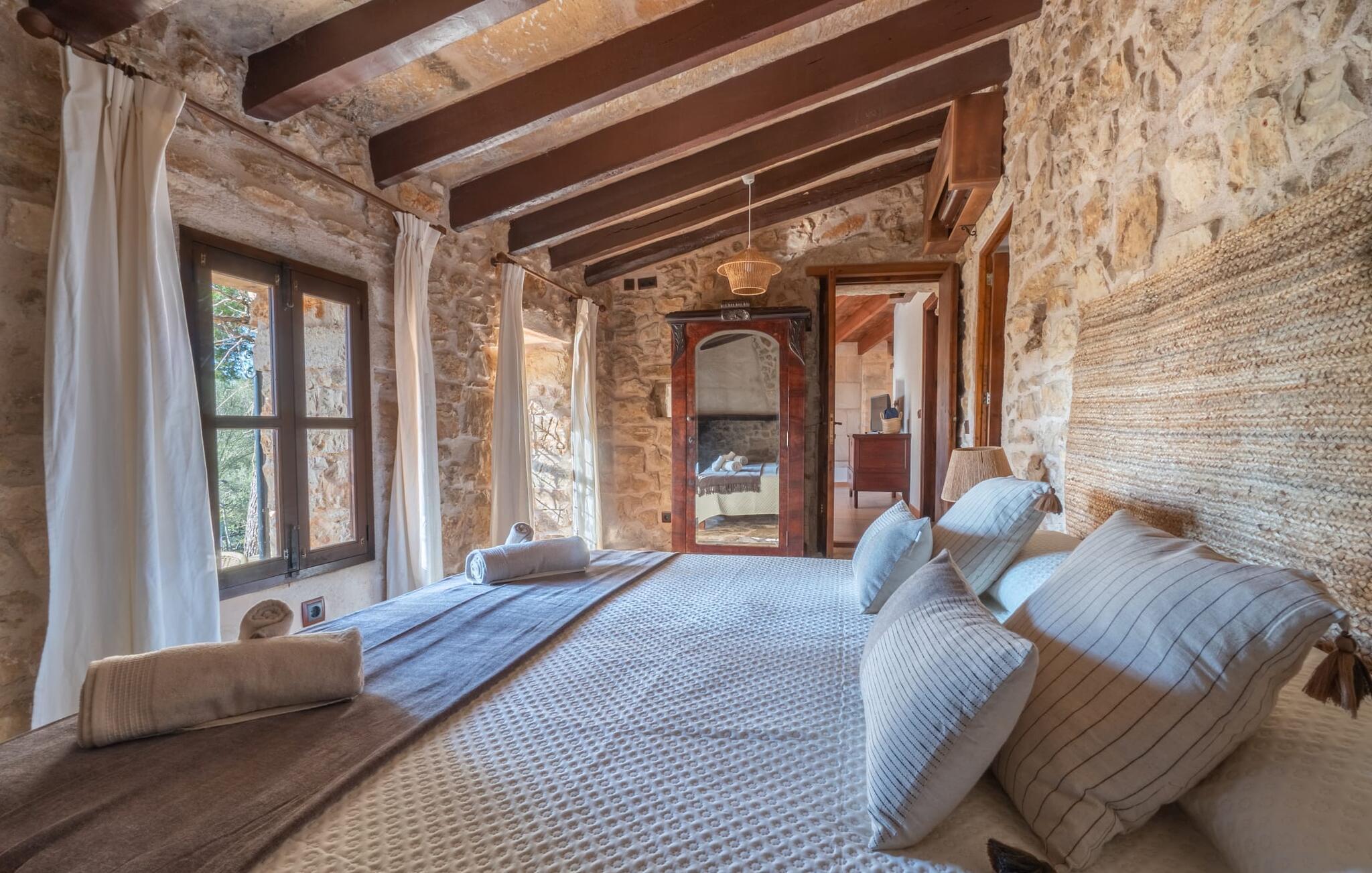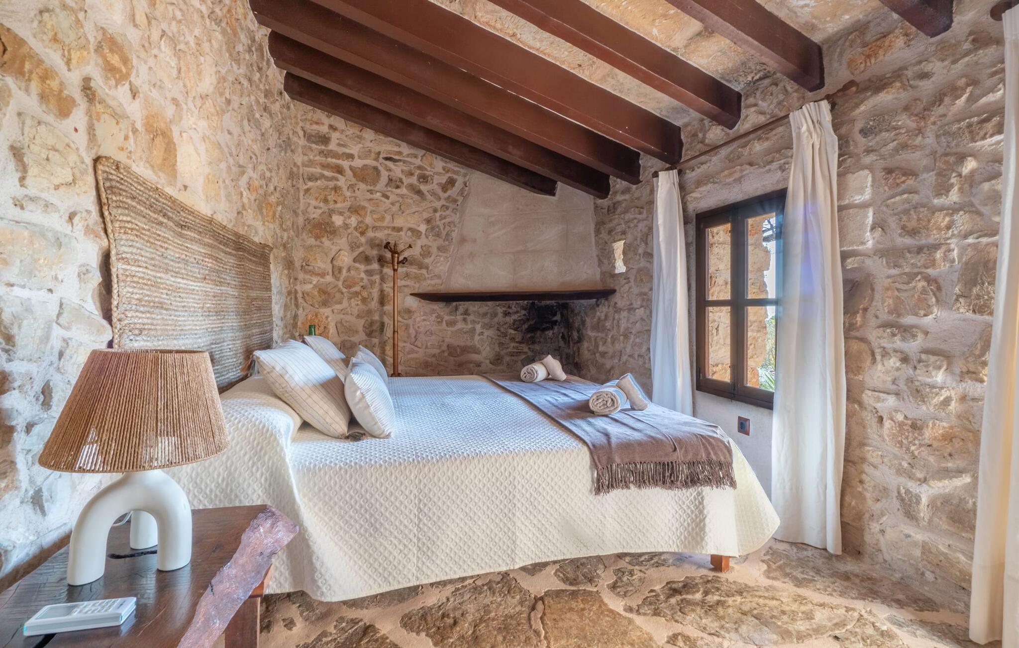 Lejligheden "Es Colomé" er beliggende i den charmerende agroturismo "Son Torrat", nær Petra i hjertet af Mallorca. Denne ejendom har smukt rustikke naturstensbygninger på en bjergskråning omgivet af frodige middelhavslandskaber, herunder sin egen frugthave. Gæsterne har plads nok til afslappede gåture eller kan nyde sportsaktiviteter som bordtennis og volleyball på hotellets egen bane. Den fælles pool med liggestole og parasoller tilbyder et forfriskende tilflugtssted, mens en separat babypool henvender sig til yngre gæster. Et iøjnefaldende træk er spabadet, der er beliggende i en stenhule, der minder om en romantisk grotte. jeres lejlighed har en privat solterrasse med spisemøbler, hvilket bidrager til den hyggelige atmosfære. Indretningen afspejler ejendommens rustikke charme, med ru pudsede vægge, naturstensaccenter og klassiske møbler, der skaber en harmonisk landlig atmosfære. Layoutet er praktisk, med alle bekvemmeligheder på ét plan, herunder en stue og spisestue med en komfortabel sofa og spisebord, et lille køkken, to soveværelser med dobbeltsenge og to badeværelser. En off-road lejebil anbefales for at få adgang til agroturismo. Hvis I elsker fred og natur og sætter pris på smukke landskaber, så er I kommet til det rette sted. Den smukt rustikke ferielejlighed "Es Colomé" ligger i absolut fred og ro på en blid skråning i den smukke natur i centrum af øen. Middelalderbyen Petra, som er særligt kendt for sine regionalt dyrkede vine Cabernet Sauvignon, Chardonnay. og Merlot, kan nås efter 4, 2 km, mens den nærmeste strand ligger 20 km væk.