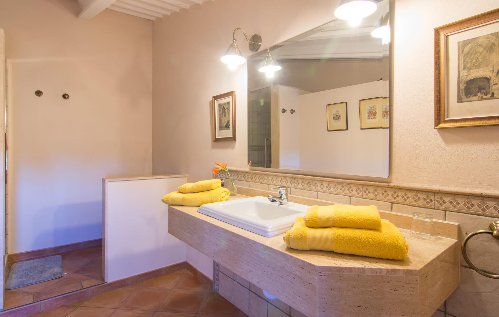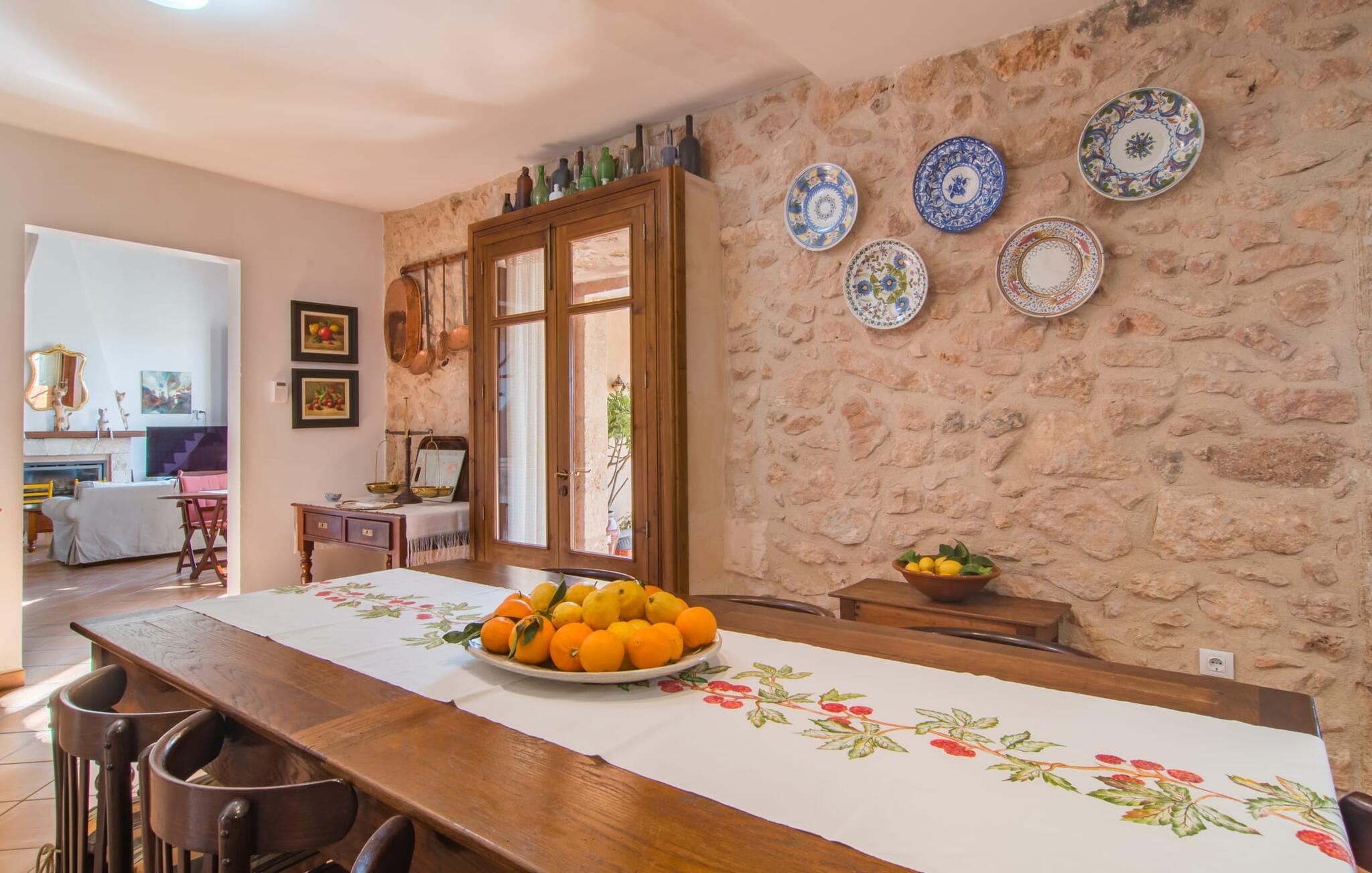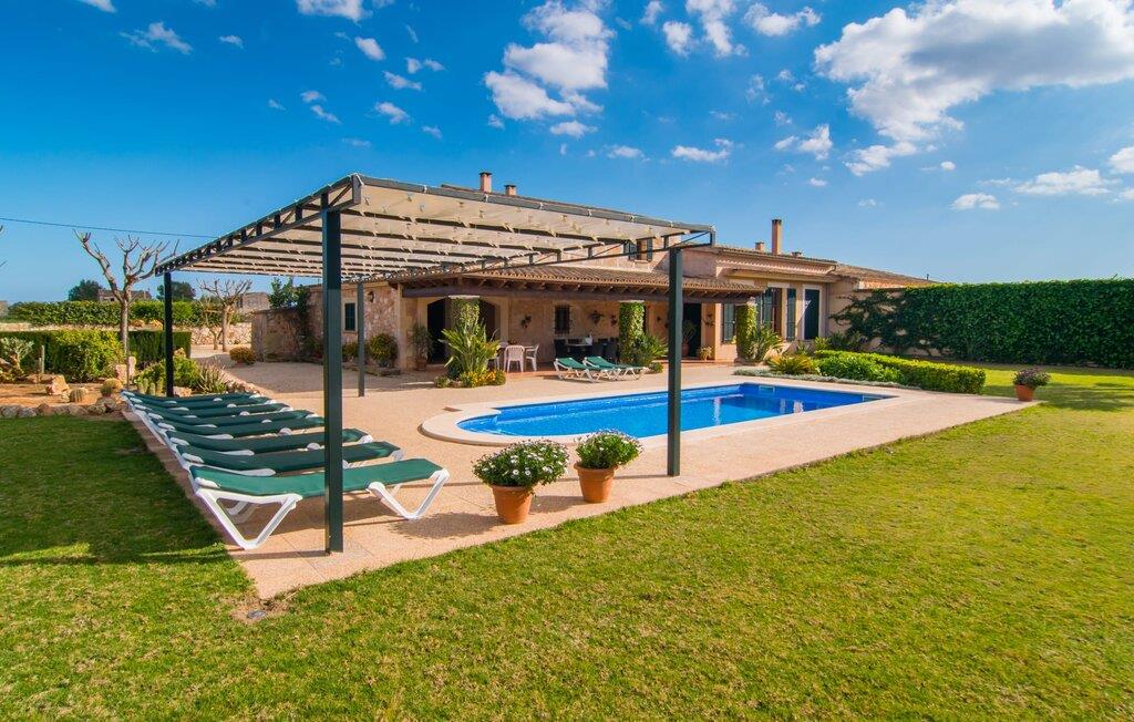 Beliggende i en rolig, landlig beliggenhed nær Campos, tilbyder den familievenlige, rustikke villa "Son Vanrell" et idyllisk tilflugtssted. Omgivet af smukt anlagte haver med duftende blomster, rummelige græsplæner og majestætiske palmer, tilbyder det det perfekte sted for børn at lege. Gæsterne kan nyde den mosaikbelagte pool med romerske trin, slappe af på liggestole i haven under en baldakin eller nyde en forfriskende drink. Villaen giver mulighed for en individuel ferieoplevelse med et udekøkken med indbygget ovn til grillning og et naturstensbord på verandaen til udendørs spisning. Indenfor er den mallorcanske landhusstil tydelig i den rummelige, solbeskinnede stue og spisestue med højt til loftet, terracotta, træ og stenbrud. Spise-i køkkenet byder på alt hvad I behøver for en afslappende ferie. To af de fem soveværelser er i stueetagen, og alle fem har aircondition. Fire badeværelser er en-suite, hvilket giver bekvemmelighed for større grupper. Hvert soveværelse byder på en betagende udsigt over den omkringliggende natur, hvilket sætter scenen for uforglemmelige udflugter. Den traditionelle villa "Son Vanrell" med middelhavshave ligger sydøst for Campos, mod Santanyí, i en utrolig smuk beliggenhed. Campos er kun fem minutter væk i bil. I kan handle her - torsdage og lørdage kan I benytte jer af det ugentlige marked. Gå sydpå, og I vil finde nogle smukke kystbyer. Fjordlignende strande som Cala Santanyí og den absolutte drømmestrand Es Trenc er let tilgængelige med lejebil. Valgfri brug af aircondition vil blive opkrævet kontant på stedet.