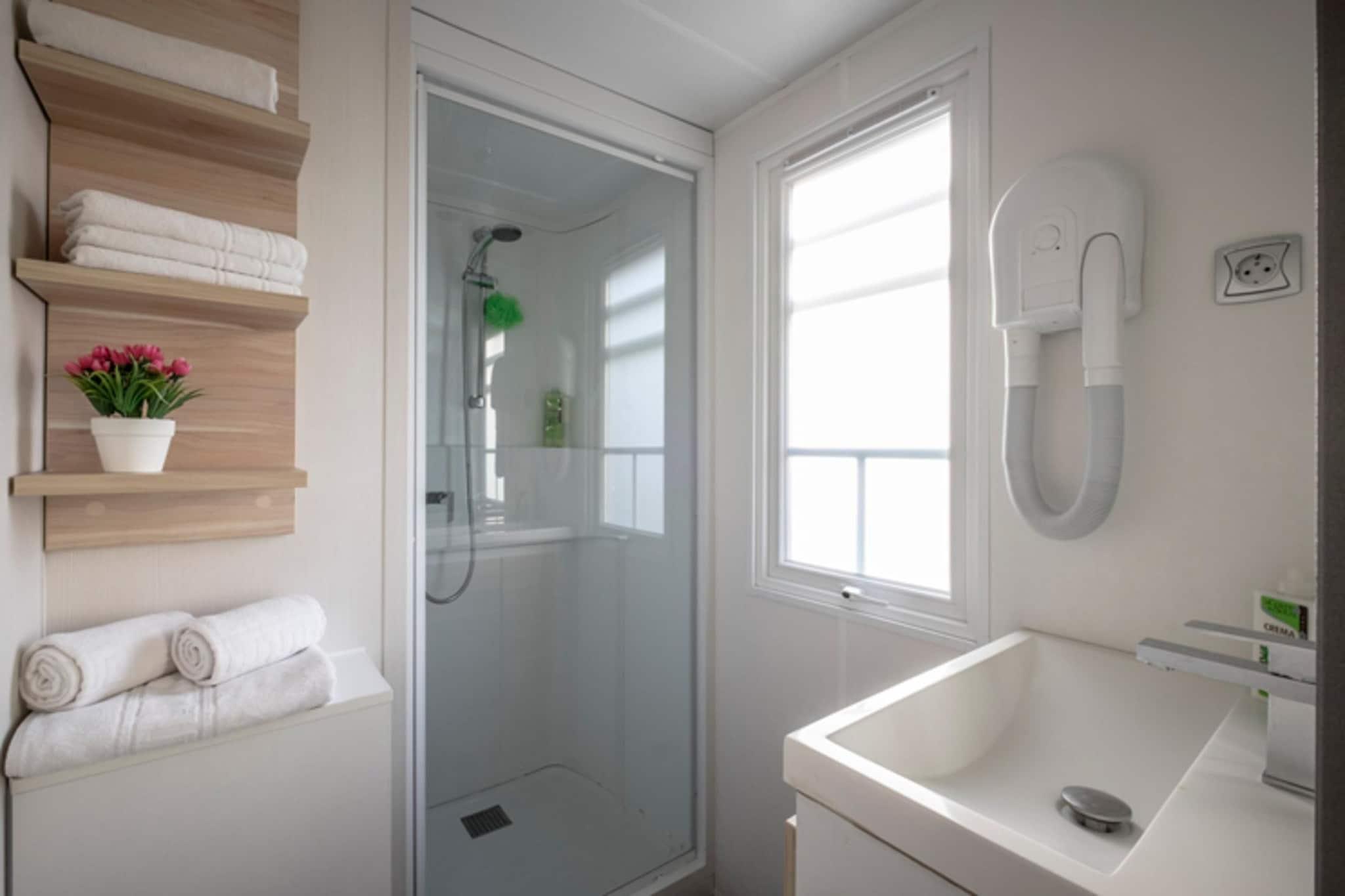 Stueetage: (Stue(enkeltsovesofa, Fjernsyn, sofahjørne), Køkken(kaffemaskine, mikrobølgeovn, køleskab), soveværelse(dobbeltseng), soveværelse(enkeltseng, enkeltseng), badeværelse(bruser, håndvask, toilet), Internetadgang) varme, klimaanlæg, terrasse, havemøbler, parkering
