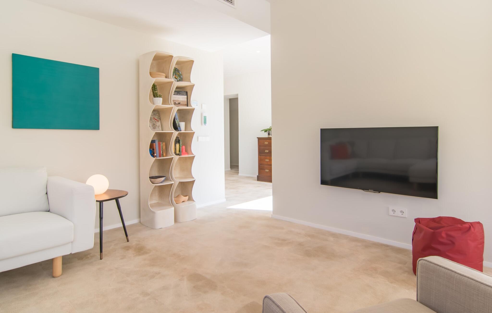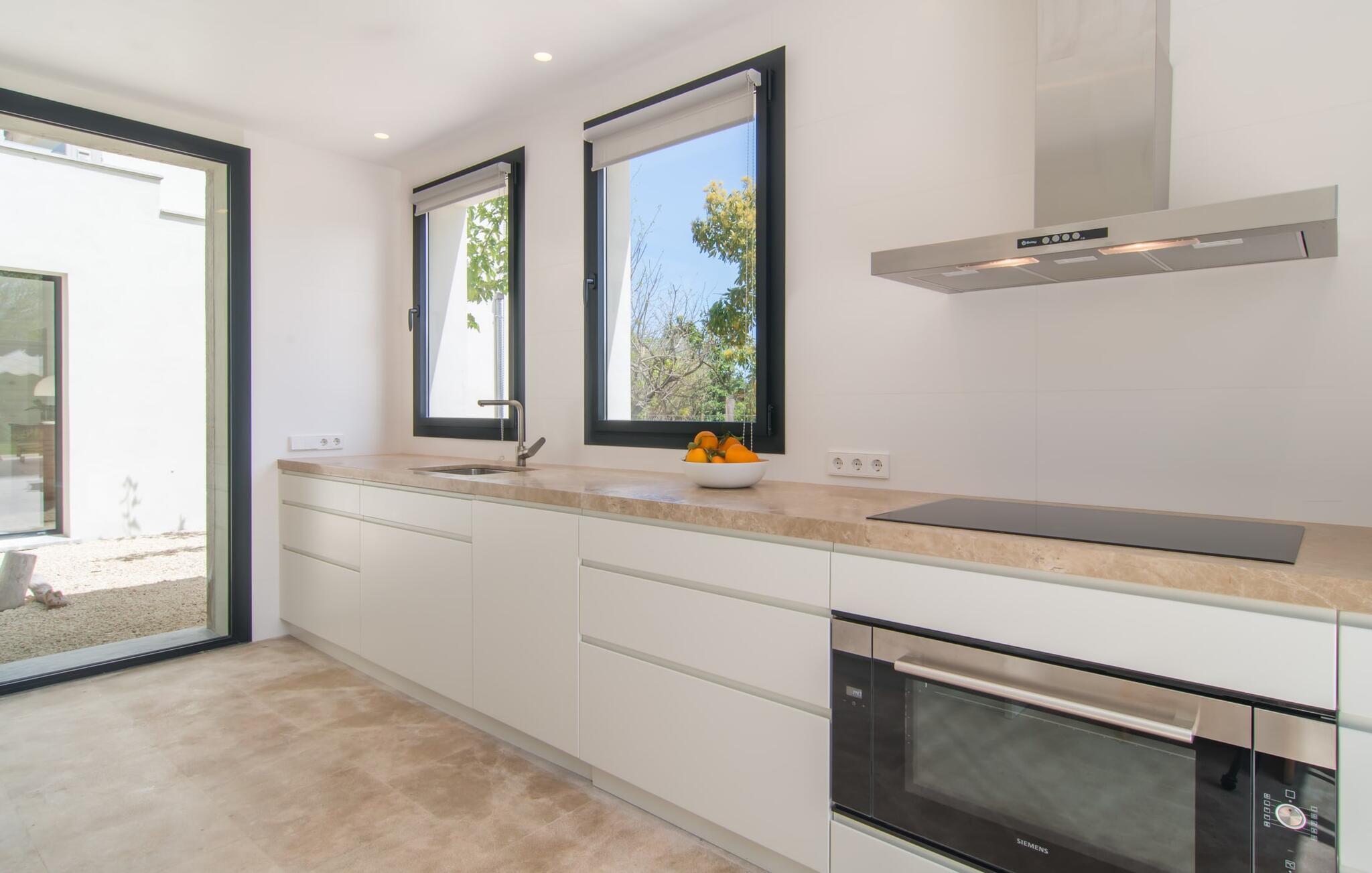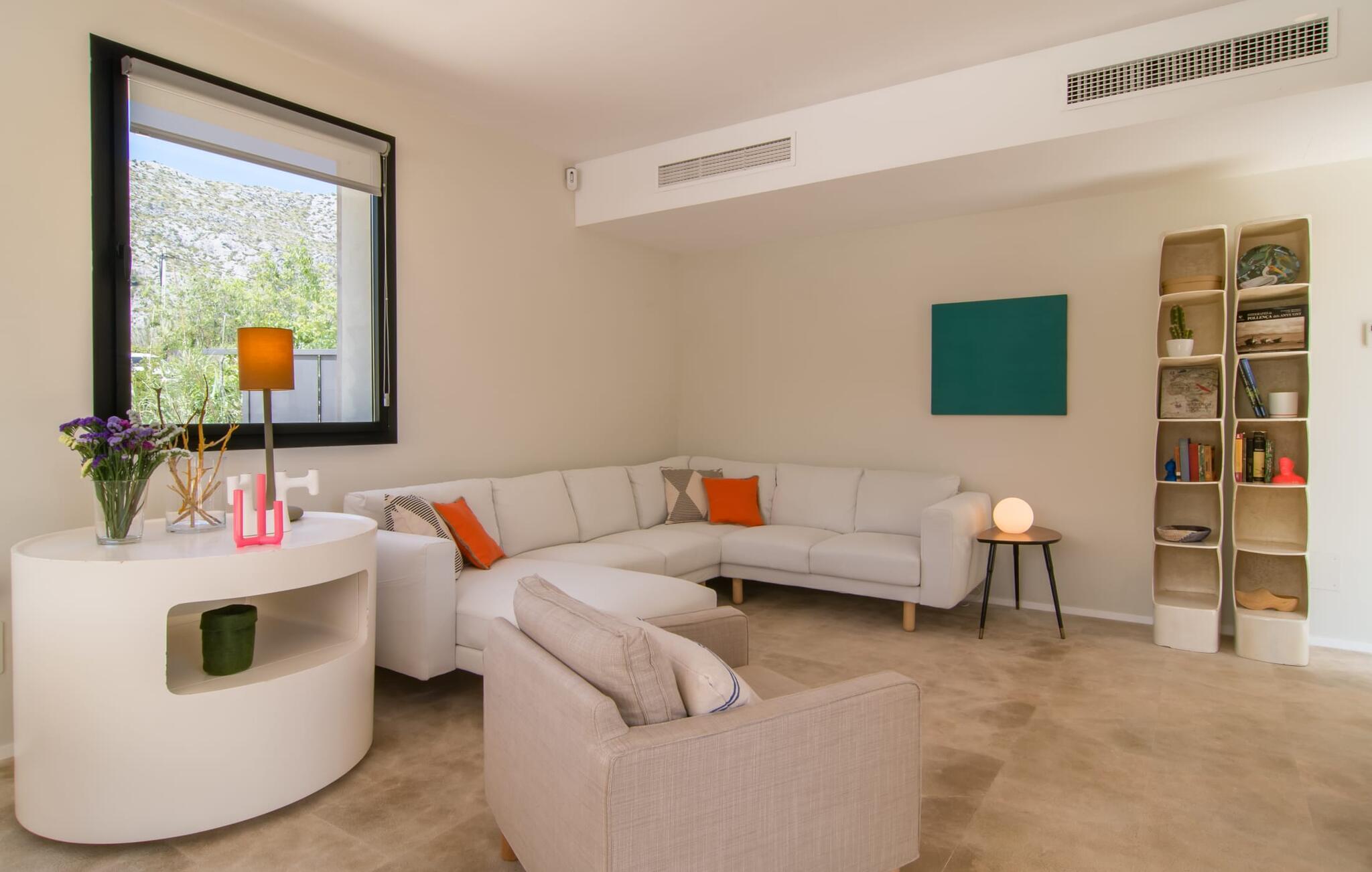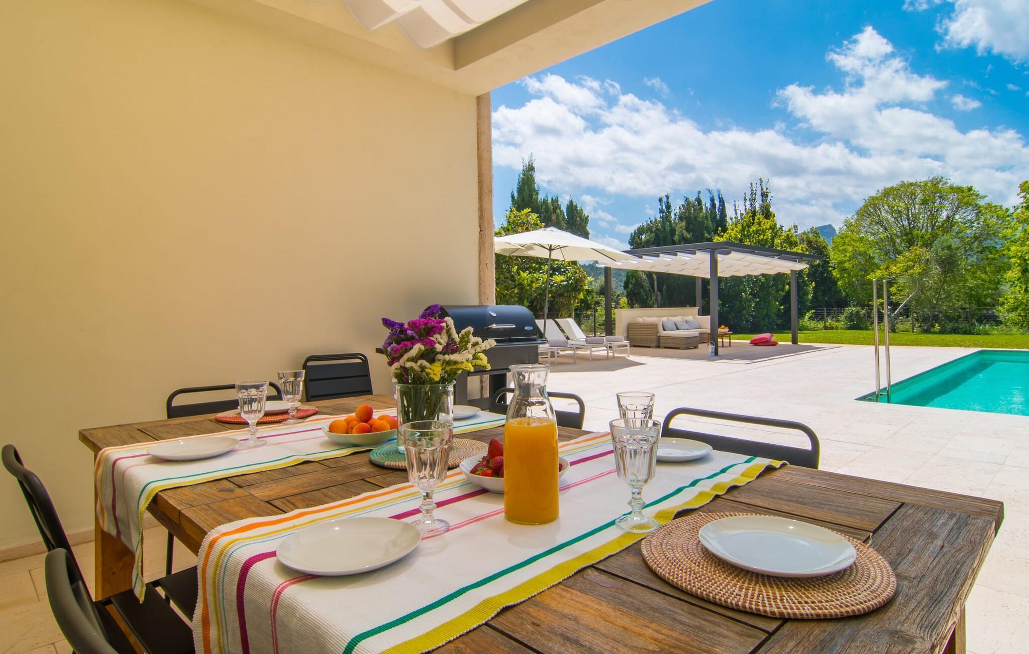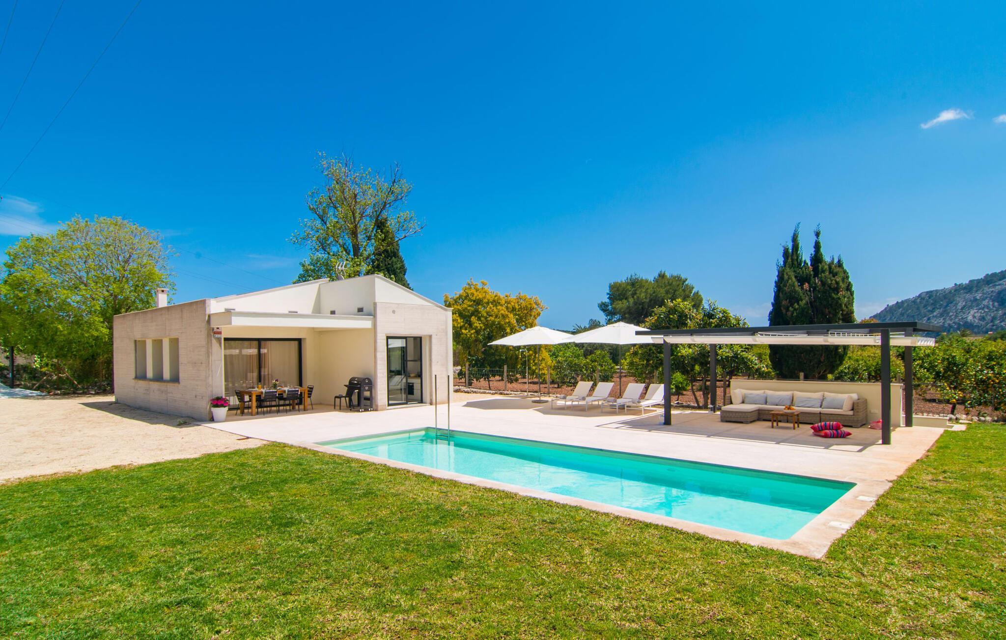 Beliggende på de nordlige foden af Tramuntana-bjergene, lige uden for Pollença, kombinerer villaen "Ternelles" æstetisk, moderne design med den rolige originalitet af det omkringliggende landskab og ægtheden af den nærliggende by, som bevarer sine mallorcanske rødder som ingen anden på øen har øen. Når man ankommer fra lufthavnen, tilbyder en stor grusparkeringsplads nok plads til lejebiler. Lige bagved er der en rummelig græsplæne, der inviterer til leg og løb. Blot et par skridt videre inviterer en pool dig til at tage en afslappet dukkert i det kølige vand og byder på en kølende forfriskning. Med en længde på 10 m giver det også mere ambitiøse svømmere mulighed for at svømme længder her. Hvis du bare vil slappe af, er der et skyggefuldt sted med overdækkede chill-out-møbler lige ved siden af. Solbadere har flere komfortable liggestole til rådighed, ideelle til solbadning. For at undgå solskoldning er der også to skyggegivende parasoller til rådighed. Det fantastiske udeareal direkte ved huset byder desuden på en overdækket terrasse med en skøn spiseplads og en mobil grill. Her vil hvert måltid i villaen være en sand fornøjelse. Dette er et Fincallorca feriehus. Interiøret i den moderne villa imponerer med en trendy og minimalistisk stil. De hvide vægge og lofter samt de lyse gulvfliser danner en stilfuld kontrast til de mørke vinduesrammer og den nænsomt udvalgte indretning. Villaen er opdelt i to dele af bygningen, som er forbundet af indgangspartiet og takket være de store vinduesfronter slipper en del mallorcansk sol ind. Det en-etagers område ud mod poolen rummer den rummelige opholds- og spisestue med et stilfuldt sofasæt, et fladskærms-tv og en spiseplads. Subtile farver og smart design præger også dette rum. Lige rundt om hjørnet finder du det lyse køkken, som vil glæde dig med hårde hvidevarer af høj kvalitet samt en fantastisk udsigt over det omkringliggende område og direkte udgang til poolterrassen. Den bagerste bygning har to etager og rummer soveværelserne. I stueetagen finder du et lækkert badeværelse og to skønne soveværelser med hver to enkeltsenge og rummelige skabe. Ovenpå tårner det absolut seje master bedroom sig over alt. En hyggelig dobbeltseng i midten er indrammet af et walk-in-closet og et en-suite badeværelse med et næsten fritstående badekar, kun adskilt af en glasfront. Villaen har en rolig beliggenhed på landet nær Pollença. Det er nemt at komme rundt takket være den panoramiske MA-10-vej langs vestkysten og gennem Tramuntana-bjergene, samt MA-13-motorvejen, der fører dig til Palma og lufthavnen. Pollenças højdepunkter, såsom den berømte Golgata, den gamle romerske bro og museer og gallerier, er alle inden for gåafstand. Regionens kulinariske tilbud er også værd at prøve og tilbyder udover det traditionelle mallorcanske køkken også varierede retter. For vandreentusiaster er den nærliggende GR 221 vandresti ("Dry Stone Wall Route") blot en af mange muligheder på den nordlige del af øen. Cykelentusiaster kan prøve at mestre kurverne på vej til Cap Formentor. Sidst men ikke mindst er havet med sine fantastiske strande og bugter kun 15 minutter væk i bil. Villa "Ternelles": En drøm! Den moderne villa "Ternelles" ligger kun 20 minutters gang fra markedspladsen i den charmerende by Pollença. Talrige indkøbsmuligheder og andre faciliteter til at bo i villaen er tilgængelige for dig i og omkring byen. Travlheden på det stadig autentiske ugentlige marked med dets omfattende udvalg af lækre regionale produkter er let at nå, og du behøver ikke at bekymre dig om parkeringspladser. Der er lange sandstrande ved Pollença-bugten, små drømmende bugter nær Cala Sant Vicenç, begge omkring 15 minutter fra huset.