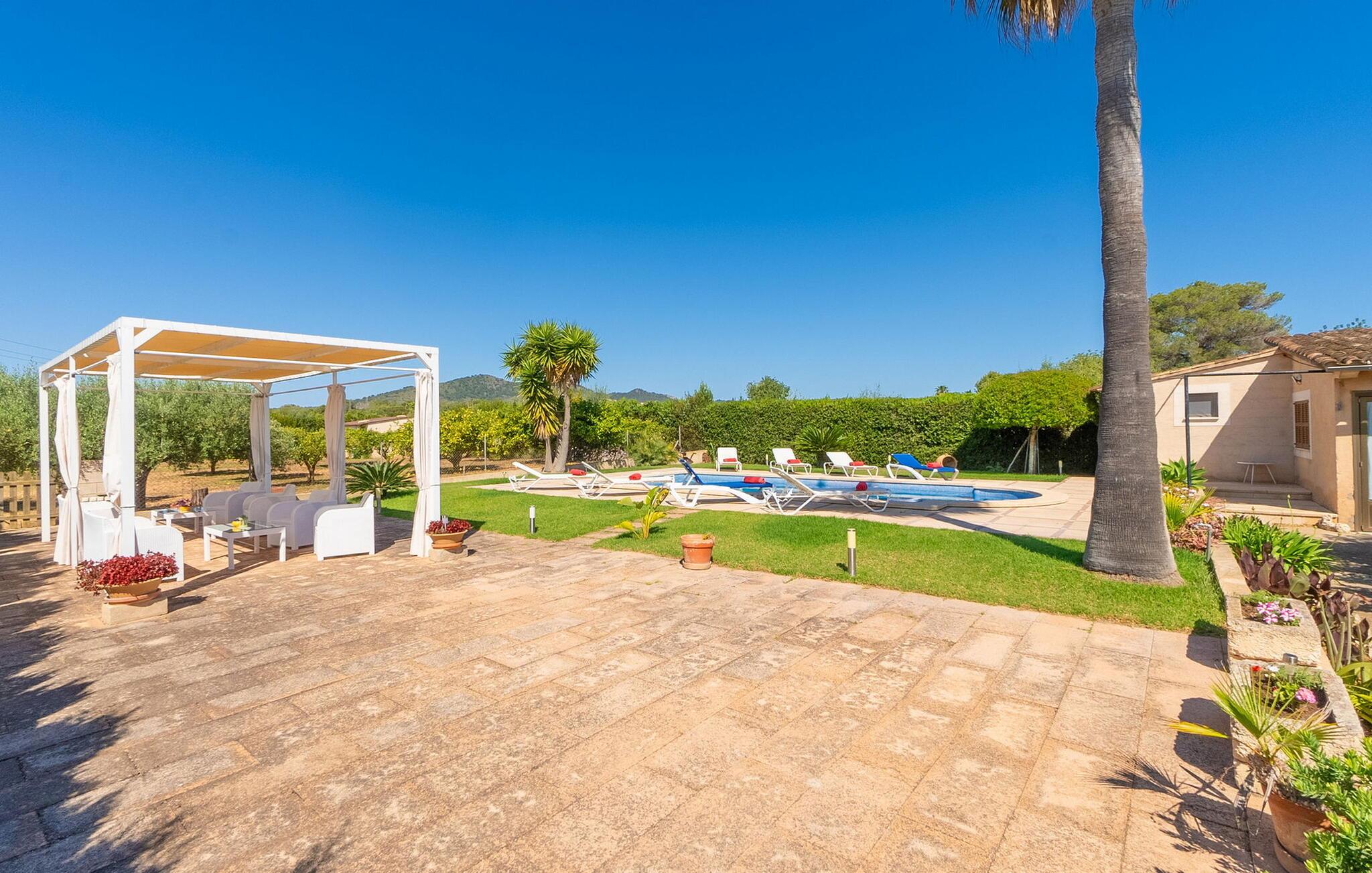 Hvis I leder efter en afslappende, afslappende villaferie på Mallorca og ønsker både en hyggelig atmosfære og virkelig fremragende værdi for pengene, så vil denne villa helt sikkert varme jeres hjerte. Ejerne har formået at kombinere moderne og traditionelle elementer både indendørs og udendørs på en indbydende måde, hvilket skaber et behageligt ophold med typisk mallorcinsk karakter. Når man ankommer til den smukke ejendom, kommer denne originale effekt tydeligt frem i huset, der trods sin nyere opførelse har en klassisk naturstensfacade. I får straks lyst til at slappe af på den rummelige terrasse foran, som fører til poolområdet kun få meter væk. Begge områder er udstyret med nok udendørs møbler, så alt hvad I behøver er jeres yndlings kølige drink i hånden. Men at sidde udenfor slutter ikke der, da yderligere tilstødende terrasser strækker sig over 100 m². Dette landskab er delvist overdækket og byder på masser af skygge omkring villaen. Det er også omgivet af en velholdt have med mange træer og mange middelhavsplanter. Hele ejendommen er vidunderligt indlejret i det helt fantastiske bakkelandskab omkring Son Servera. Et særligt højdepunkt ved siden af poolen er et kæmpe udendørs grillområde, hvor I kan grille når som helst om aftenen. Det udendørs badeværelse er også meget praktisk. I behøver ikke gå rundt i huset med våde fødder efter svømning. Villaens indretning har en stor stue med et hyggeligt opholdsområde ved den åbne pejs og en spiseplads. Opholdsstuen er også udstyret med et fjernsyn, en dvd-afspiller, et musikanlæg og WiFi. Layoutet er smart, da den ene side af rummet åbner til det fuldt udstyrede amerikanske køkken med opvaskemaskine, mikroovn, kaffemaskine, brødrister og meget mere. Den, der står for madlavningen, kan blive midt i handlingen og være der, og at dække og rydde af bordet kan klares med få trin. Fire smukt indrettede dobbeltværelser sikrer en afslappende søvn i rolige omgivelser for alle. Tre af disse værelser har hver to enkeltsenge og det fjerde værelse har en stor dobbeltseng. To moderne badeværelser med bruser fuldender huset, som er særligt lyst og oversvømmet med lys takket være de store vinduespartier. Det samme gør sig gældende for opholdsrummet, som har gulv-til-loft glasdøre til terrassen. Især hvis I rejser med en eller to familier, tager børn med og leder efter en god lejepris, kan I ikke gå galt med Villa “Tia”. Gode nyheder for strandelskere: den nærmeste strand ligger kun 5 minutter væk. Dette er en sandstrand med en gradvis hældning ned i vandet, ideel til børn. Andre strande er også kun en kort køretur væk. Den fine sandstrand Playa de Sa Coma, som er omkring 900 m lang og 60 m bred og har en skyggefuld promenade, er også meget attraktiv. Cala Ratjada (14 km) byder også på en vidunderlig promenade og gode aftenrestauranter. For shopping, kan I lide byen Manacor (18 km), som har butikker, restauranter og natklubber. Tingene er mere idylliske i den smukke landsby Artà (12 km), med en indbydende gågade. Den smukke, absolut familievenlige villa "Tia" har en storslået udsigt fra sin beliggenhed nær kystbyen Son Servera. Huset ligger på en 7.000 m² stor grund, hvilket giver nem adgang til nogle af de lokale strande, som er blandt de smukkeste sandbugter på Mallorca. Son Servera er kun et par minutters kørsel væk og har et dejligt landmandsmarked om fredagen samt supermarkeder og restauranter.