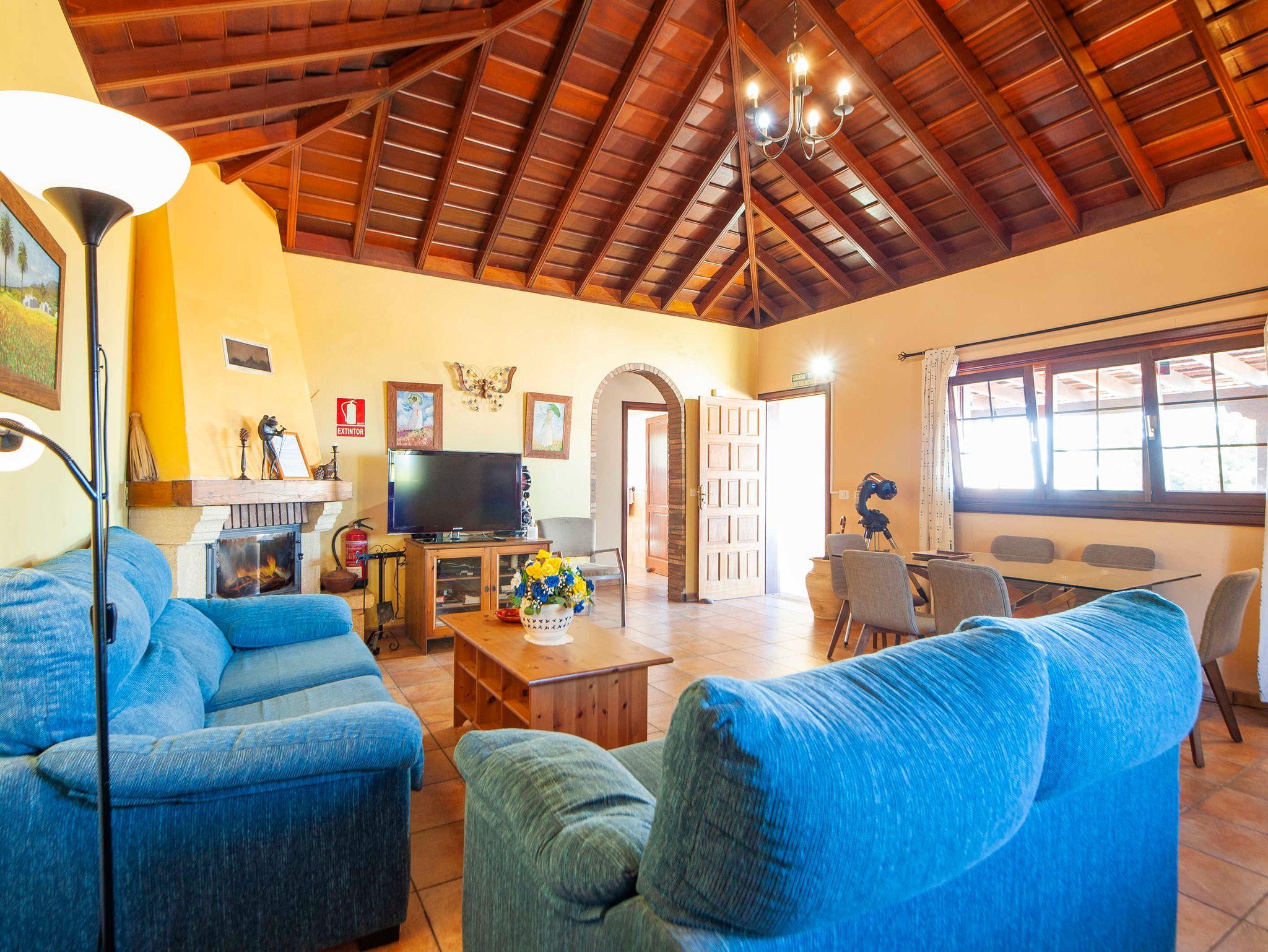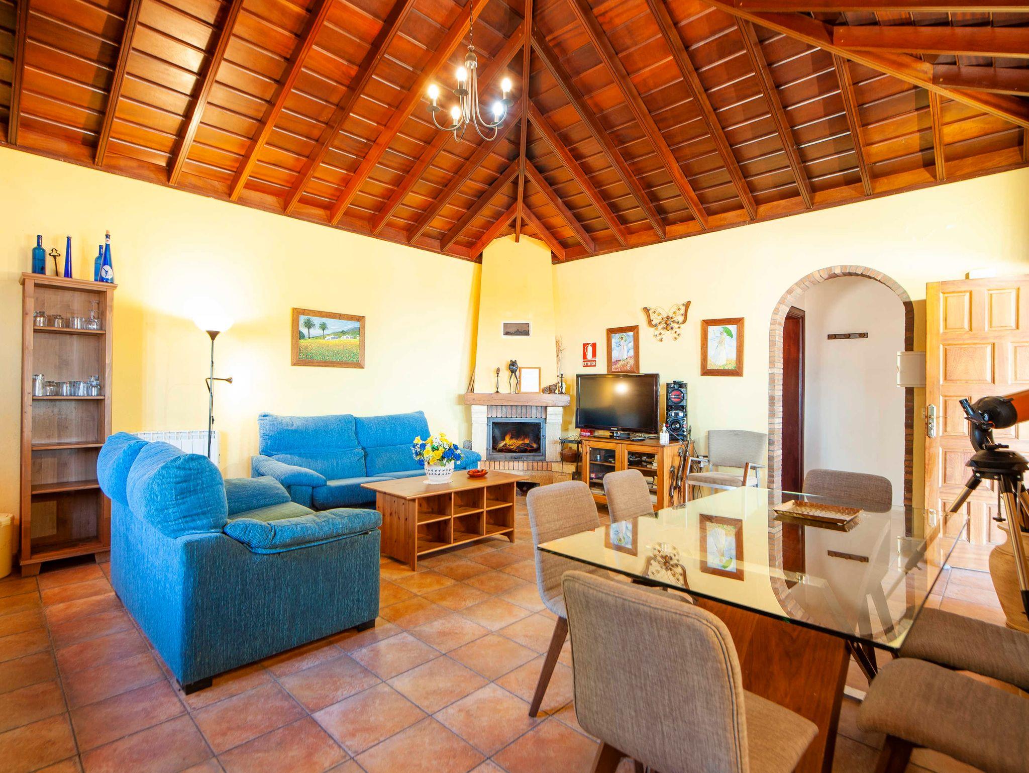 Die Küche ist an den Essbereich und den gemütlichen Wohnbereich angeschlossen. Am großen Esstisch nehmen bequem 4 Personen zum Essen Platz. Highlight im Wohnbereich ist der schöne Eckkamin, der Ihnen auch im Winter viele warme, gemütliche Stunden schenkt. Die zwei großen blauen Sofas lassen sich am Kopfteil verstellen und bieten so individuellen Sitzkomfort. Sat-TV, (deutsch) DVD, CD, MP3 und Internet (Wifi aber auch mit Kabel nutzbar) machen den Komfort perfekt. Der Eigentümer stellt auch ein Teleskop zur Verfügung. Ob Profi oder Hobby-Astrologe, dank der einfachen Bedienung kann jeder den sternenklaren Himmel La Palma´s bewundern.