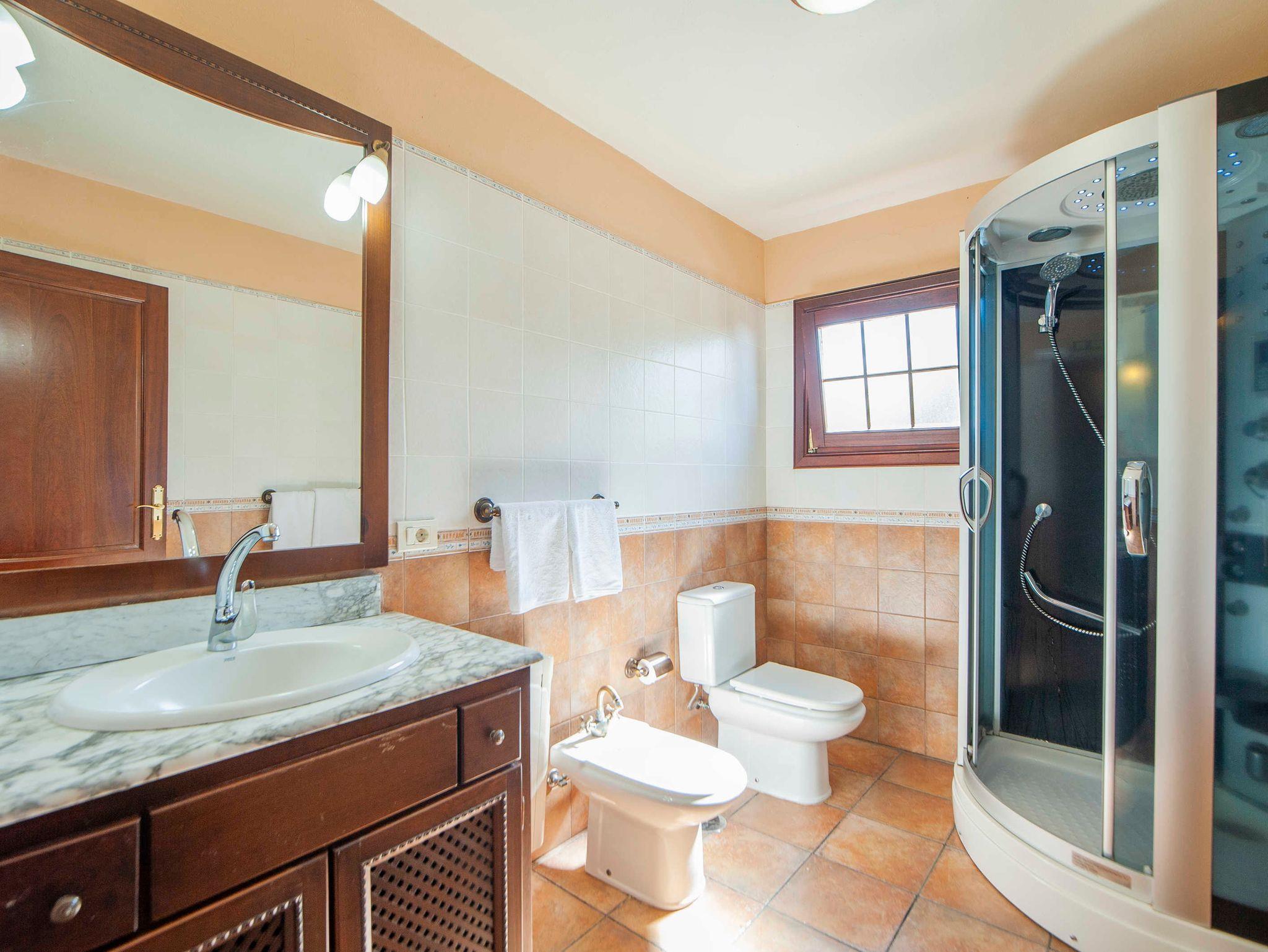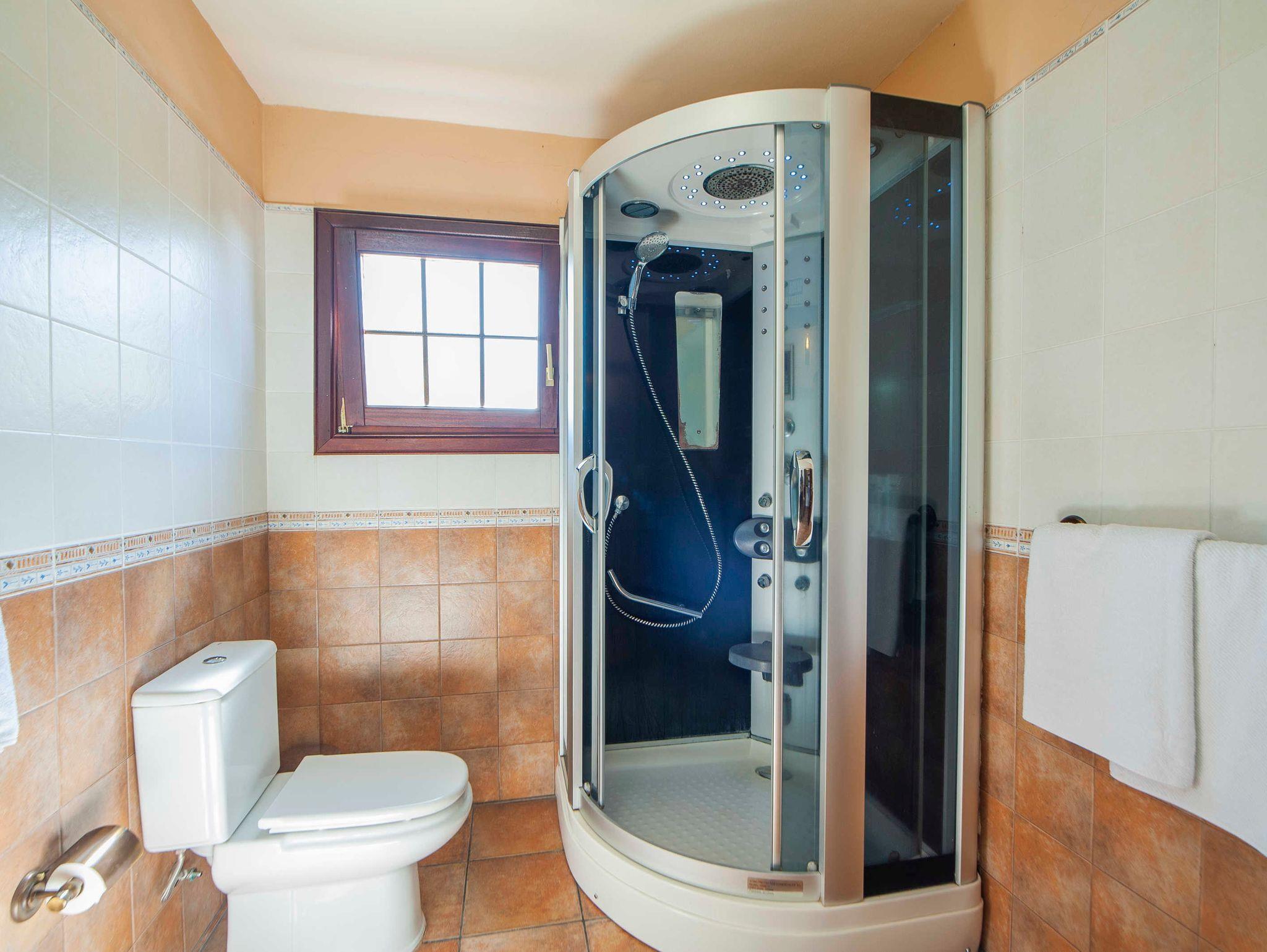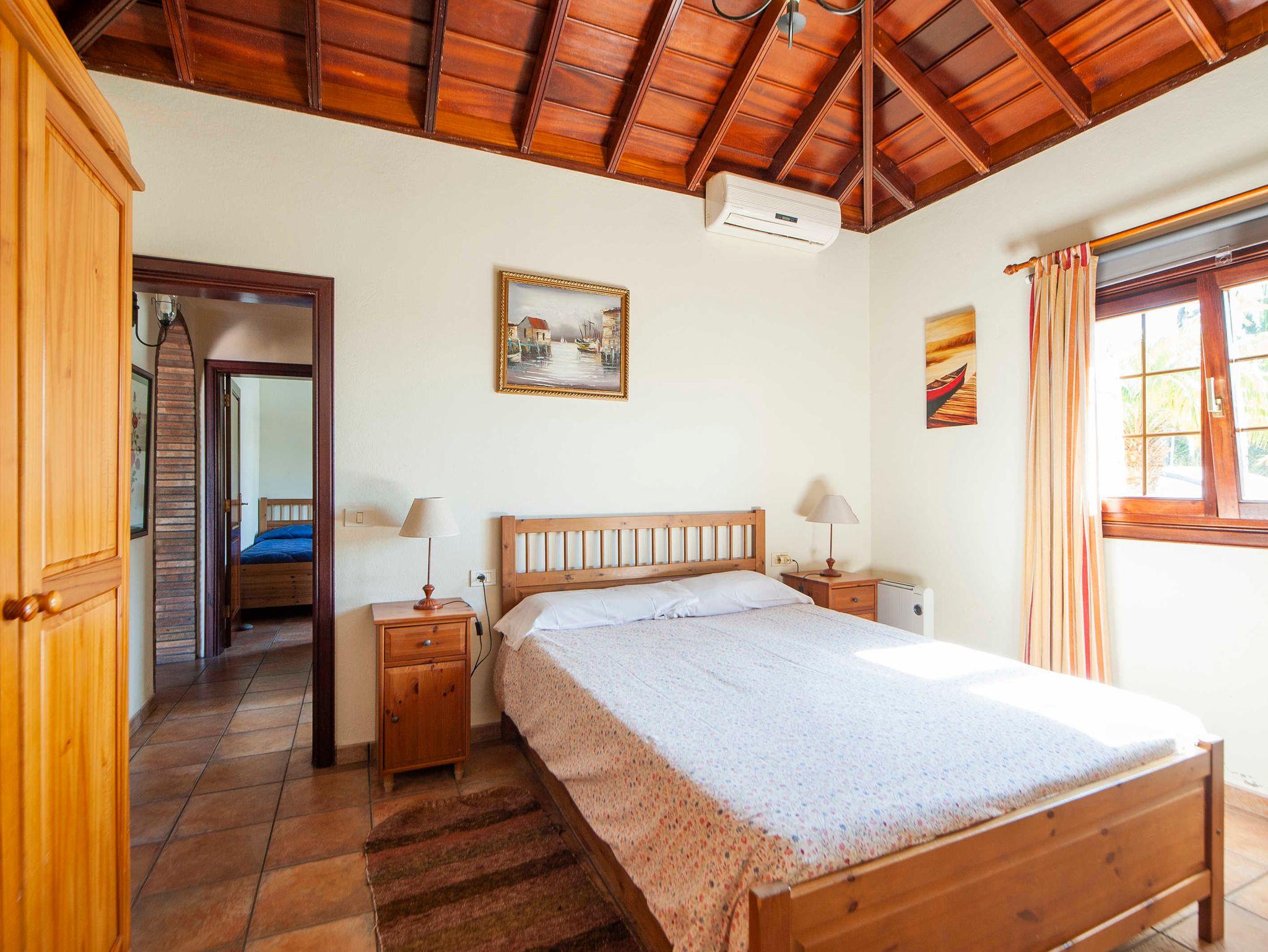 Die beiden Schlafzimmer sind zur Terrasse am Pool hin ausgerichtet und verfügen über ein Splitgerät (Klimaanlage+Heizung zugleich). Schon am frühen Morgen haben Sie einen Blick ins Grüne. Die Schlafzimmer profitieren vom Tageslicht. Das Hauptschlafzimmer mit Doppelbett (1,50 x 2,00m) hat einen großen Flachbildschirm, hier können Sie nur spanische Sender empfangen. Sie können aber einen Stick anschließen und so Ihre mitgebrachten Filme gemütlich im Bett schauen. Im zweiten Schlafzimmer stehen zwei Einzelbetten (0,90 x 2,00m).