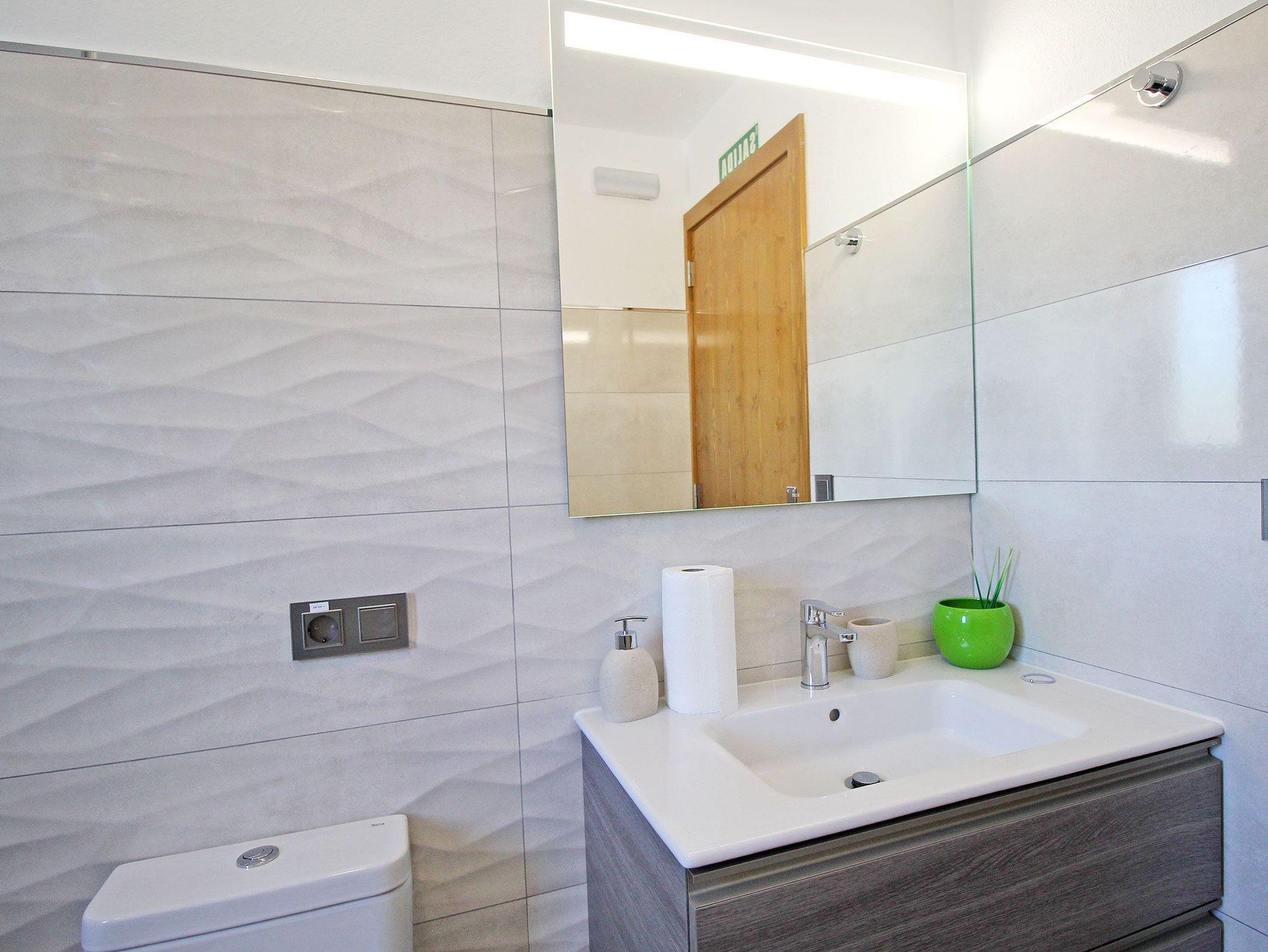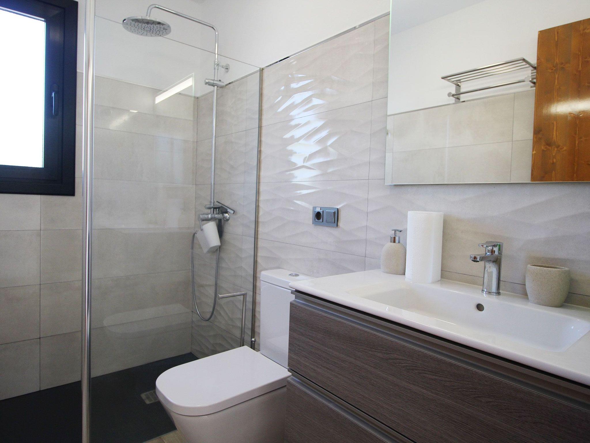 Das moderne Badezimmer befindet sich zwischen den beiden Schlafzimmern und ist mit einer begehbaren Dusche, einem Waschbecken und einer Toilette ausgestattet.