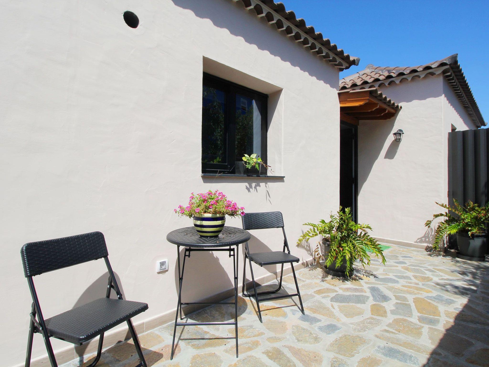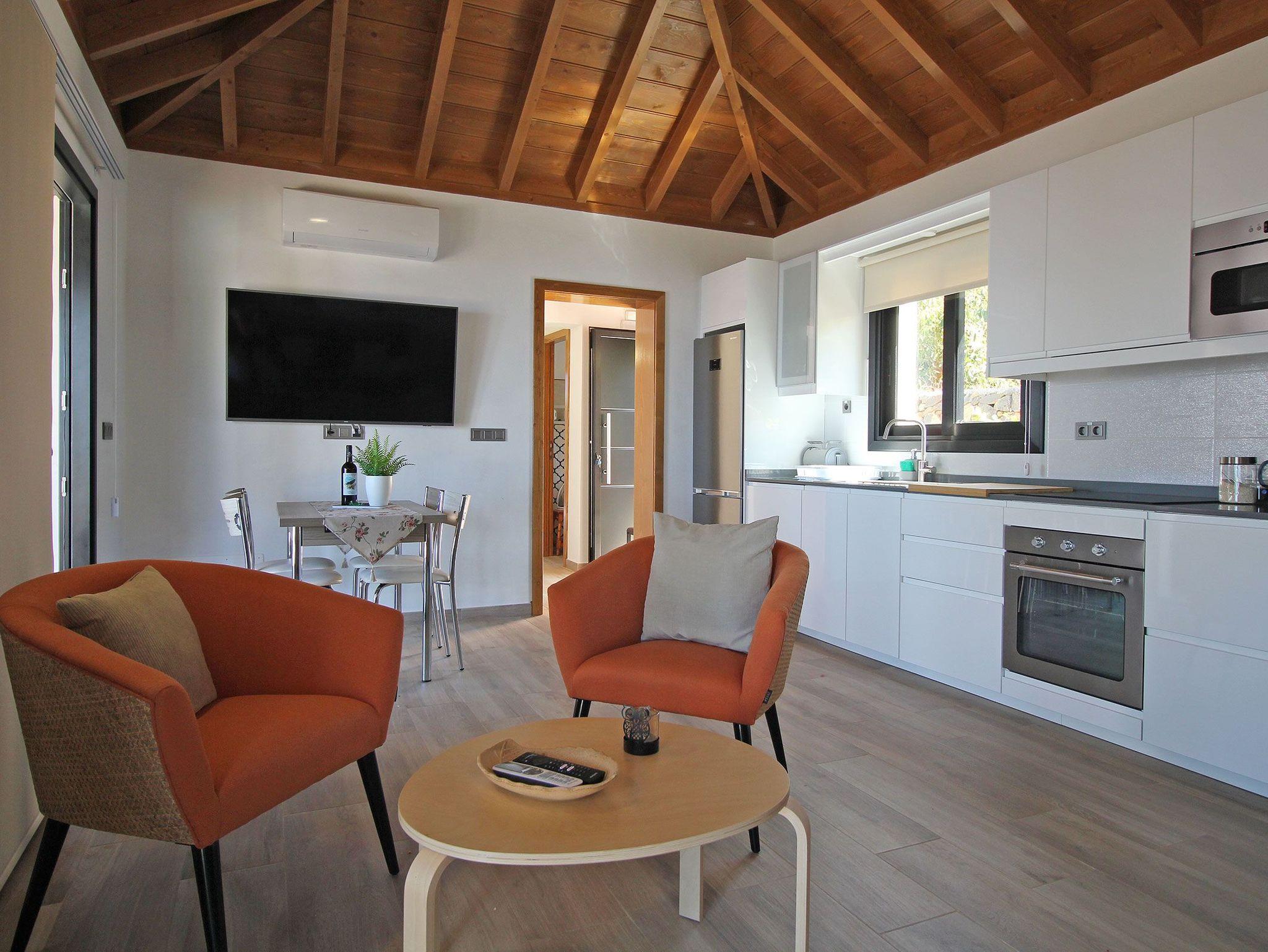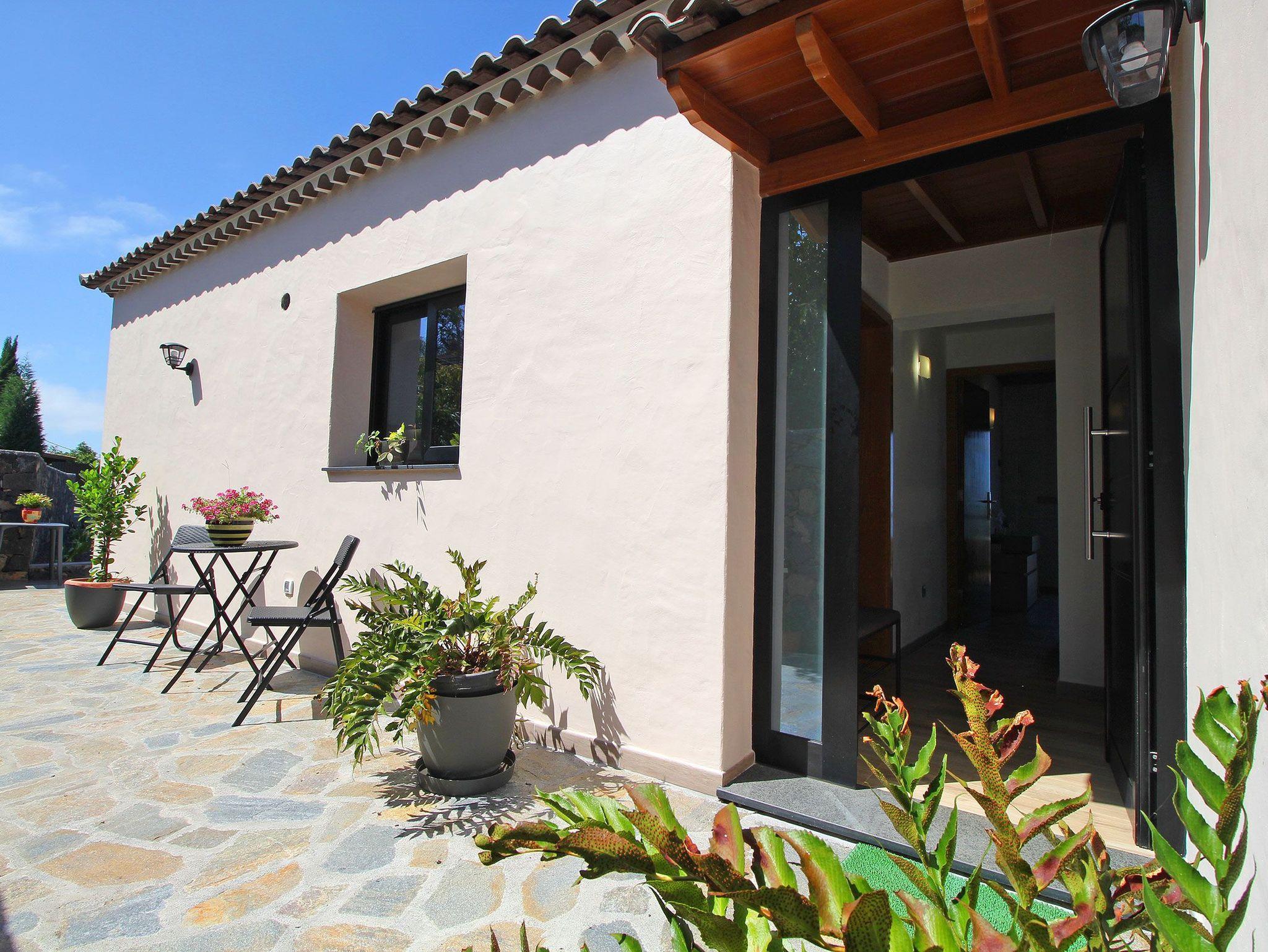 Der Eingang zum Haus befindet sich auf der Bergseite. Hier ist auch ein netter kleiner Sitzplatz mit Bistrotisch. Das Zentrum des Hauses bildet der geräumige, lichtdurchflutete Wohnraum.