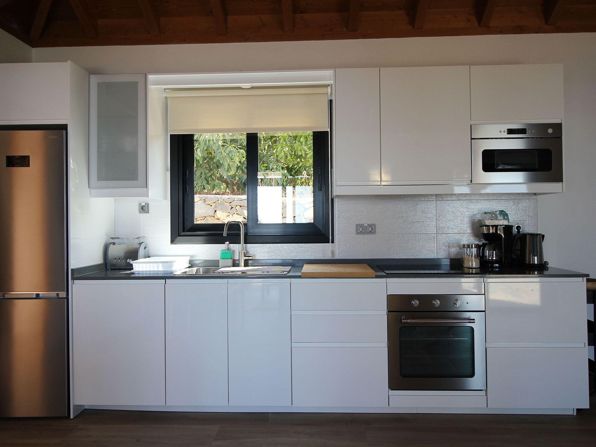 An der rückwärtigen Wand lockt die voll ausgestattete Küchenzeile, auch im Urlaub leckere Mahlzeiten zuzubereiten: sie ist mit einem Induktionsherd, einem Backofen, einer Mikrowelle, einem Geschirrspüler und einem großen Kühlschrank mit Gefrierfach ausgestattet. Reichhaltiges Geschirr und Kochutensilien runden die Ausstattung ab.