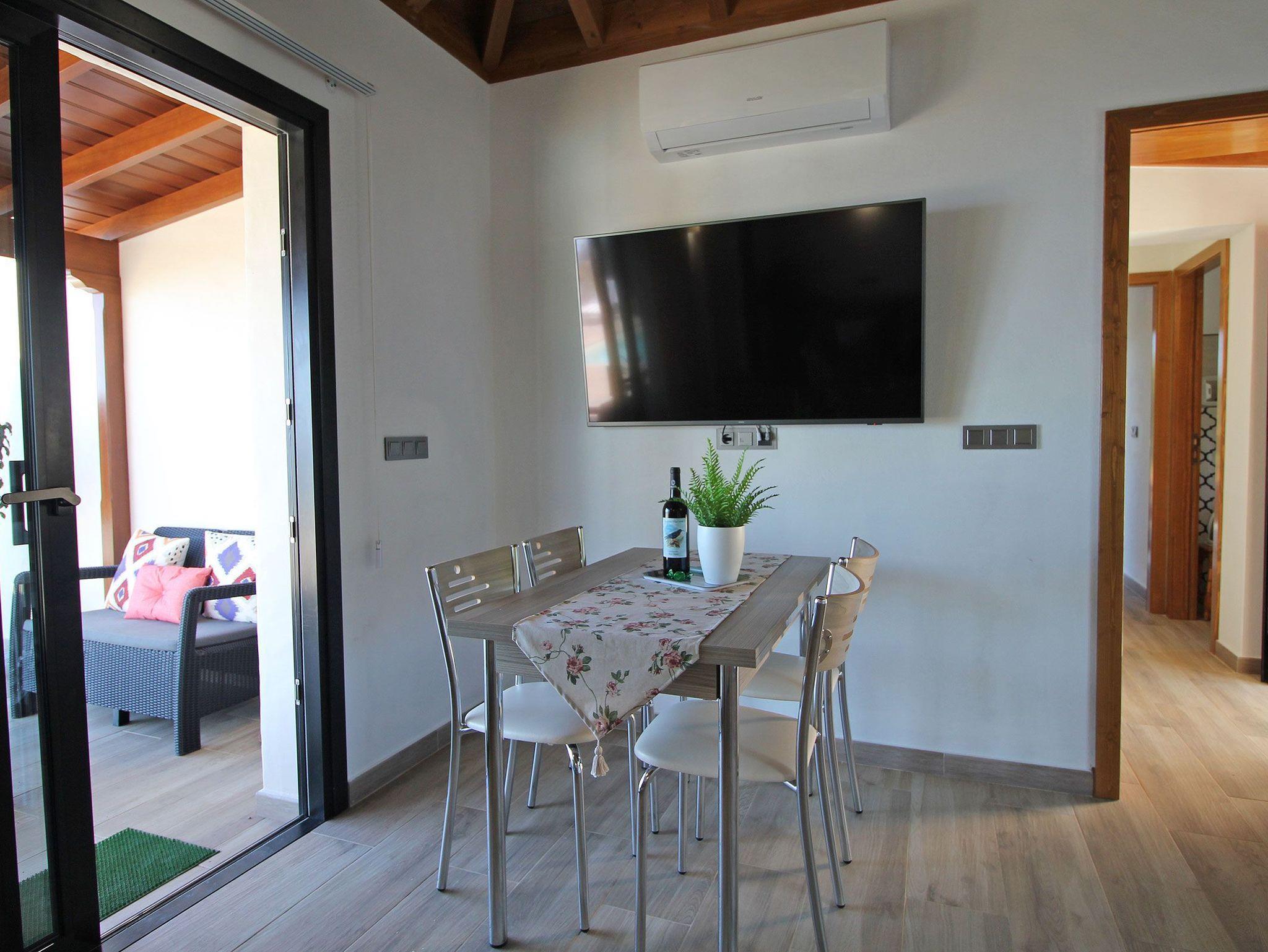 Rechts bietet der Esstisch Platz für 4 Personen. An der Wand befindet sich ein großer Flachbildschirm mit Sat TV.