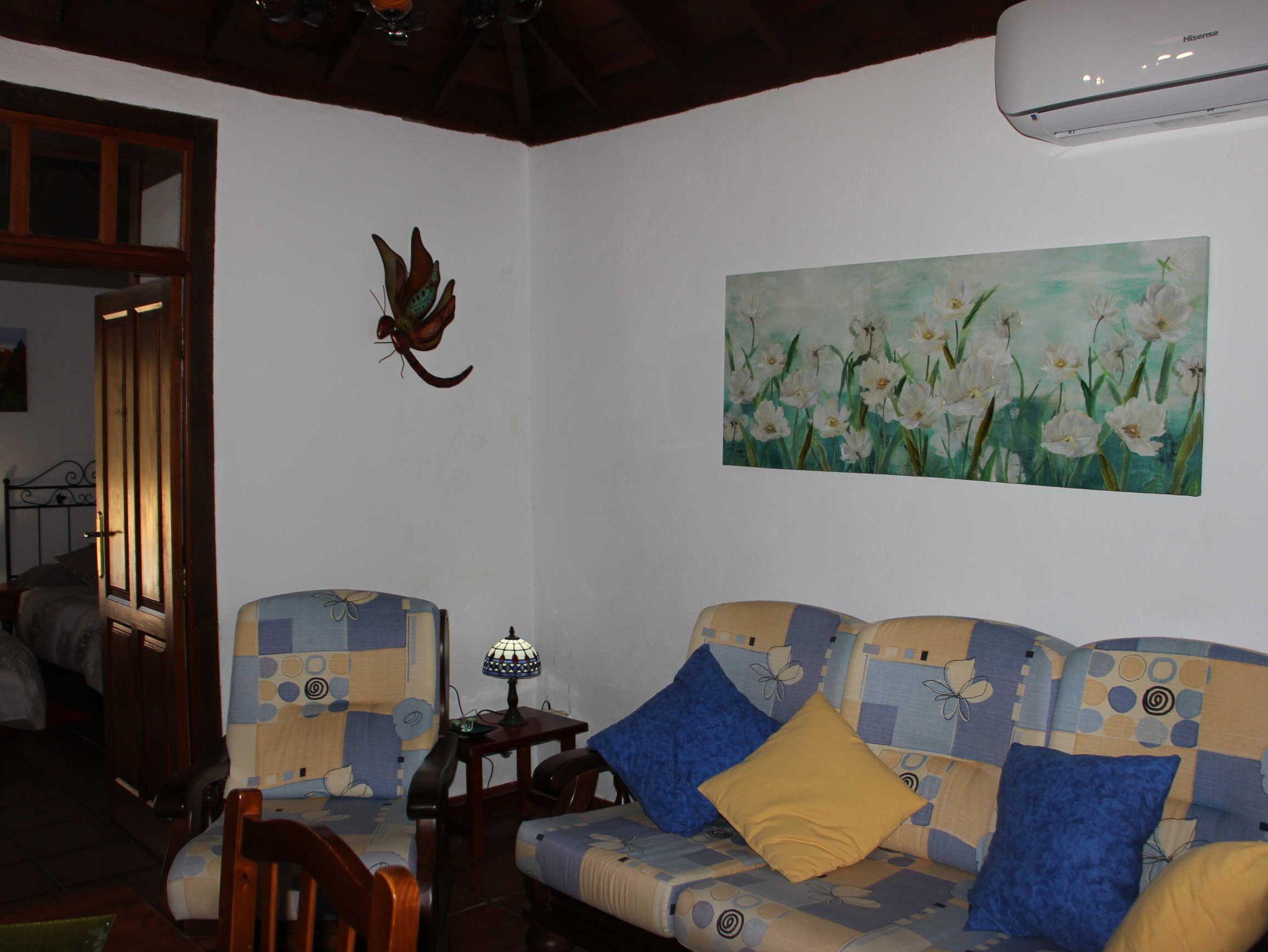 Eine überdachte Pergola mit zwei großen Fensterfronten und Sitzmöglichkeiten verbindet die Küche mit dem Rest des Hauses und spendet zusätzlich viel Licht. Mittelpunkt des Hauses ist das Wohnzimmer, von hier gehen links und rechts die beiden Schlafzimmer sowie das Bad ab. Neben einem gemütlichen 2-sitzigen Sofa sorgt ein Sessel für ein gemütliches Ambiente beim Fernsehen. Ein kleiner Tisch mit 4 Stühlen für einen Spieleabend steht in der Mitte des Raumes. Dezente Dekoration, liebevoll ausgewählte Details und Bilder der Pflanzenwelt La Palmas passen perfekt zum restlichen Stil des Hauses.