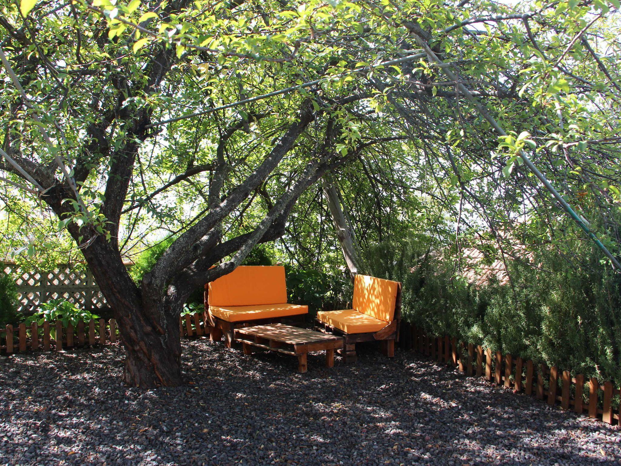 Der große Garten und Aussenbereich wird dominiert von schattenspendenden Obstbäumen. Ein großer überdachter Grill mit Spüle und einem Tisch für 4 Personen sorgt ganzjährig für Gaumenfreuden. Es gibt mehrere Sitzmöglichkeiten. Man kann auf originellen Holzmöbeln unter Bäumen sitzen, direkt am Haus an einem kleinen Tisch mit Stühlen oder auf einem großen Steinbänkchen mit Blick in den Garten und phantastischem Blick hinauf in die Berge. Vom Garten aus kann man in der Ferne auch das Meer sehen.