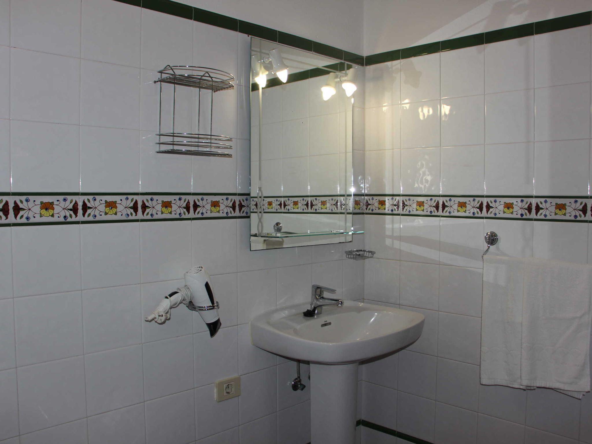 Das Bad ist schlicht, klein und zweckmäßig und hat eine Dusche, WC, Bidet und ein Waschbecken mit großem Spiegel. In einem separaten Hauswirtschaftsraum ist die Waschmaschine untergebracht.