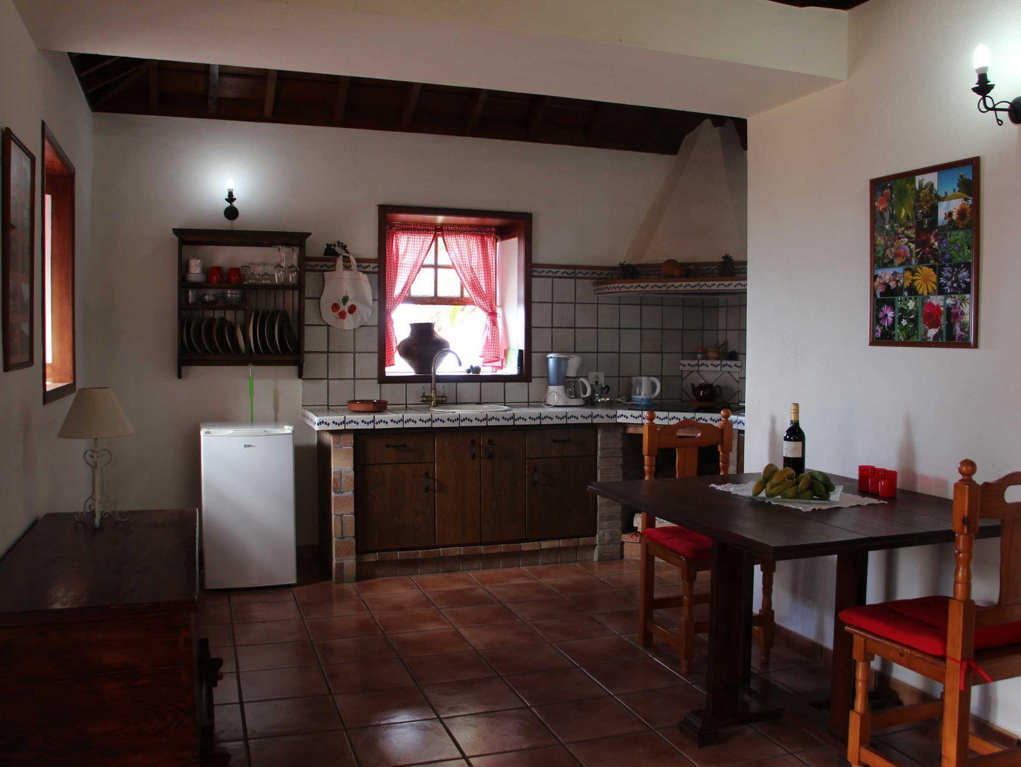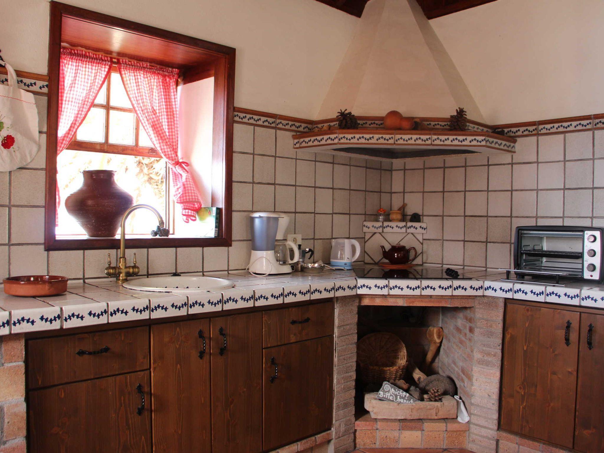 Der Wohnbereich wurde schlicht gehalten mit einer schönen alten Holztruhe, einen Sofa mit großem Sat-TV (Flachbildschirm) und einem Esstisch mit 2 Stühlen. Auch in der Küchenzeile tauchen wieder Dekoelemente aus alten Zeiten auf und geben dem Haus seinen eigenen Charme. Die Küchenzeile ist gut ausgestattet, auch vom Küchenfenster hat man Blick auf das Meer.