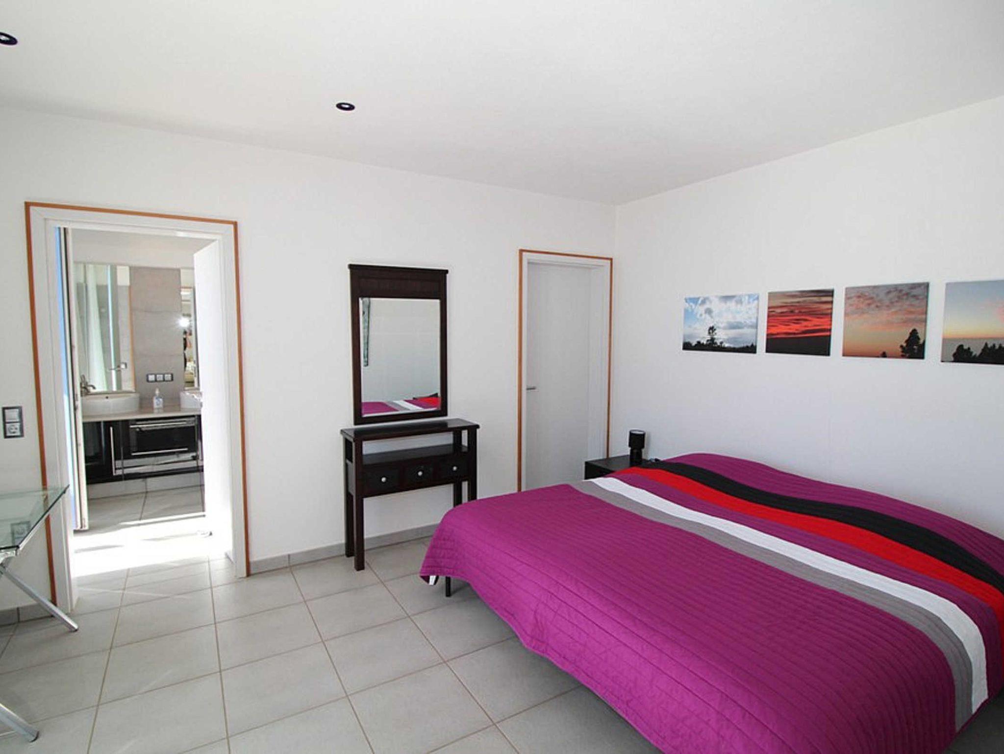 • 1 Schlafzimmer (Erdgeschoss) mit großem Doppelbett (2 Luxusmatratzen je 1,00x2,00m, verstellbare Lattenroste), Schreibtisch, Zugang zur großen Haupt-Terrasse und zum Pool