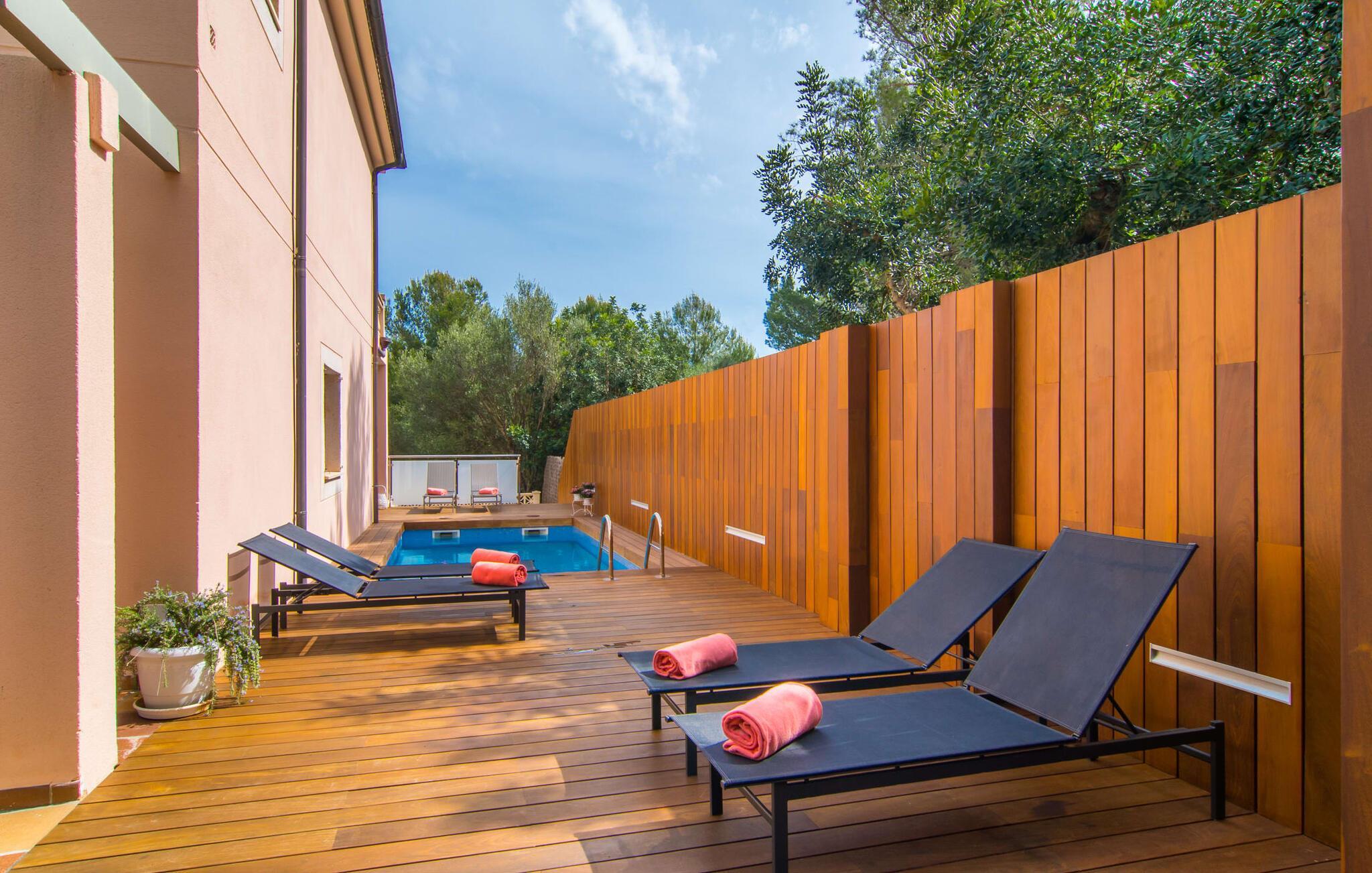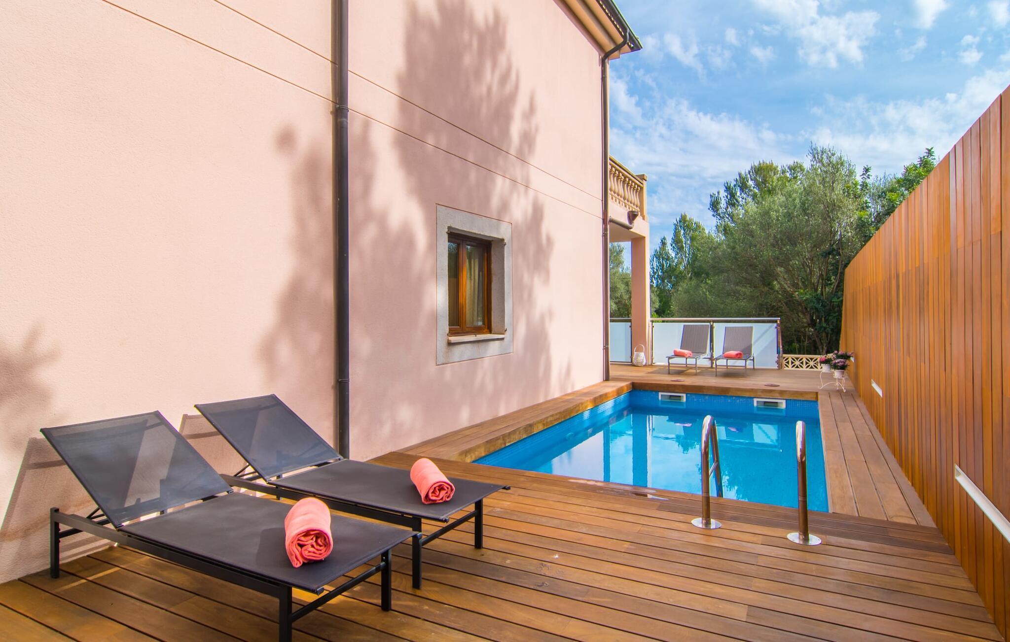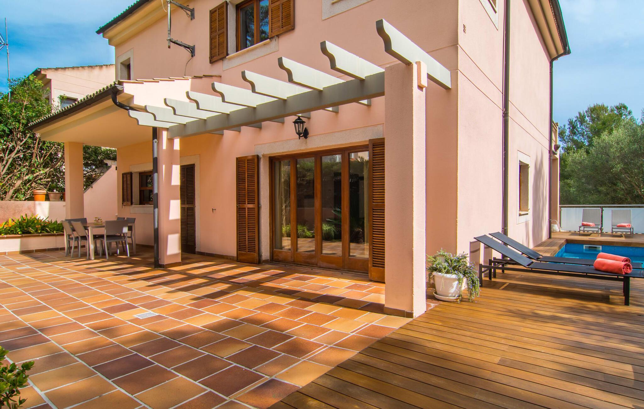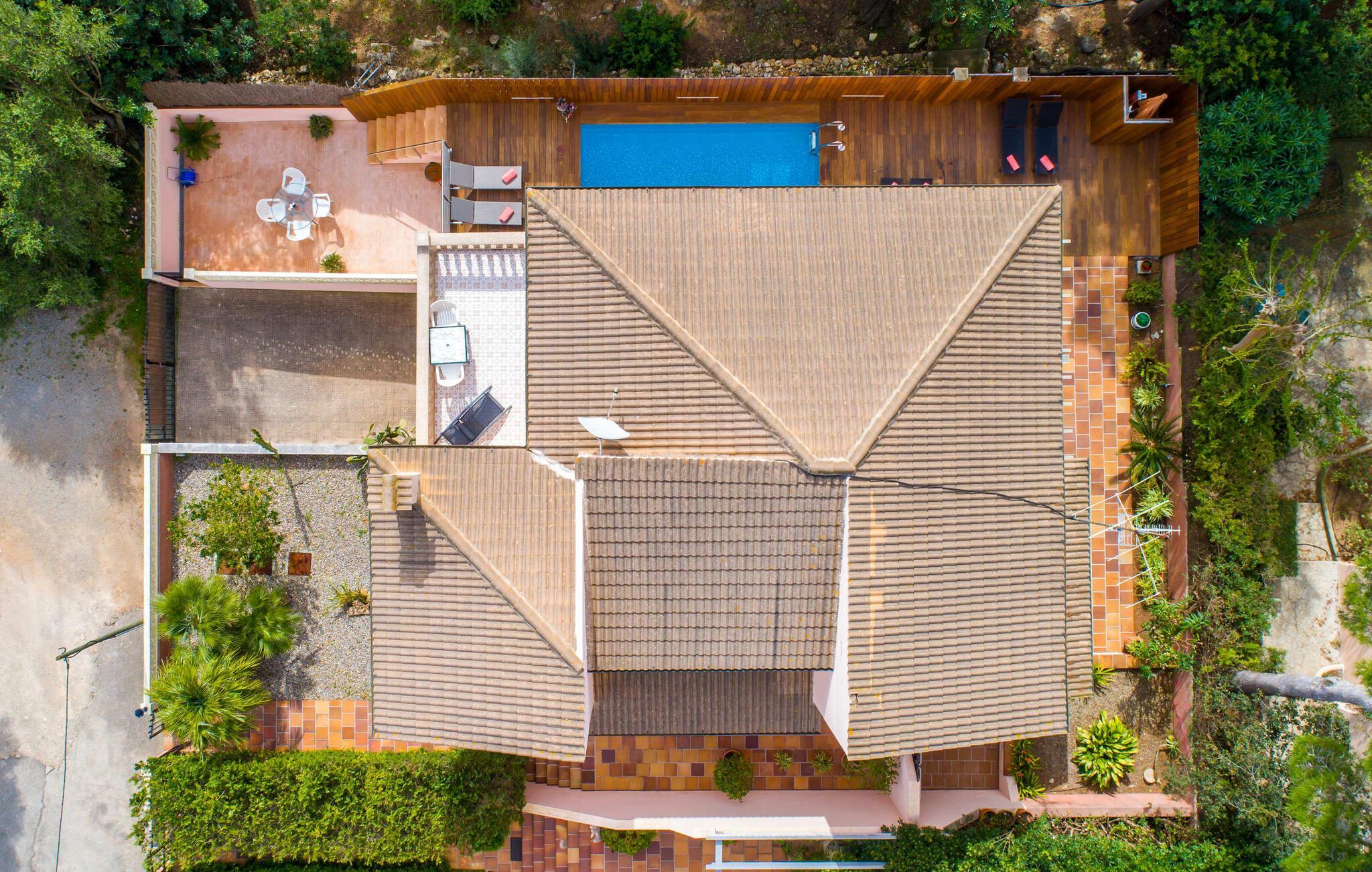 Har I lyst til ferie? Vi har, hvad I leder efter – tag blot et kig på den meget velholdte villa “Tomymar Son Moll”. Det smarte nye hus ligger i en lille bygd - centralt beliggende og byder samtidig på en masse privatliv med fyrretræer og en subtil træafskærmning, der grænser op til poolområdet. Når I vågner om morgenen, kan I hoppe i poolen og nyde en aromatisk kop kaffe. Det er en rigtig feriefølelse! I kan selvfølgelig også tage en forfriskende svømmetur til frokost og derefter sætte jer ned på de komfortable polyrattan liggestole på træsolterrassen for at slappe af eller afslutte med at læse den medbragte gode bog. Terrasselandskabet fortsætter problemfrit i husets skyggeside. Her finder I en hyggelig spiseplads, der er ideel til ethvert måltid. Da ejendommen er lidt kuperet, vil vi også gerne fremhæve det andet, solbeskinnede opholdsområde, som er tilgængeligt via trappen ved poolen. Den ligger i entréplan - et godt alternativ til rejsekammerater, der ikke har lyst til at sove efter en social grill og gerne vil slutte aftenen af ??i behagelig middelhavsvarme. Et tredje højdepunkt er tagterrassen på husets øverste etage - find jeres yndlingssted eller prøv dem alle sammen! Alt er lige smukt her!