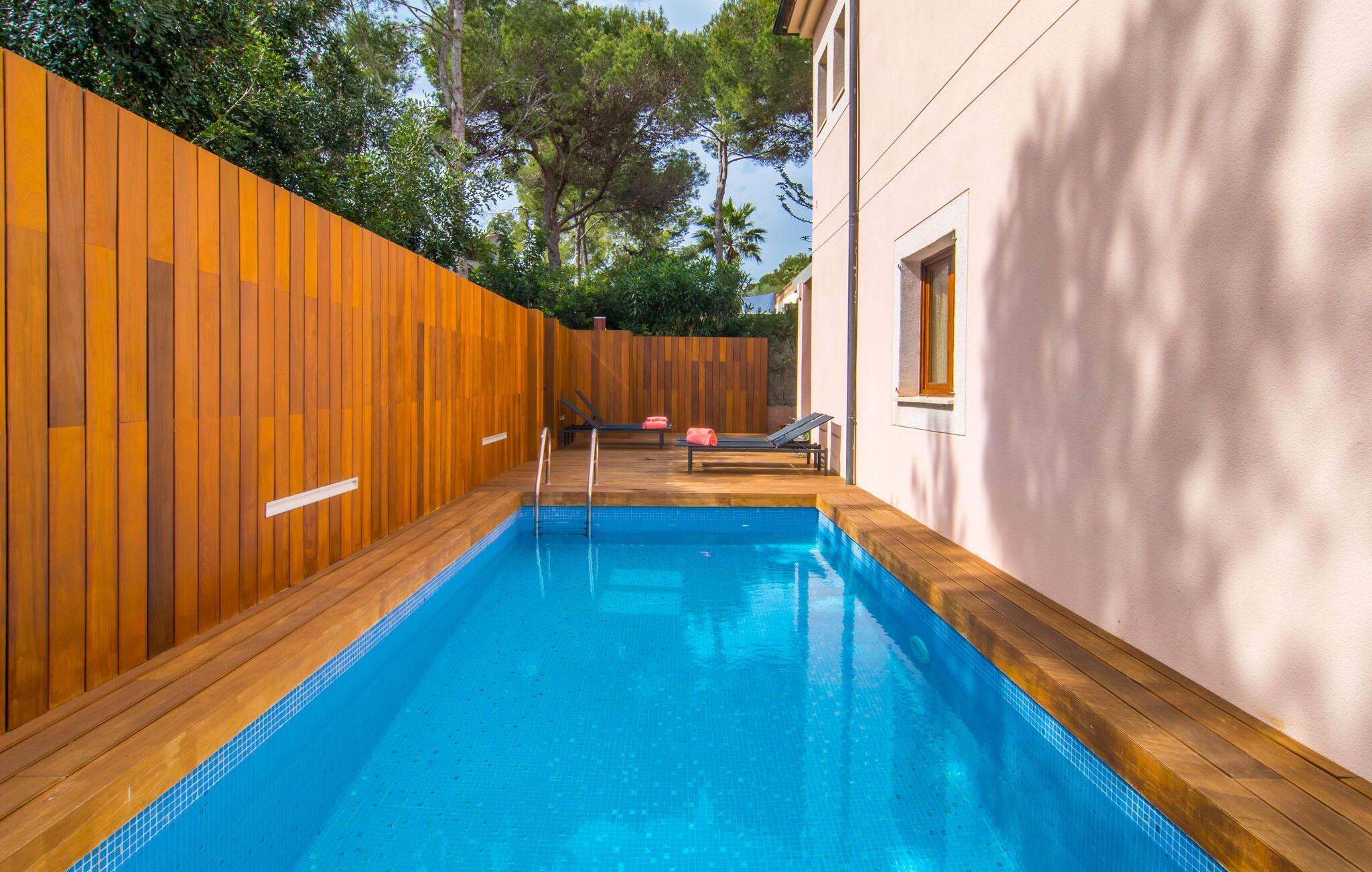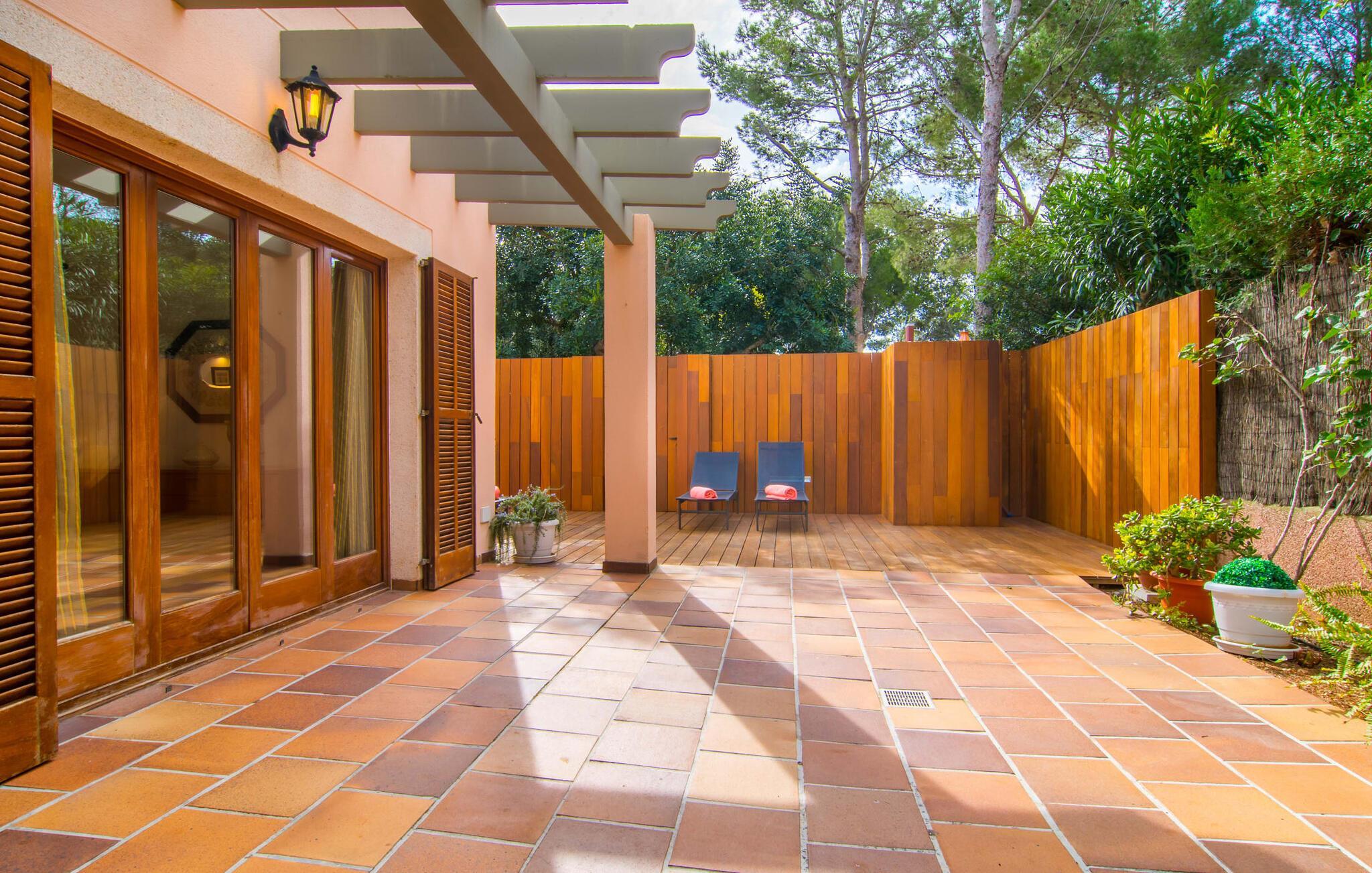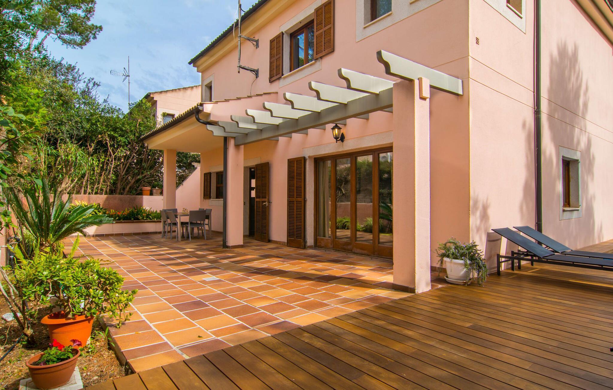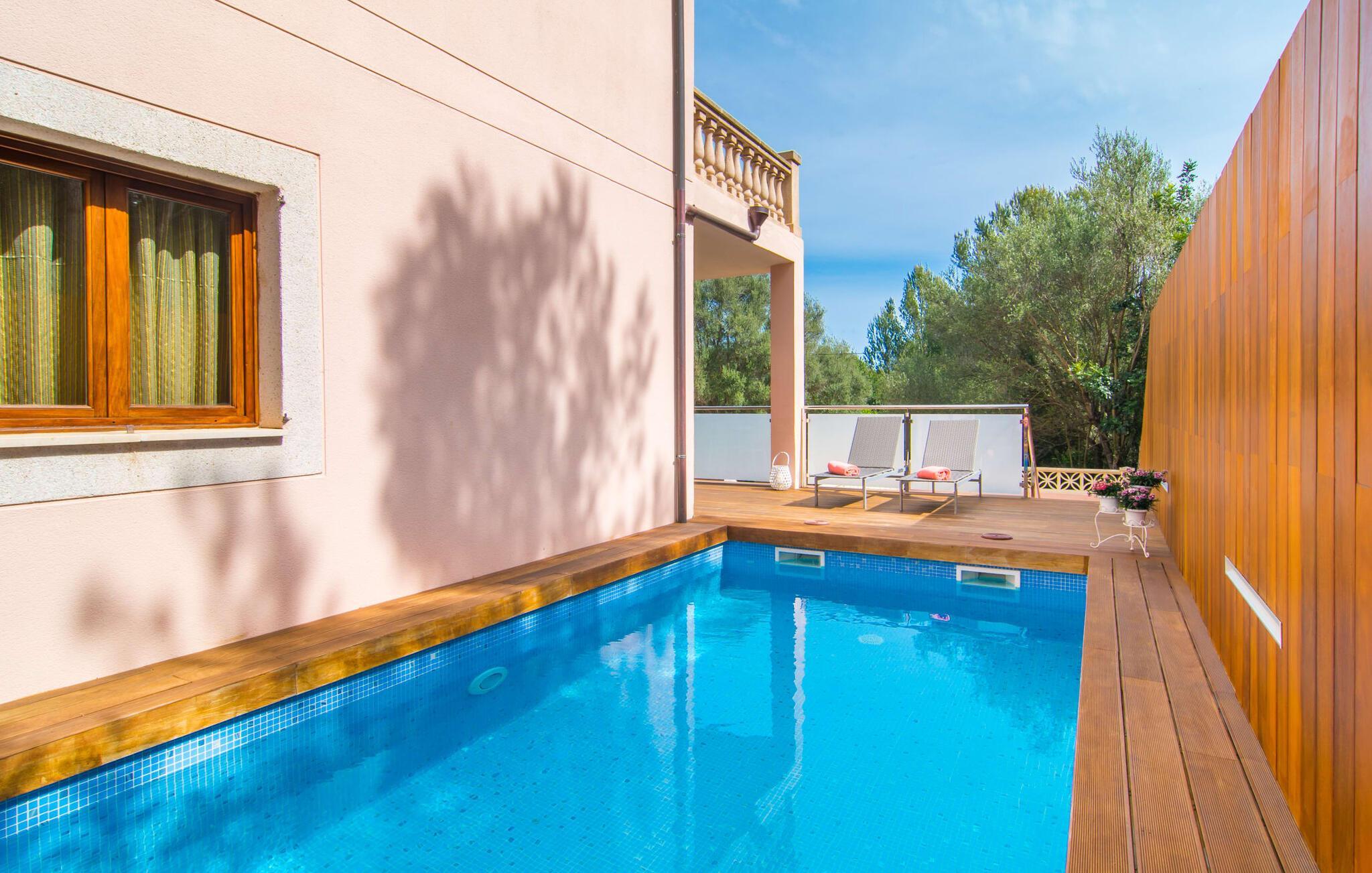 Har I lyst til ferie? Vi har, hvad I leder efter – tag blot et kig på den meget velholdte villa “Tomymar Son Moll”. Det smarte nye hus ligger i en lille bygd - centralt beliggende og byder samtidig på en masse privatliv med fyrretræer og en subtil træafskærmning, der grænser op til poolområdet. Når I vågner om morgenen, kan I hoppe i poolen og nyde en aromatisk kop kaffe. Det er en rigtig feriefølelse! I kan selvfølgelig også tage en forfriskende svømmetur til frokost og derefter sætte jer ned på de komfortable polyrattan liggestole på træsolterrassen for at slappe af eller afslutte med at læse den medbragte gode bog. Terrasselandskabet fortsætter problemfrit i husets skyggeside. Her finder I en hyggelig spiseplads, der er ideel til ethvert måltid. Da ejendommen er lidt kuperet, vil vi også gerne fremhæve det andet, solbeskinnede opholdsområde, som er tilgængeligt via trappen ved poolen. Den ligger i entréplan - et godt alternativ til rejsekammerater, der ikke har lyst til at sove efter en social grill og gerne vil slutte aftenen af ??i behagelig middelhavsvarme. Et tredje højdepunkt er tagterrassen på husets øverste etage - find jeres yndlingssted eller prøv dem alle sammen! Alt er lige smukt her!