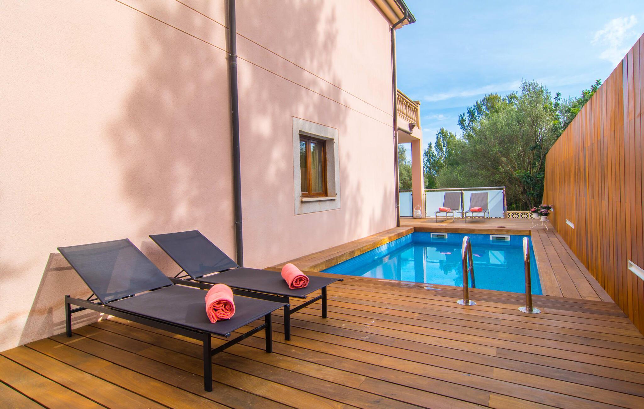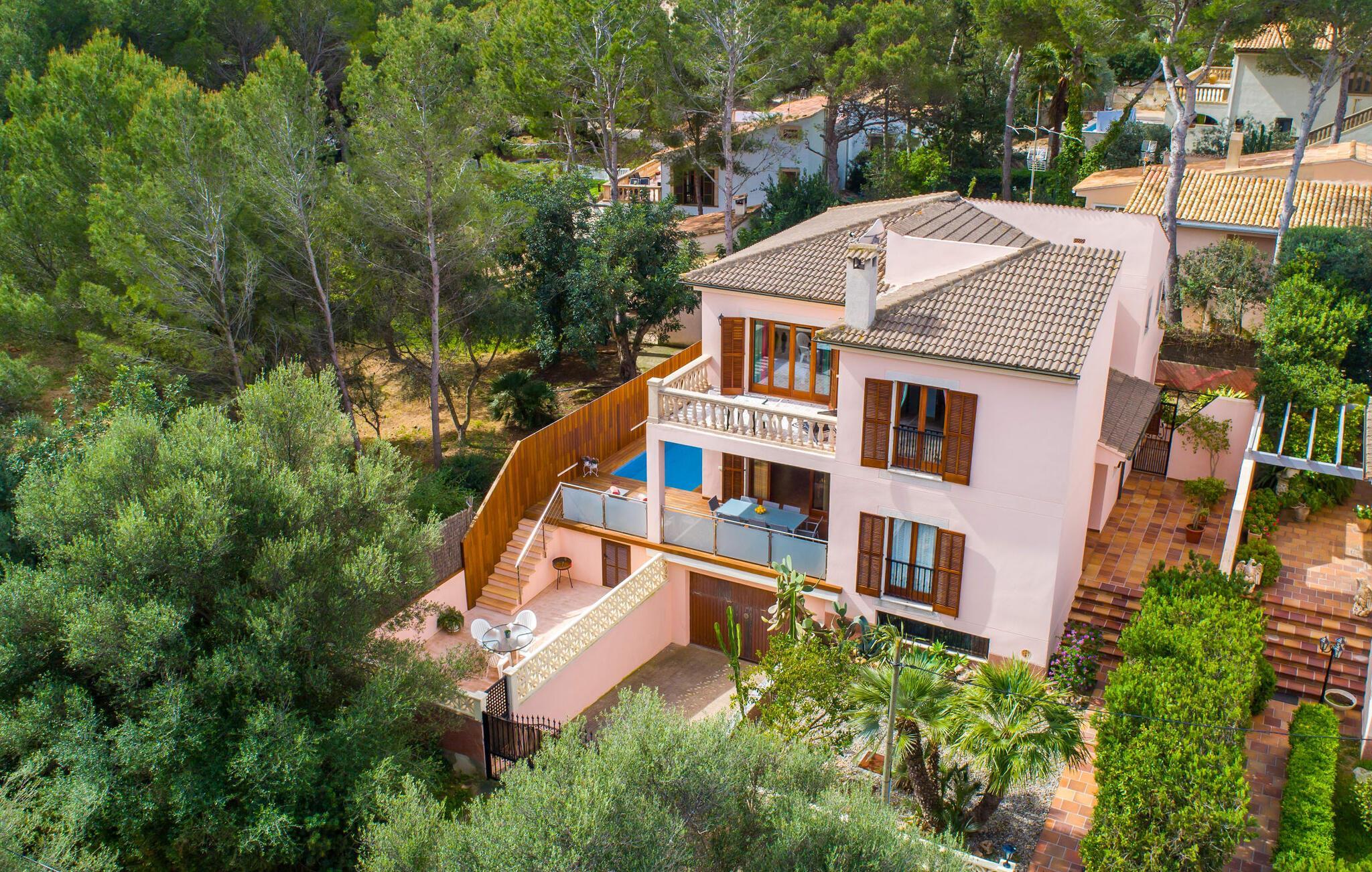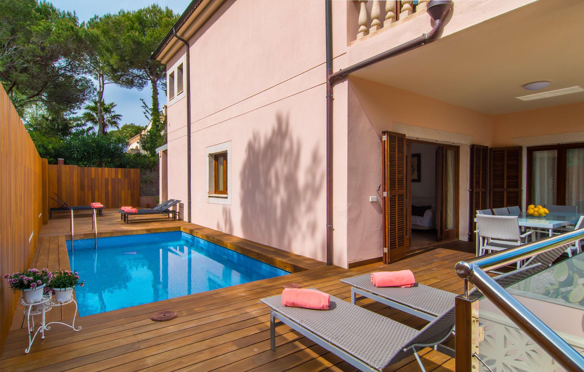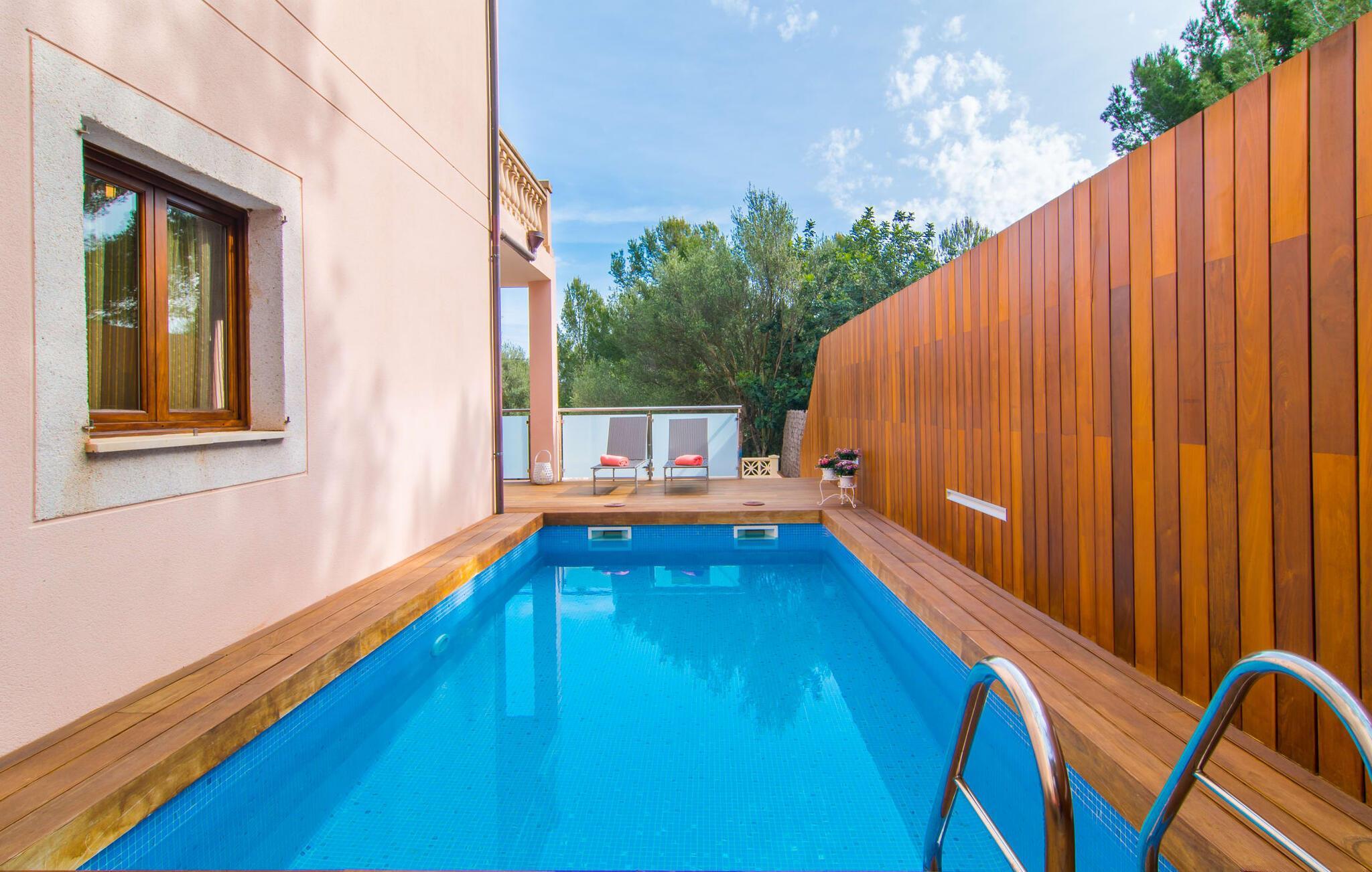 Har I lyst til ferie? Vi har, hvad I leder efter – tag blot et kig på den meget velholdte villa “Tomymar Son Moll”. Det smarte nye hus ligger i en lille bygd - centralt beliggende og byder samtidig på en masse privatliv med fyrretræer og en subtil træafskærmning, der grænser op til poolområdet. Når I vågner om morgenen, kan I hoppe i poolen og nyde en aromatisk kop kaffe. Det er en rigtig feriefølelse! I kan selvfølgelig også tage en forfriskende svømmetur til frokost og derefter sætte jer ned på de komfortable polyrattan liggestole på træsolterrassen for at slappe af eller afslutte med at læse den medbragte gode bog. Terrasselandskabet fortsætter problemfrit i husets skyggeside. Her finder I en hyggelig spiseplads, der er ideel til ethvert måltid. Da ejendommen er lidt kuperet, vil vi også gerne fremhæve det andet, solbeskinnede opholdsområde, som er tilgængeligt via trappen ved poolen. Den ligger i entréplan - et godt alternativ til rejsekammerater, der ikke har lyst til at sove efter en social grill og gerne vil slutte aftenen af ??i behagelig middelhavsvarme. Et tredje højdepunkt er tagterrassen på husets øverste etage - find jeres yndlingssted eller prøv dem alle sammen! Alt er lige smukt her!