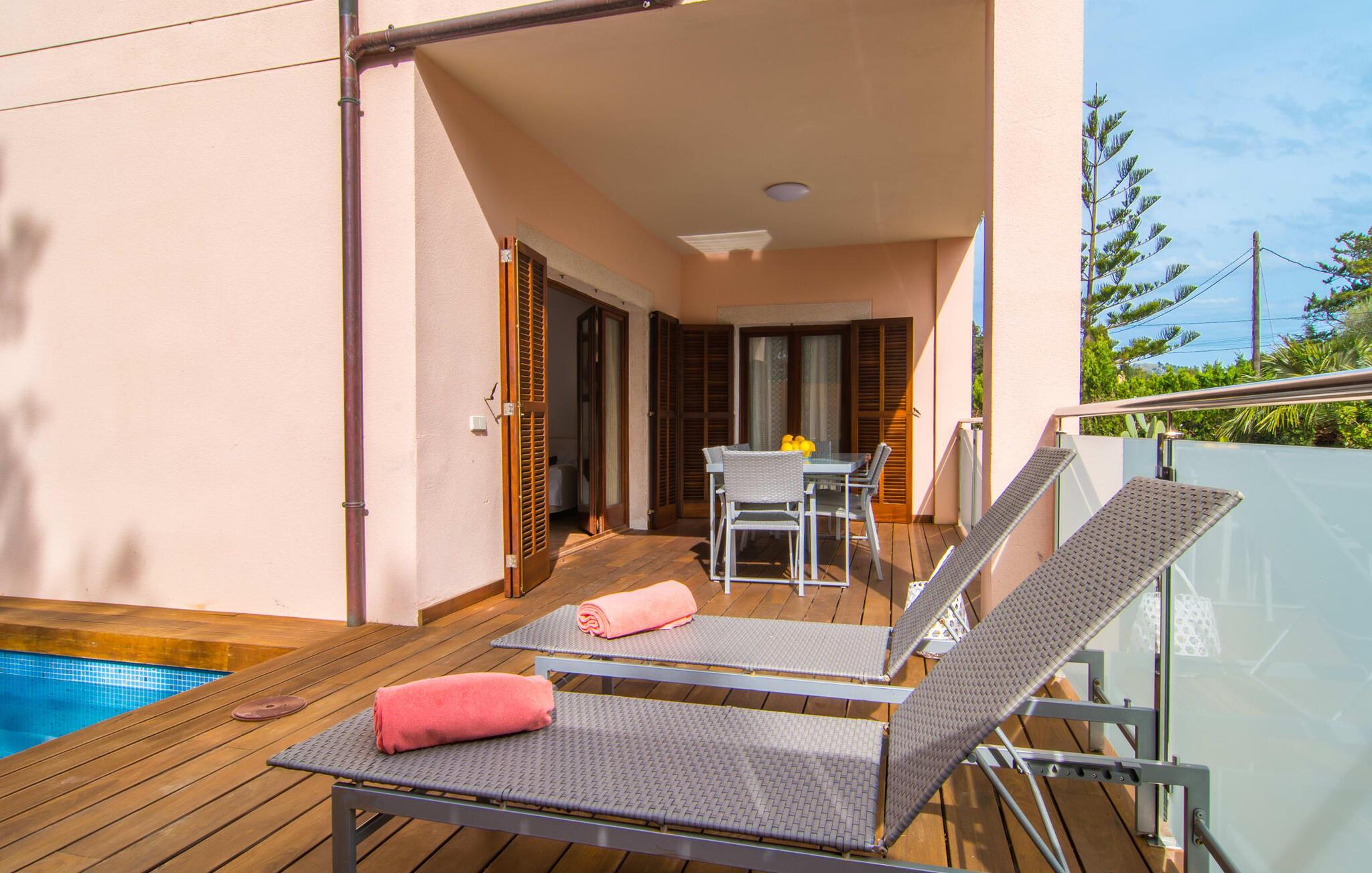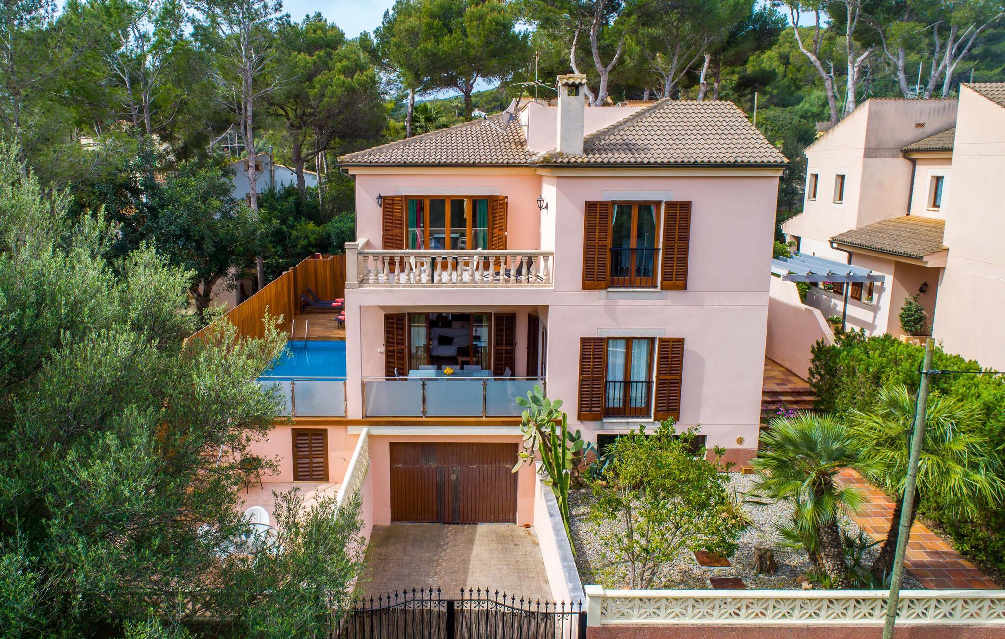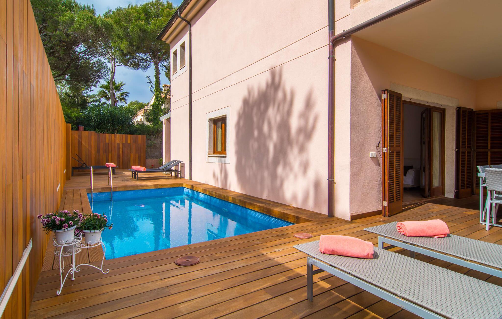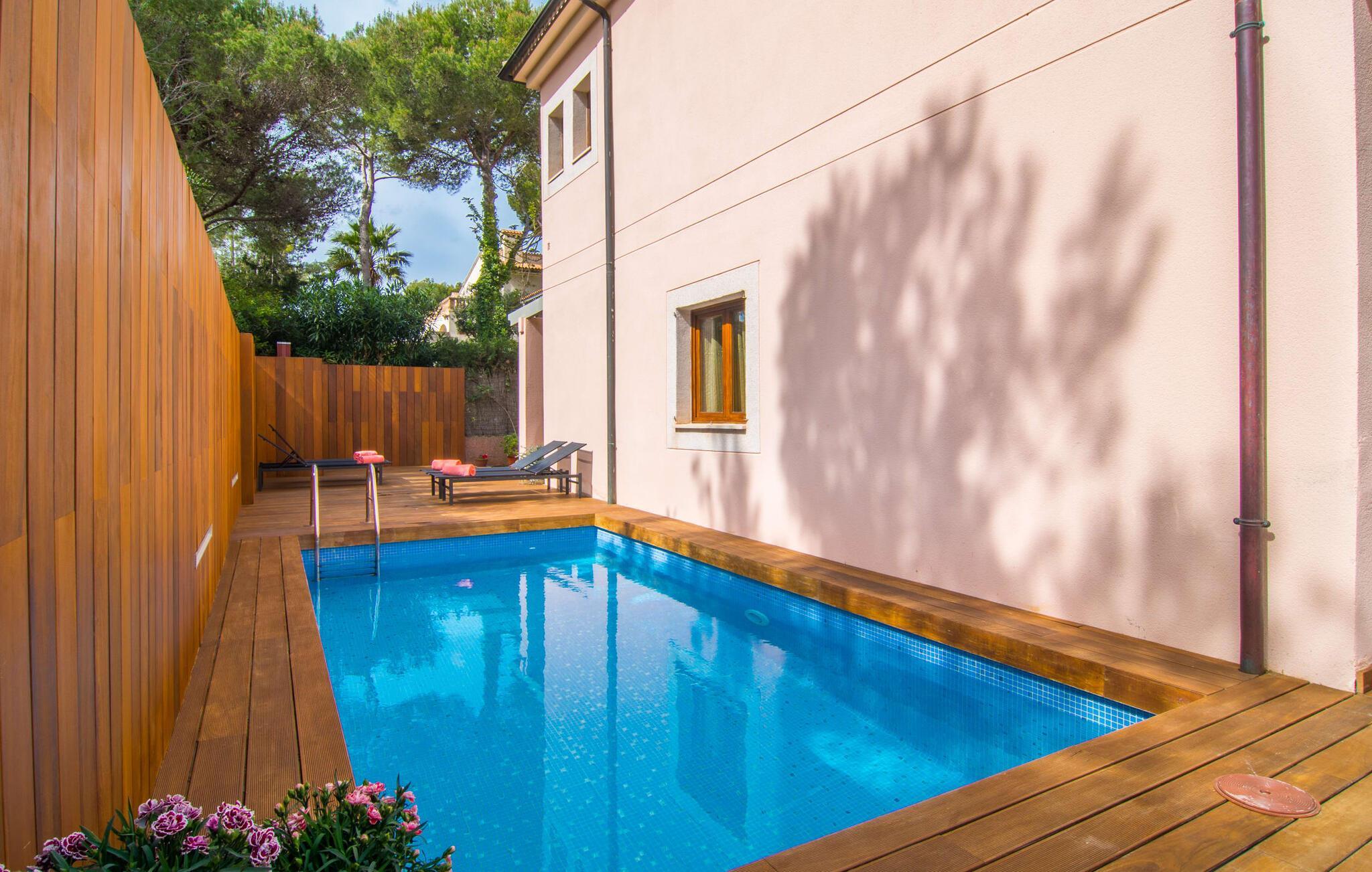 Har I lyst til ferie? Vi har, hvad I leder efter – tag blot et kig på den meget velholdte villa “Tomymar Son Moll”. Det smarte nye hus ligger i en lille bygd - centralt beliggende og byder samtidig på en masse privatliv med fyrretræer og en subtil træafskærmning, der grænser op til poolområdet. Når I vågner om morgenen, kan I hoppe i poolen og nyde en aromatisk kop kaffe. Det er en rigtig feriefølelse! I kan selvfølgelig også tage en forfriskende svømmetur til frokost og derefter sætte jer ned på de komfortable polyrattan liggestole på træsolterrassen for at slappe af eller afslutte med at læse den medbragte gode bog. Terrasselandskabet fortsætter problemfrit i husets skyggeside. Her finder I en hyggelig spiseplads, der er ideel til ethvert måltid. Da ejendommen er lidt kuperet, vil vi også gerne fremhæve det andet, solbeskinnede opholdsområde, som er tilgængeligt via trappen ved poolen. Den ligger i entréplan - et godt alternativ til rejsekammerater, der ikke har lyst til at sove efter en social grill og gerne vil slutte aftenen af ??i behagelig middelhavsvarme. Et tredje højdepunkt er tagterrassen på husets øverste etage - find jeres yndlingssted eller prøv dem alle sammen! Alt er lige smukt her!