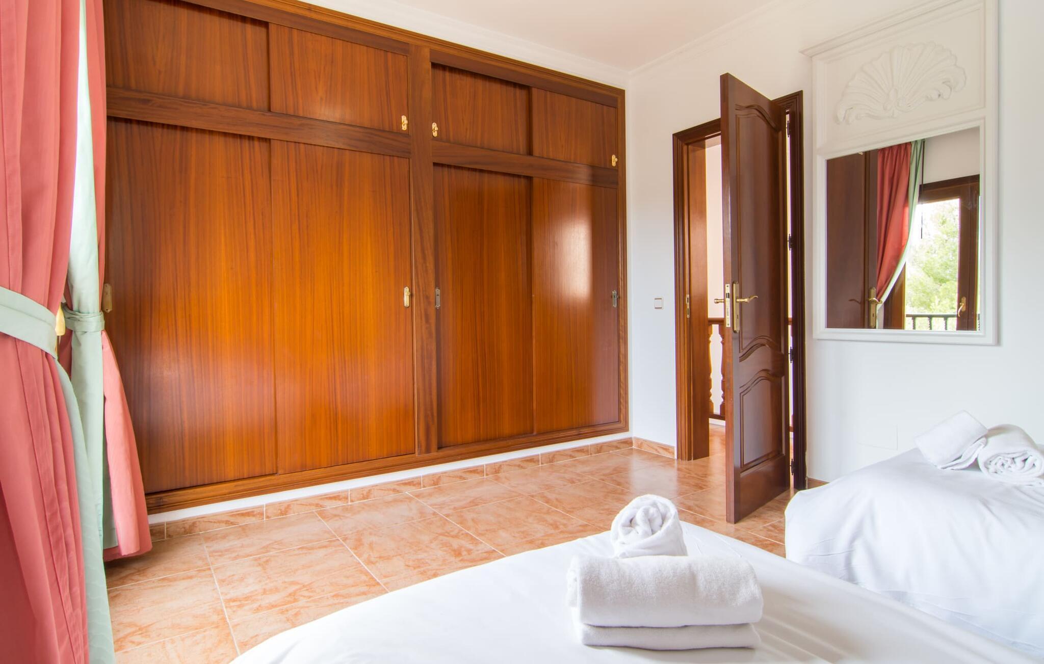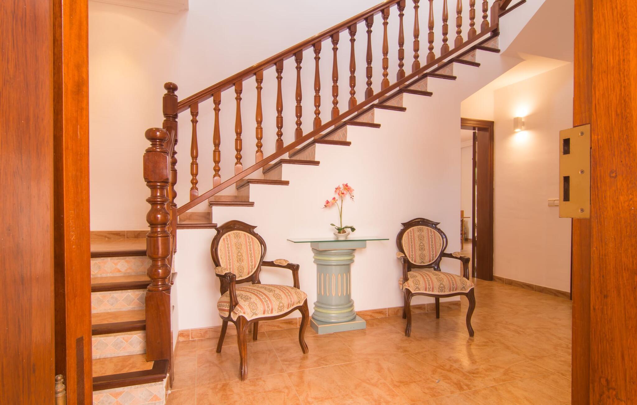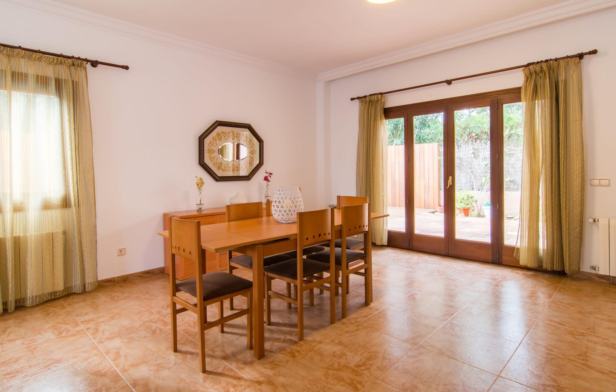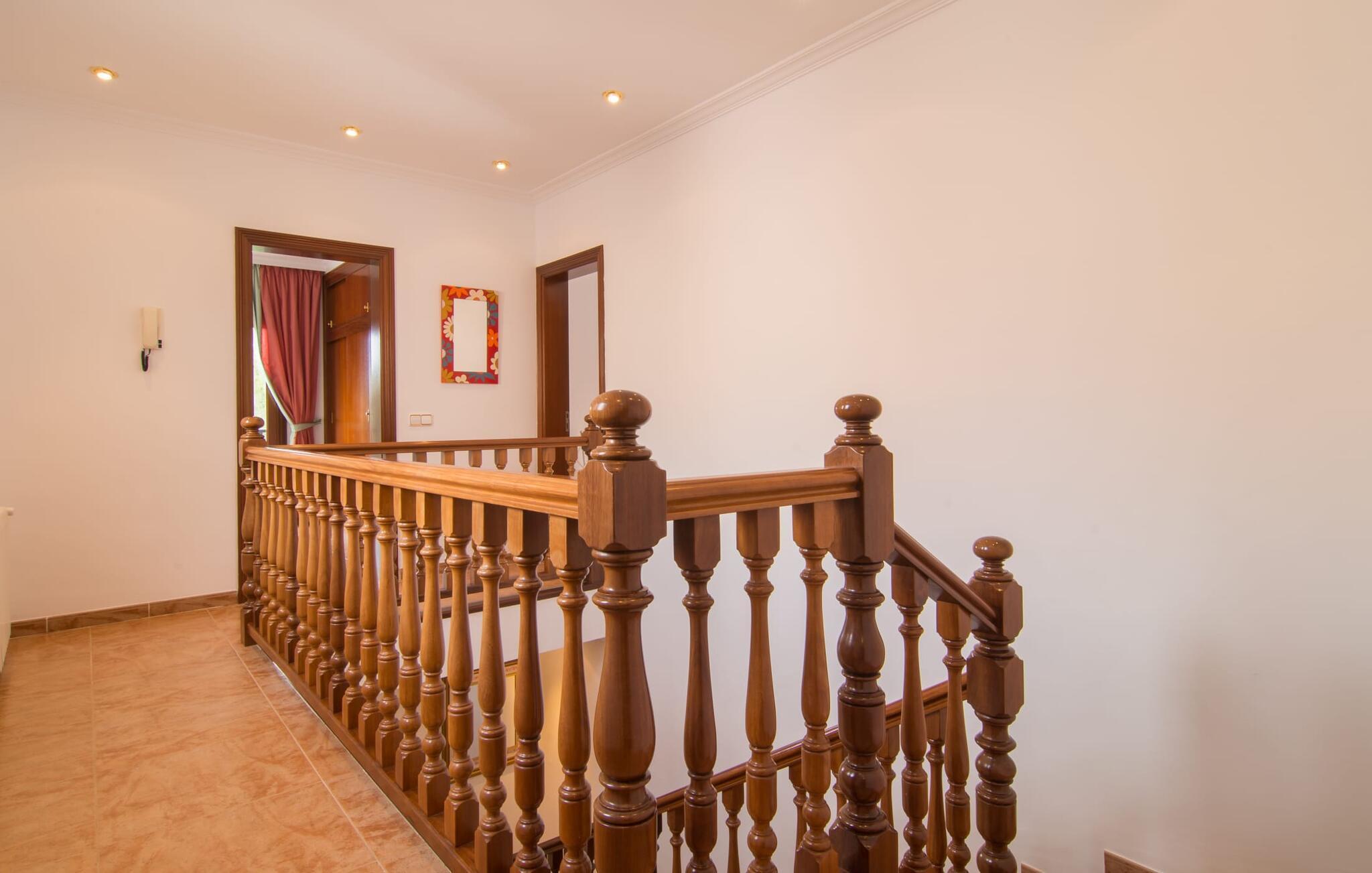 Uanset hvor moderne den indbydende villa med sine mørkebrune skodder kan virke udefra; Interiøret afspejler også den typiske mallorcanske tradition med et særligt spændende stemning. Værelserne er dejligt lyse, især den store stue og spisestue. Den separate cocina i hvid og grå landstedsstil tilbyder alle de faciliteter, I har brug for til jeres ferie med selvforplejning med to familier og/eller en gruppe venner. Terracotta fliserne skaber en afslappet og harmonisk atmosfære, som fortsætter med nogle smagfulde dekorative elementer i soveværelser og foyer. En bred trappe med drejede trægelændere fører jer til øverste etage og yderligere tre soveværelser (det andet er i stueetagen). Alle soveværelser er udstyret med to enkeltsenge eller en dobbeltseng i et anderledes, men lige så attraktivt design. De behageligt rummelige værelser tilbyder masser af opbevaringsplads, selvom I ønsker at tilføje et par mallorcanske stykker til jeres feriegarderobe, mens I shopper. Med to bruserum og eget badeværelse med rummeligt hjørnebadekar er der ingen køer selv med otte personer.