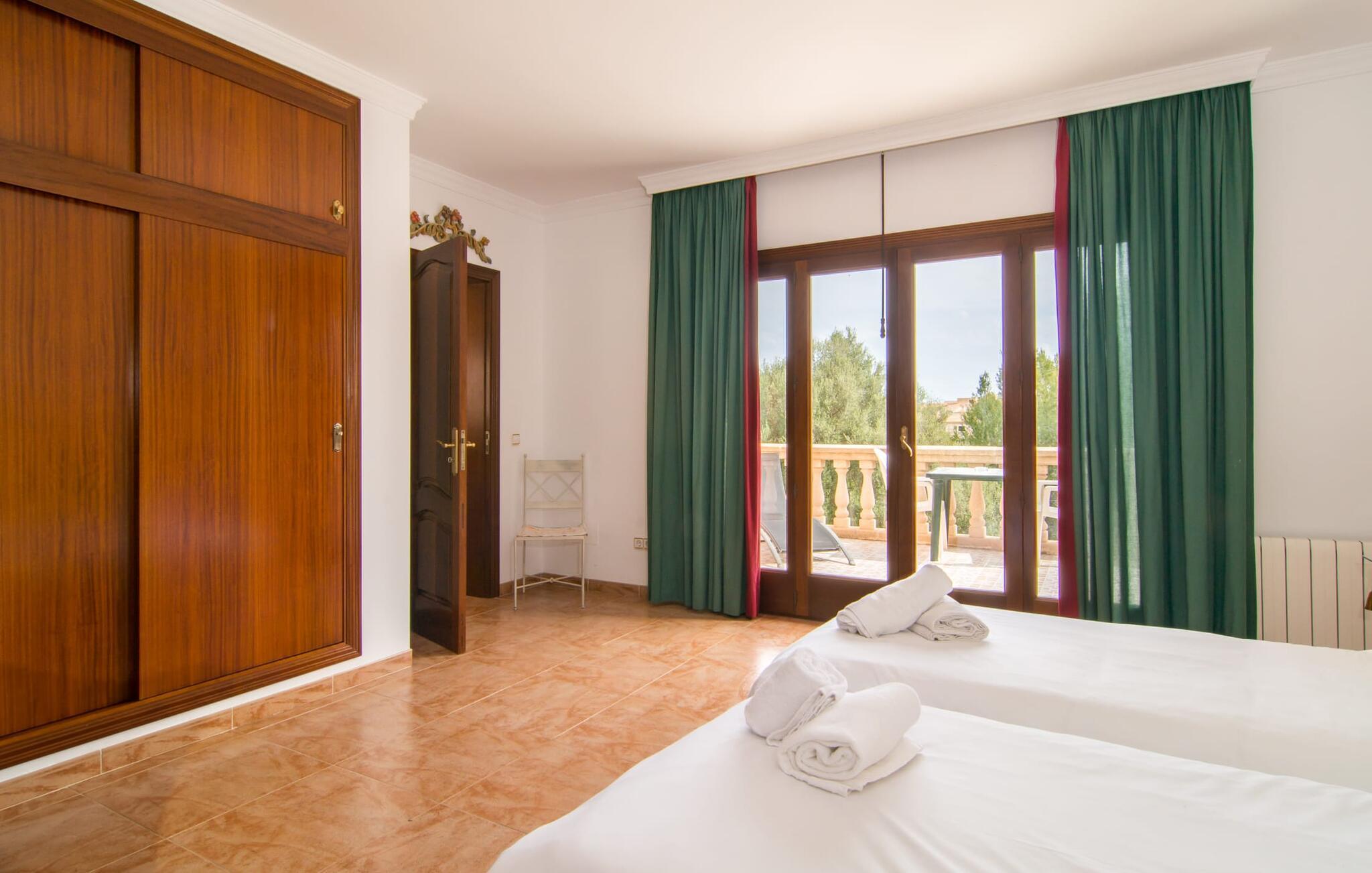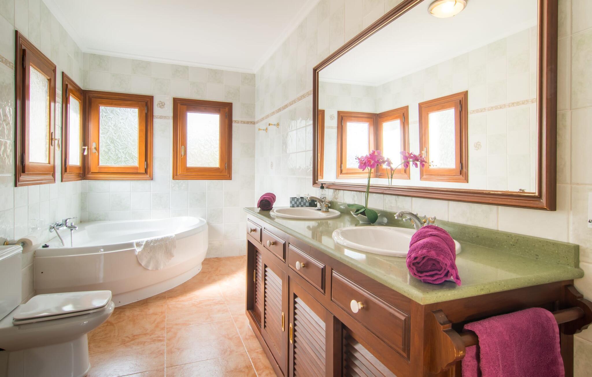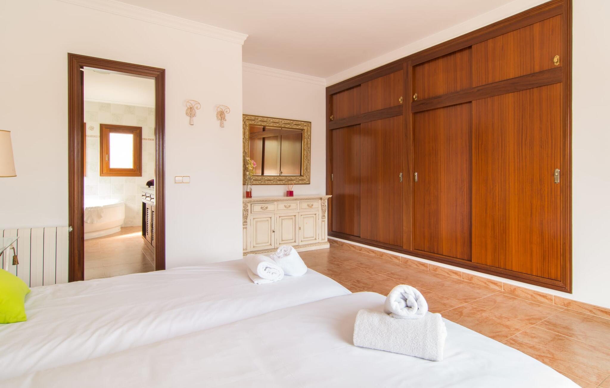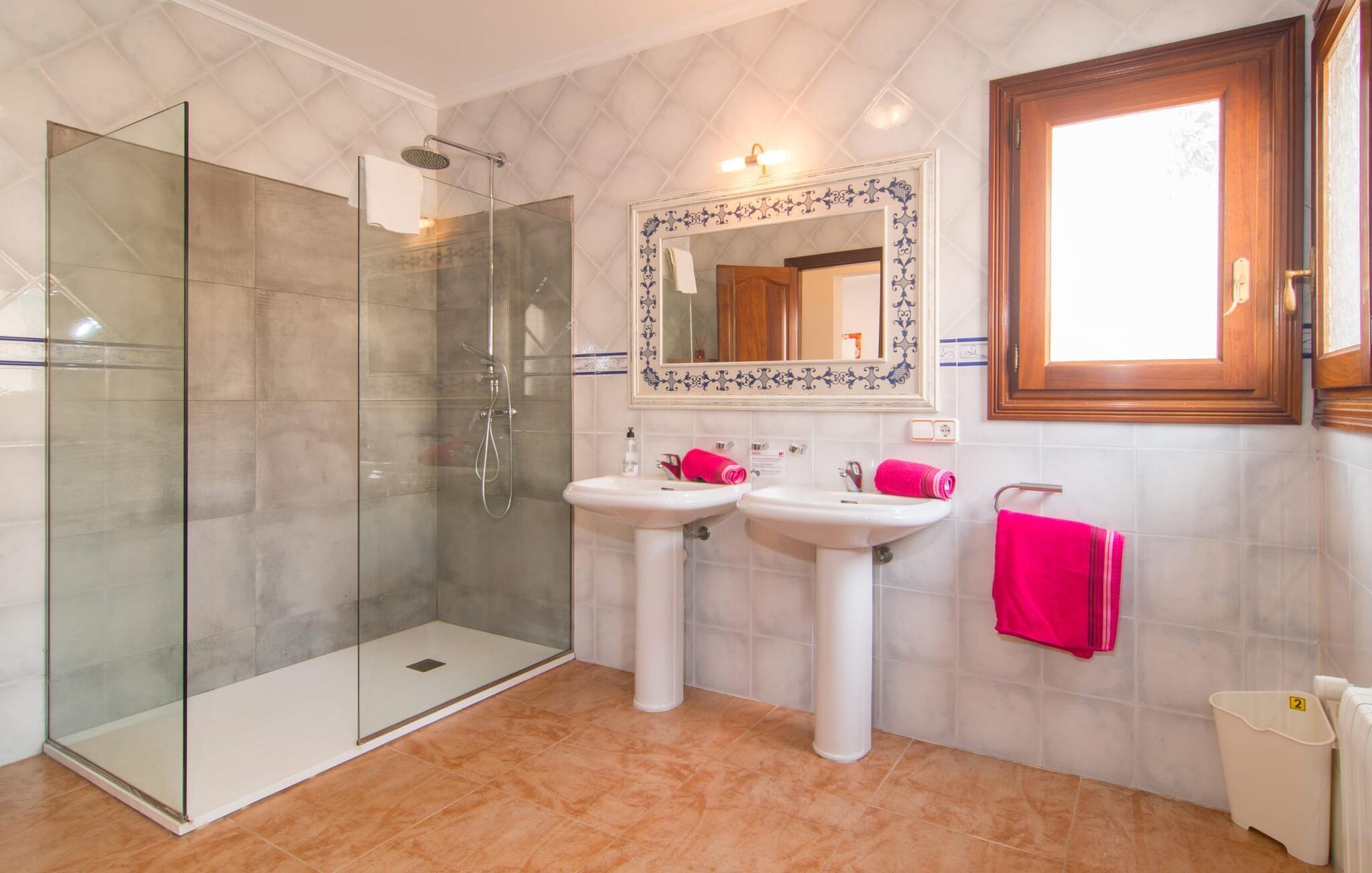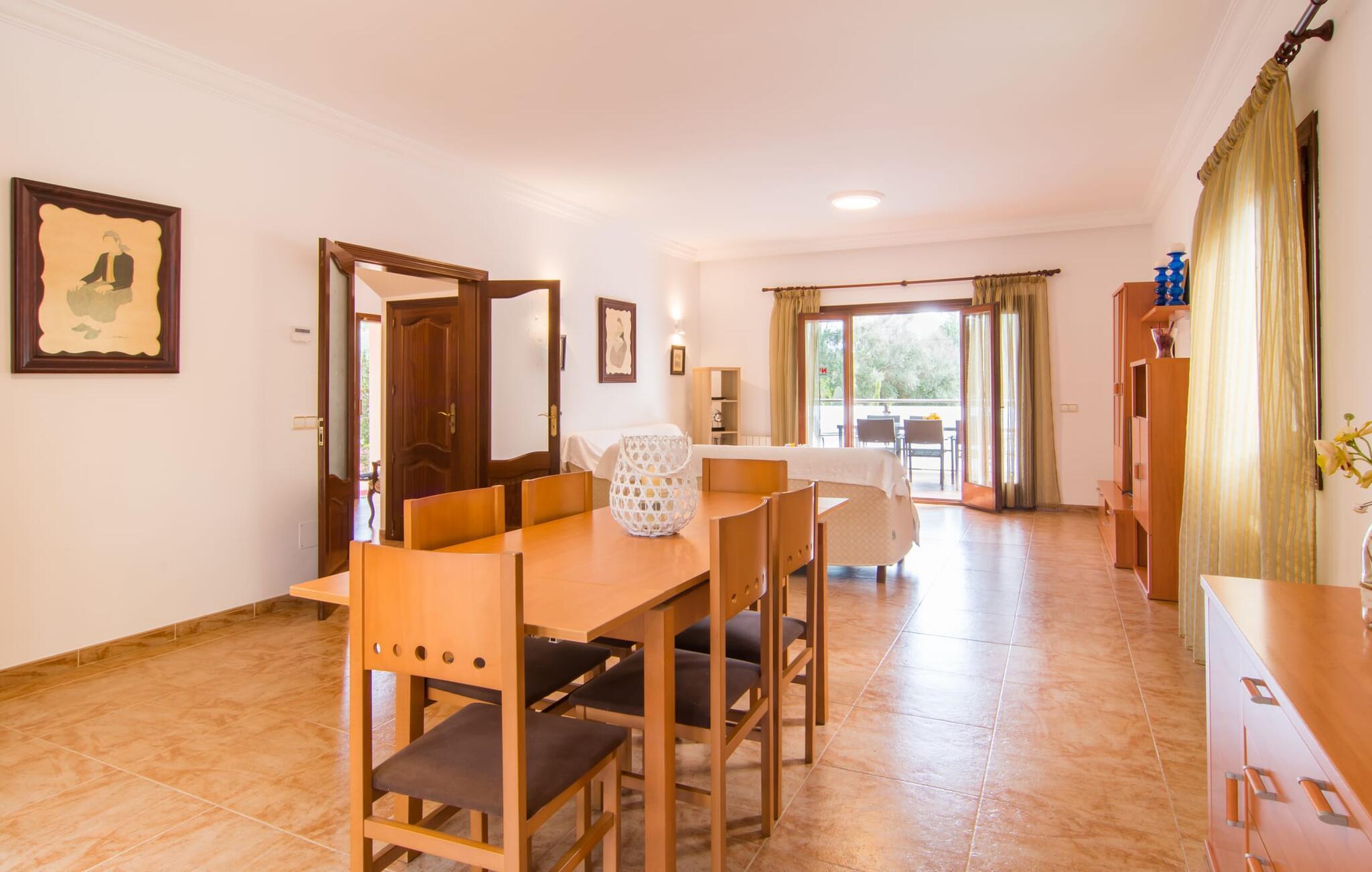 Uanset hvor moderne den indbydende villa med sine mørkebrune skodder kan virke udefra; Interiøret afspejler også den typiske mallorcanske tradition med et særligt spændende stemning. Værelserne er dejligt lyse, især den store stue og spisestue. Den separate cocina i hvid og grå landstedsstil tilbyder alle de faciliteter, I har brug for til jeres ferie med selvforplejning med to familier og/eller en gruppe venner. Terracotta fliserne skaber en afslappet og harmonisk atmosfære, som fortsætter med nogle smagfulde dekorative elementer i soveværelser og foyer. En bred trappe med drejede trægelændere fører jer til øverste etage og yderligere tre soveværelser (det andet er i stueetagen). Alle soveværelser er udstyret med to enkeltsenge eller en dobbeltseng i et anderledes, men lige så attraktivt design. De behageligt rummelige værelser tilbyder masser af opbevaringsplads, selvom I ønsker at tilføje et par mallorcanske stykker til jeres feriegarderobe, mens I shopper. Med to bruserum og eget badeværelse med rummeligt hjørnebadekar er der ingen køer selv med otte personer.