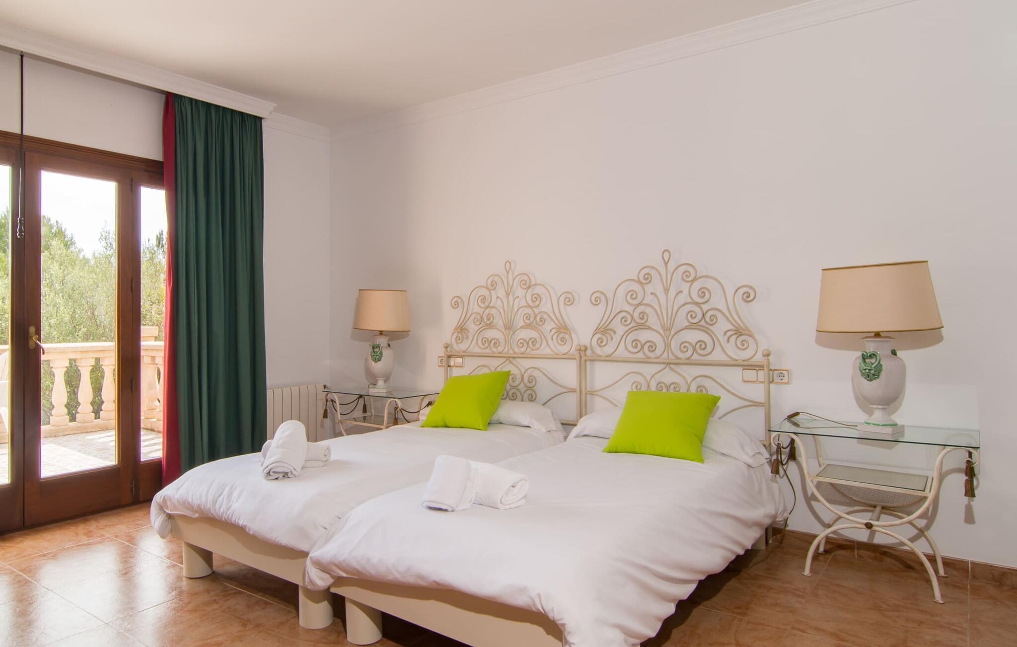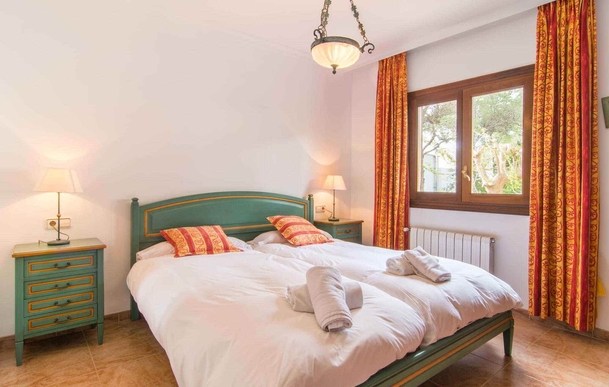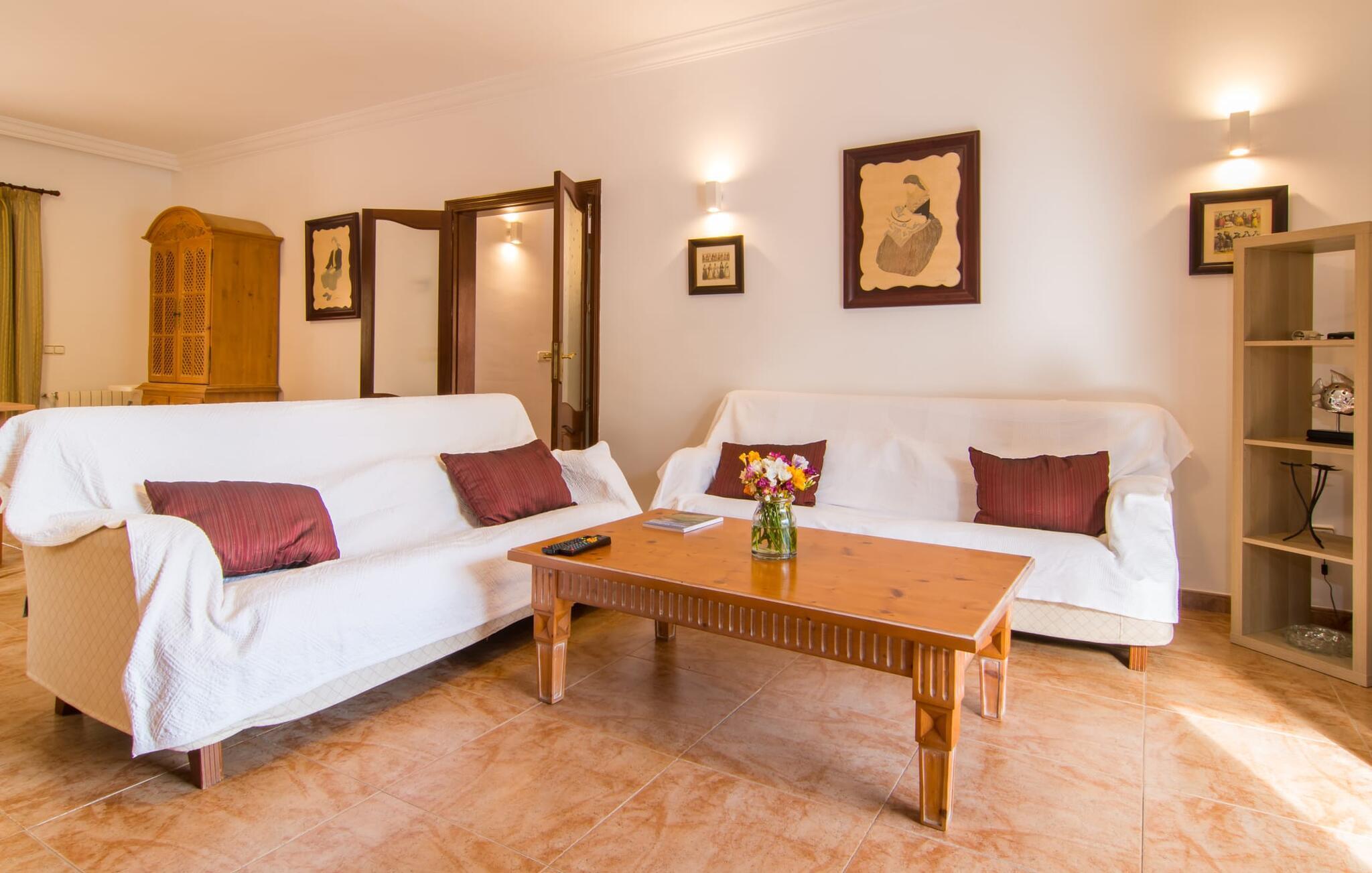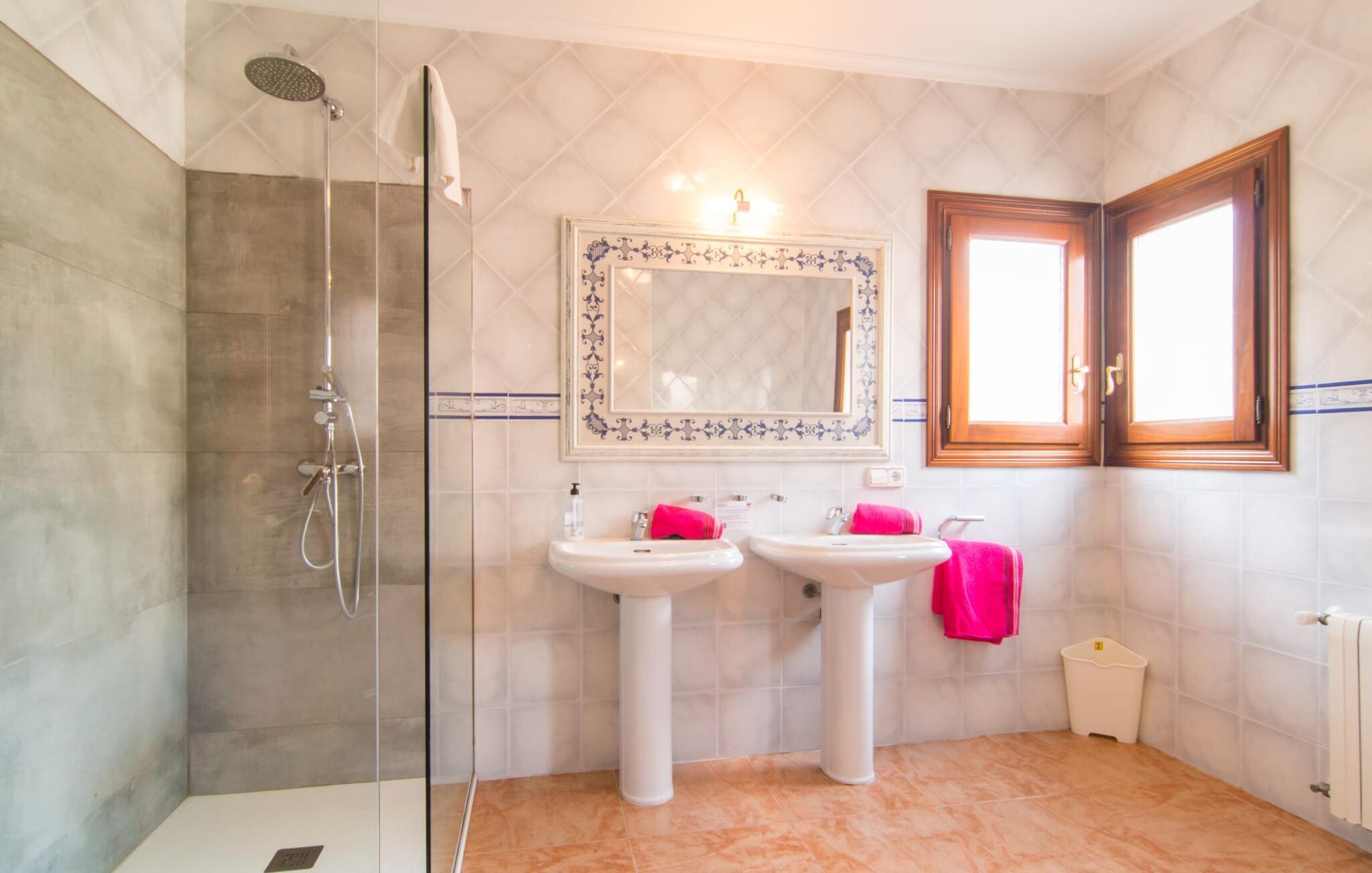 Uanset hvor moderne den indbydende villa med sine mørkebrune skodder kan virke udefra; Interiøret afspejler også den typiske mallorcanske tradition med et særligt spændende stemning. Værelserne er dejligt lyse, især den store stue og spisestue. Den separate cocina i hvid og grå landstedsstil tilbyder alle de faciliteter, I har brug for til jeres ferie med selvforplejning med to familier og/eller en gruppe venner. Terracotta fliserne skaber en afslappet og harmonisk atmosfære, som fortsætter med nogle smagfulde dekorative elementer i soveværelser og foyer. En bred trappe med drejede trægelændere fører jer til øverste etage og yderligere tre soveværelser (det andet er i stueetagen). Alle soveværelser er udstyret med to enkeltsenge eller en dobbeltseng i et anderledes, men lige så attraktivt design. De behageligt rummelige værelser tilbyder masser af opbevaringsplads, selvom I ønsker at tilføje et par mallorcanske stykker til jeres feriegarderobe, mens I shopper. Med to bruserum og eget badeværelse med rummeligt hjørnebadekar er der ingen køer selv med otte personer.