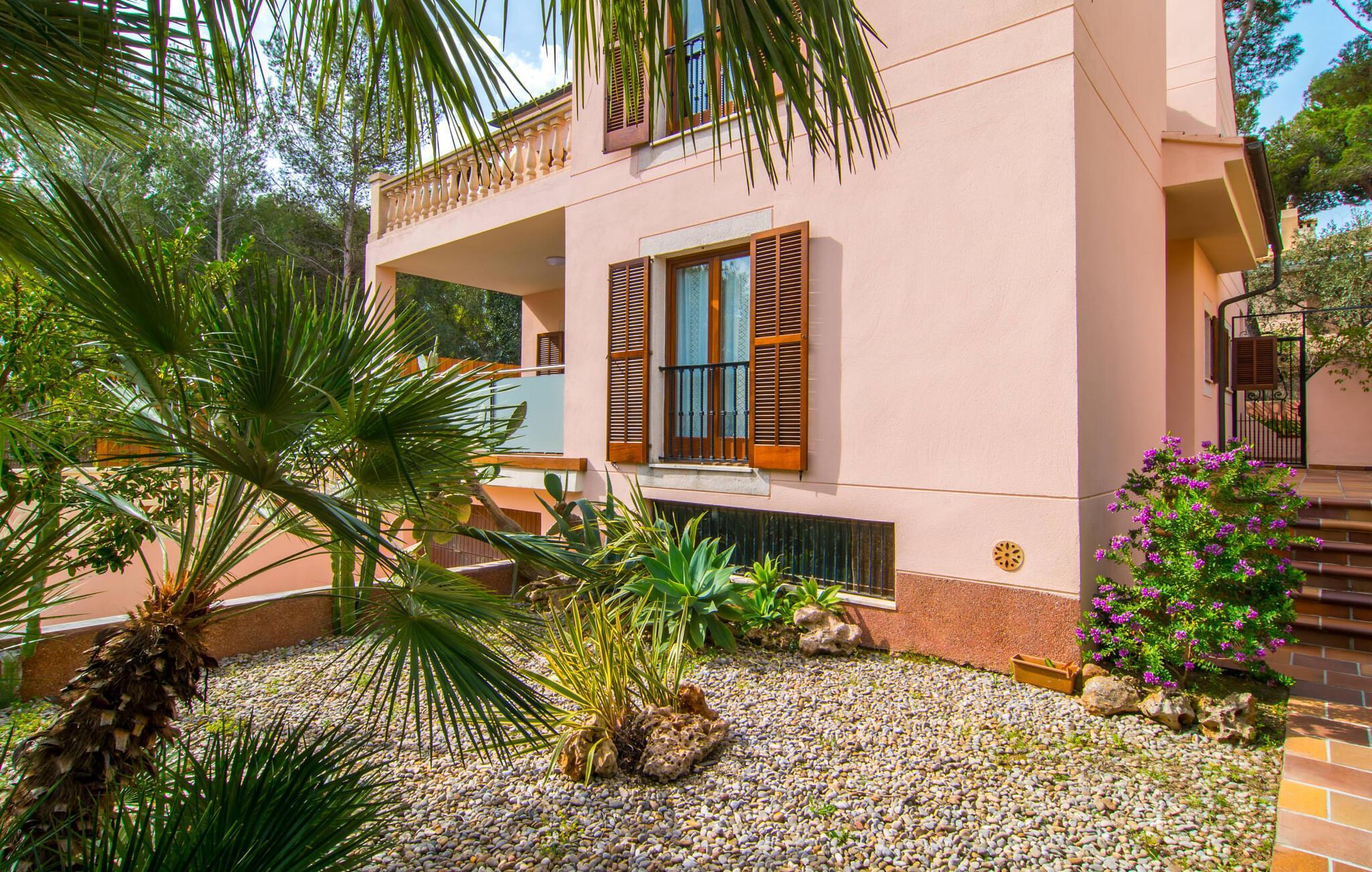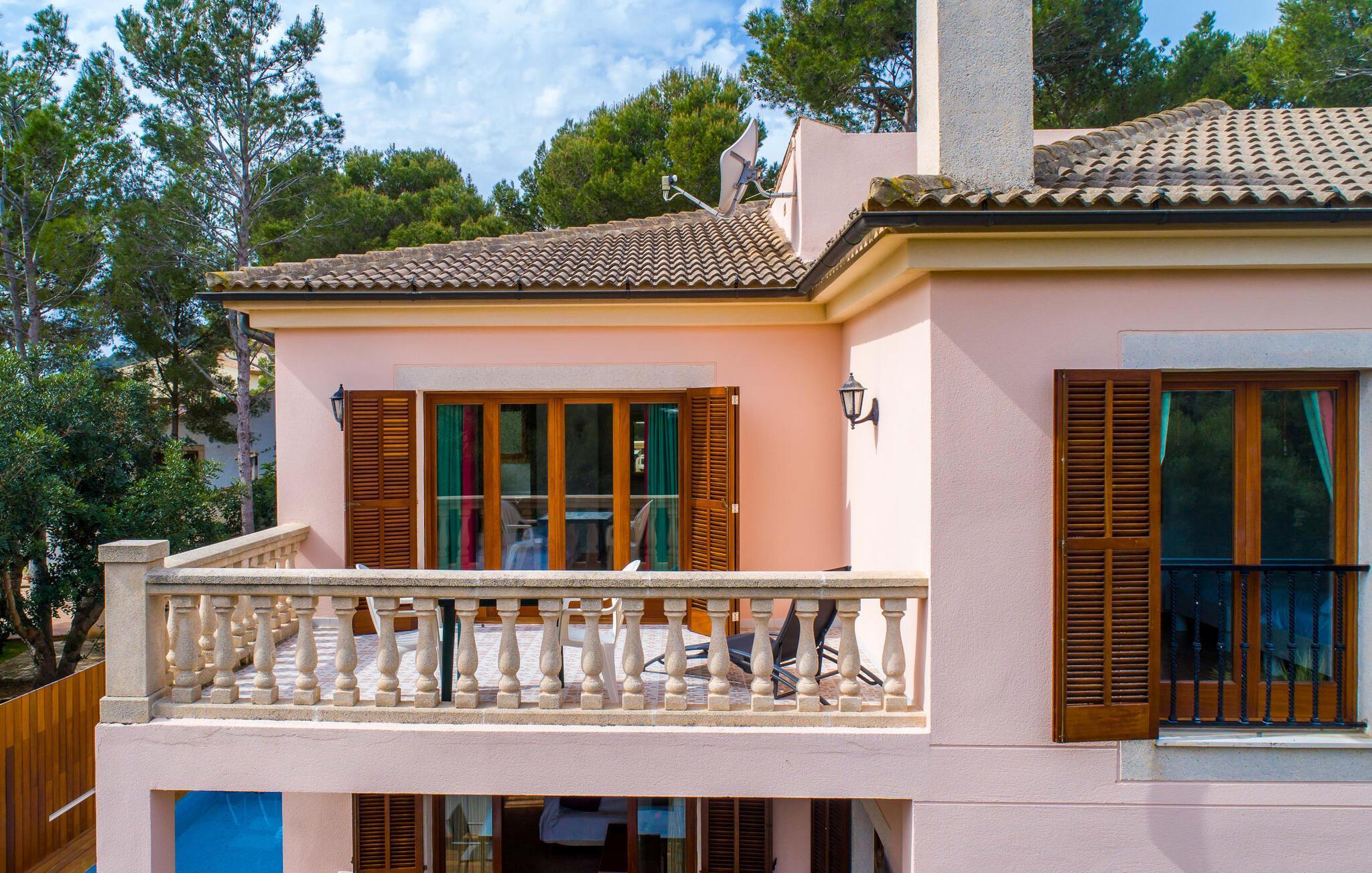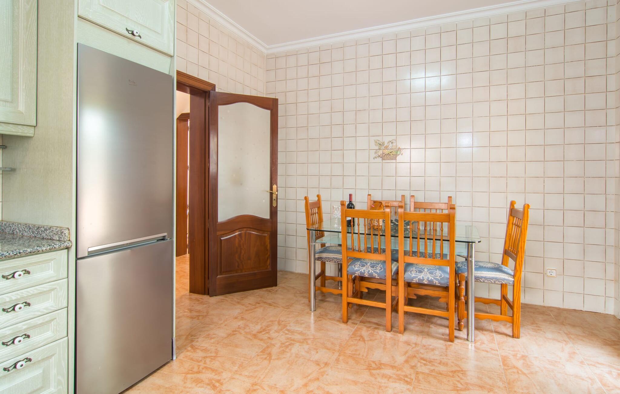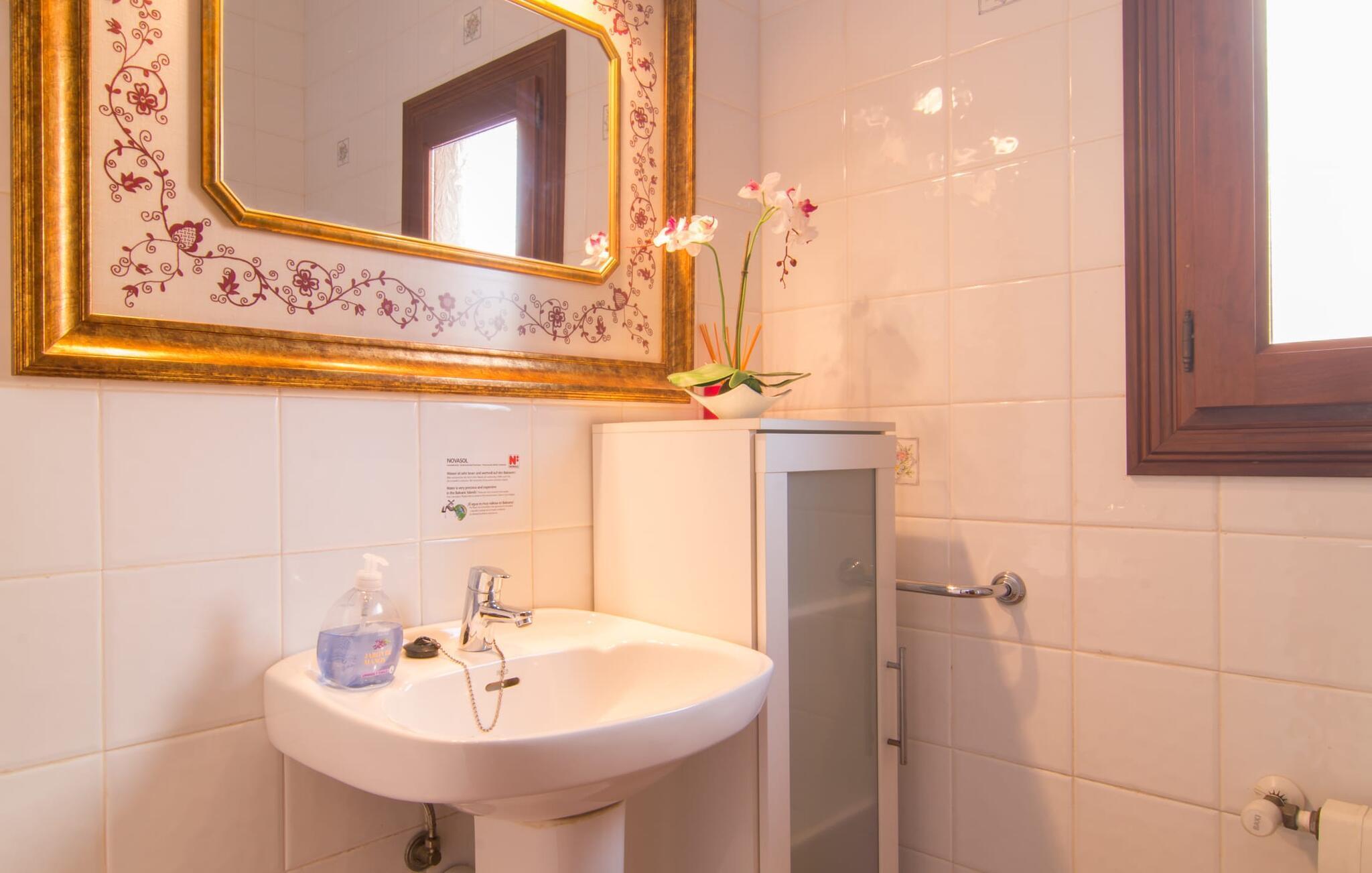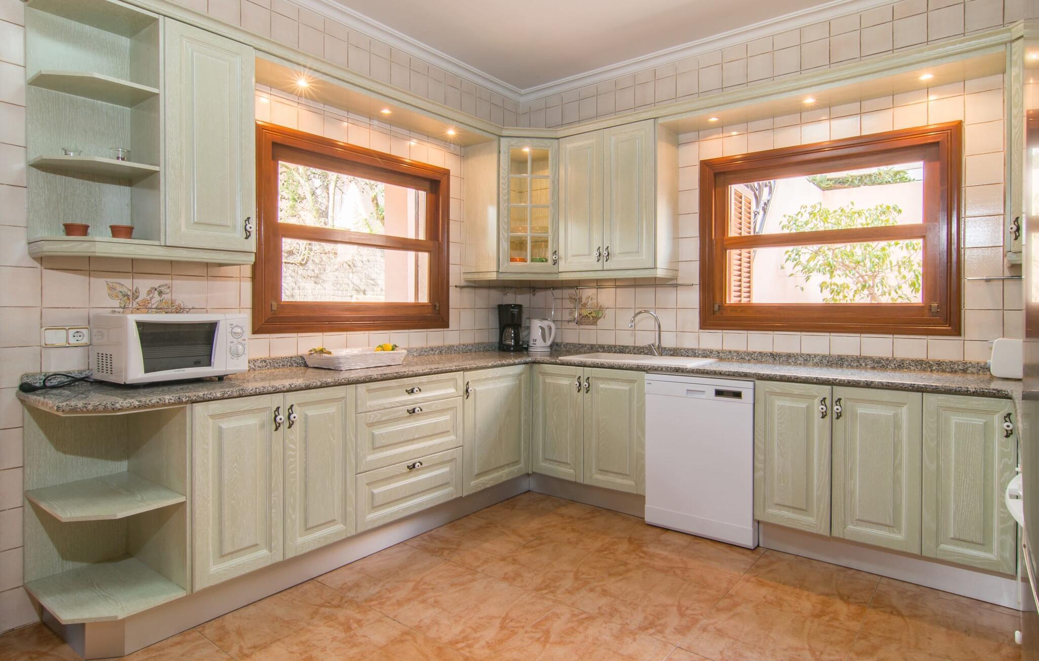 Uanset hvor moderne den indbydende villa med sine mørkebrune skodder kan virke udefra; Interiøret afspejler også den typiske mallorcanske tradition med et særligt spændende stemning. Værelserne er dejligt lyse, især den store stue og spisestue. Den separate cocina i hvid og grå landstedsstil tilbyder alle de faciliteter, I har brug for til jeres ferie med selvforplejning med to familier og/eller en gruppe venner. Terracotta fliserne skaber en afslappet og harmonisk atmosfære, som fortsætter med nogle smagfulde dekorative elementer i soveværelser og foyer. En bred trappe med drejede trægelændere fører jer til øverste etage og yderligere tre soveværelser (det andet er i stueetagen). Alle soveværelser er udstyret med to enkeltsenge eller en dobbeltseng i et anderledes, men lige så attraktivt design. De behageligt rummelige værelser tilbyder masser af opbevaringsplads, selvom I ønsker at tilføje et par mallorcanske stykker til jeres feriegarderobe, mens I shopper. Med to bruserum og eget badeværelse med rummeligt hjørnebadekar er der ingen køer selv med otte personer.
