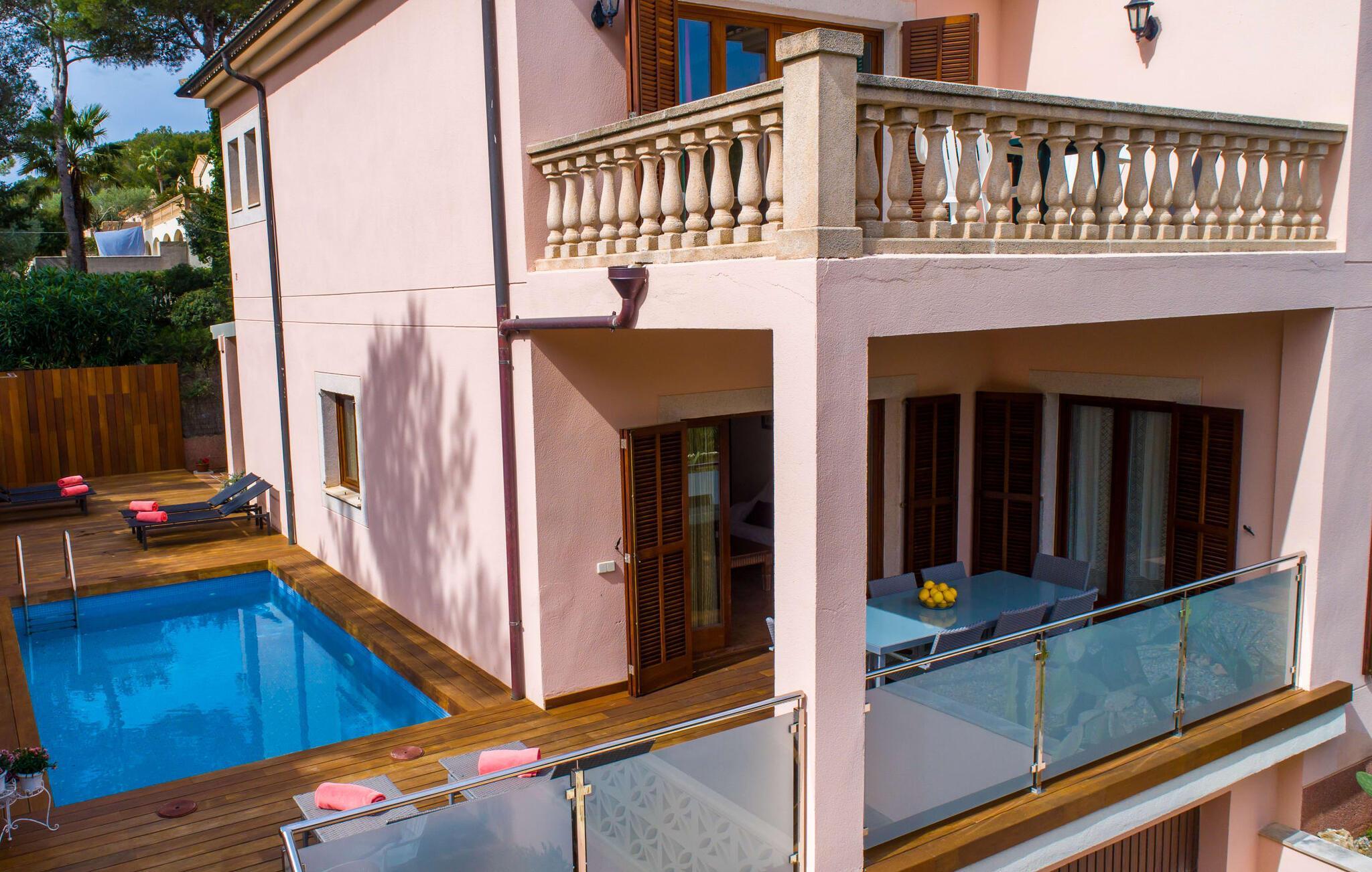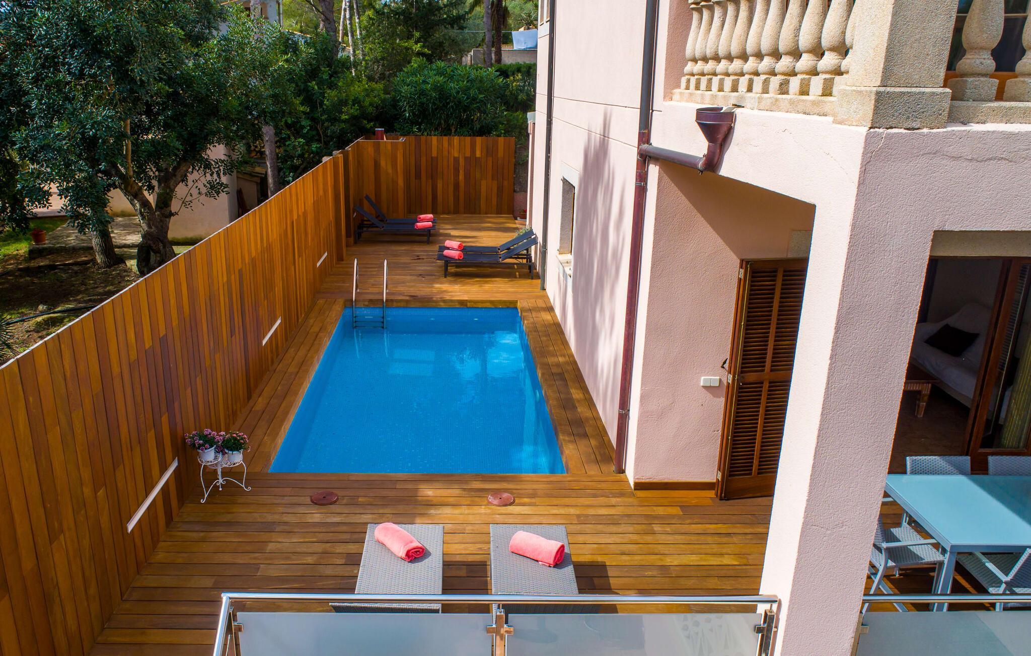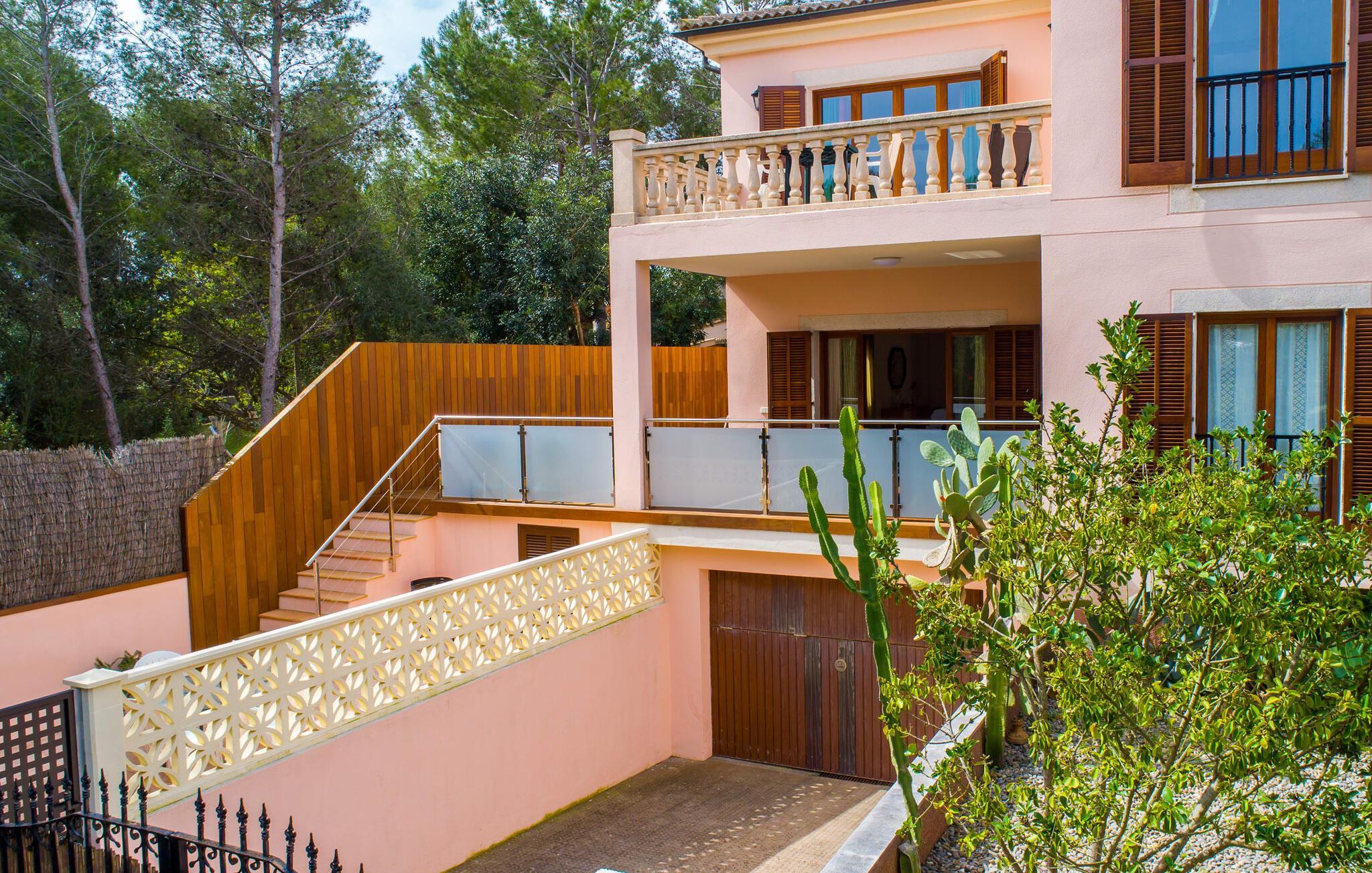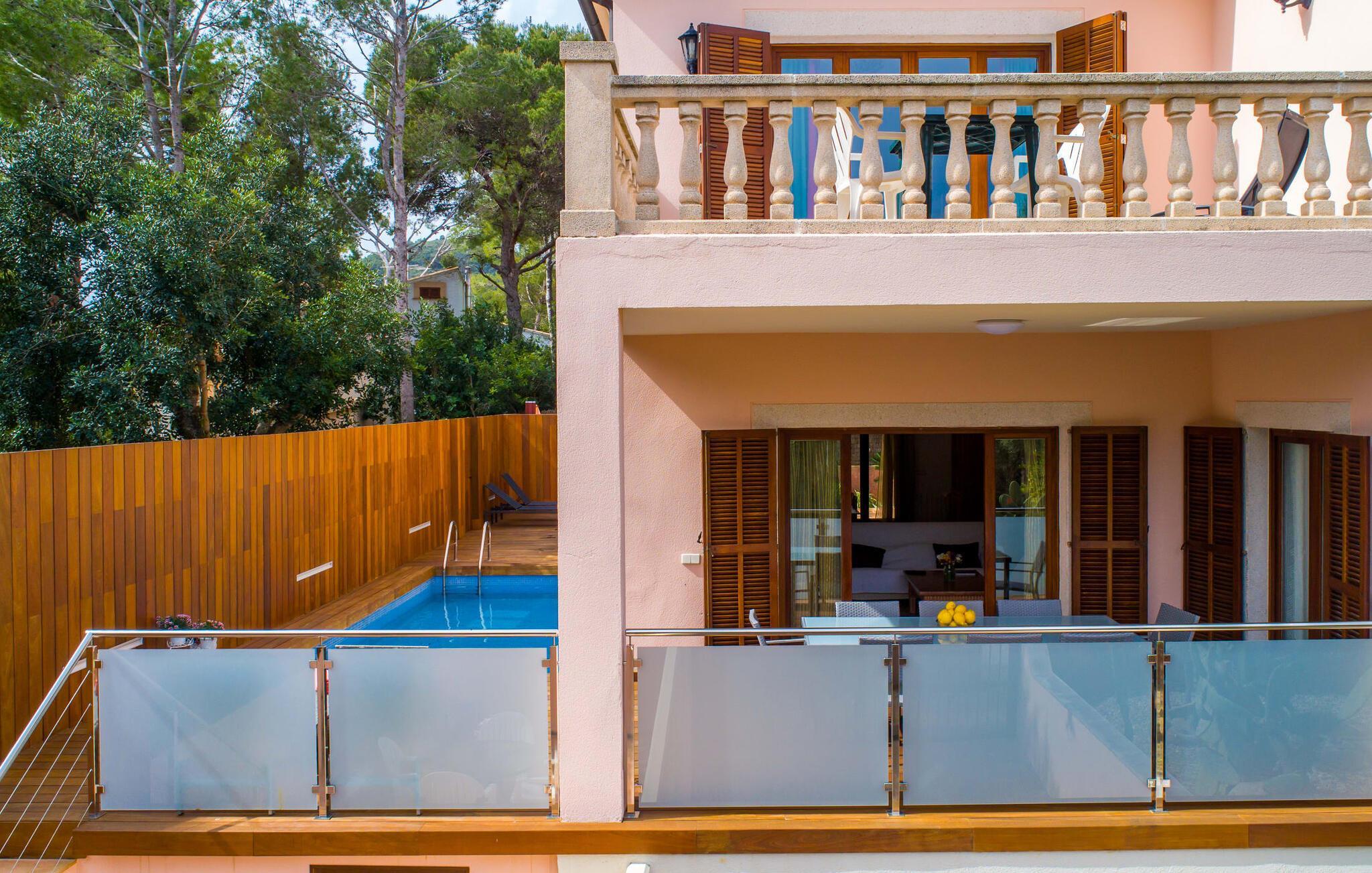 Uanset hvor moderne den indbydende villa med sine mørkebrune skodder kan virke udefra; Interiøret afspejler også den typiske mallorcanske tradition med et særligt spændende stemning. Værelserne er dejligt lyse, især den store stue og spisestue. Den separate cocina i hvid og grå landstedsstil tilbyder alle de faciliteter, I har brug for til jeres ferie med selvforplejning med to familier og/eller en gruppe venner. Terracotta fliserne skaber en afslappet og harmonisk atmosfære, som fortsætter med nogle smagfulde dekorative elementer i soveværelser og foyer. En bred trappe med drejede trægelændere fører jer til øverste etage og yderligere tre soveværelser (det andet er i stueetagen). Alle soveværelser er udstyret med to enkeltsenge eller en dobbeltseng i et anderledes, men lige så attraktivt design. De behageligt rummelige værelser tilbyder masser af opbevaringsplads, selvom I ønsker at tilføje et par mallorcanske stykker til jeres feriegarderobe, mens I shopper. Med to bruserum og eget badeværelse med rummeligt hjørnebadekar er der ingen køer selv med otte personer.