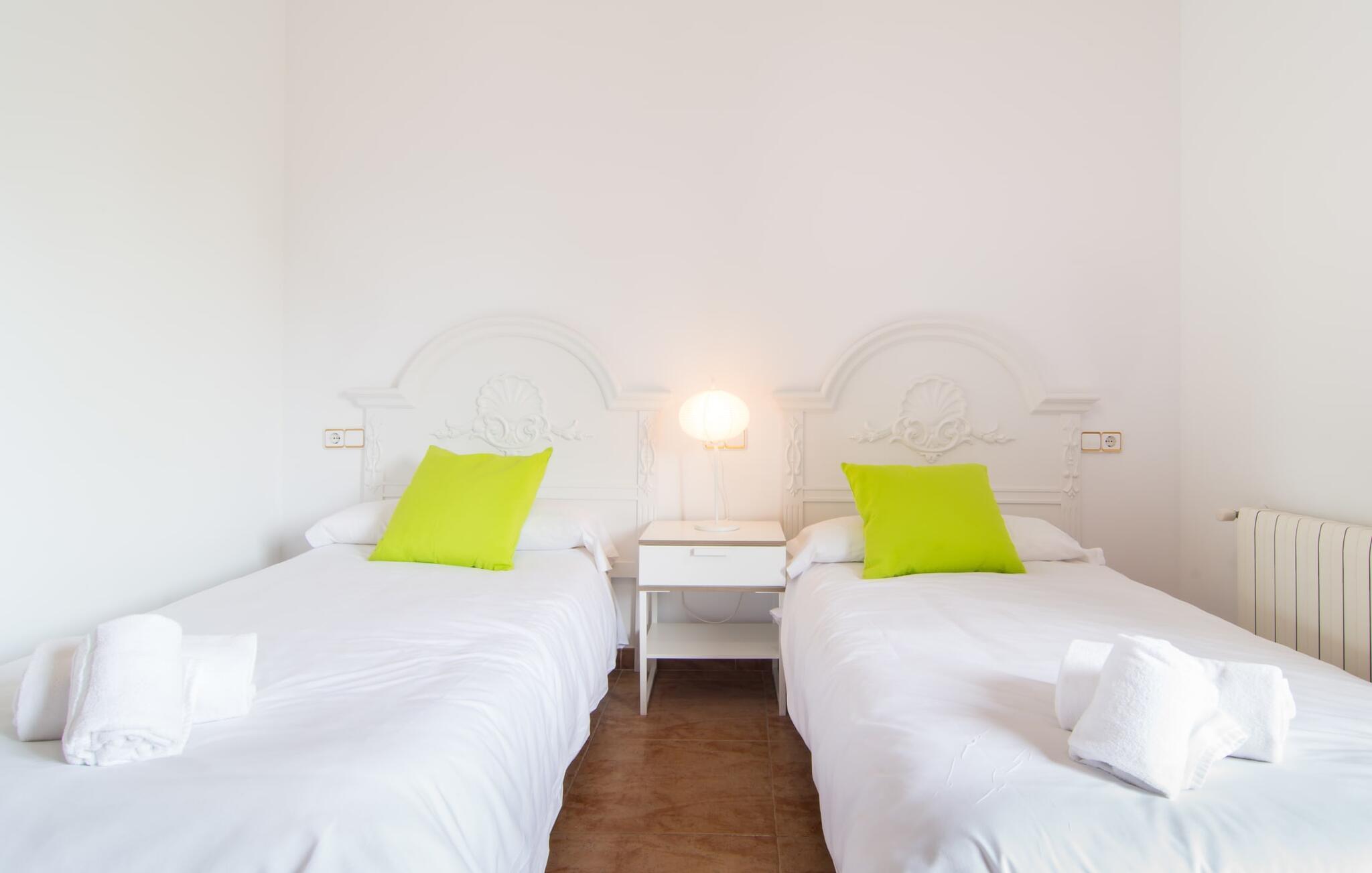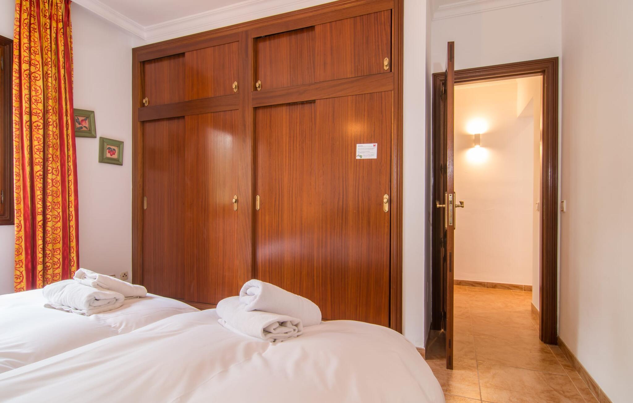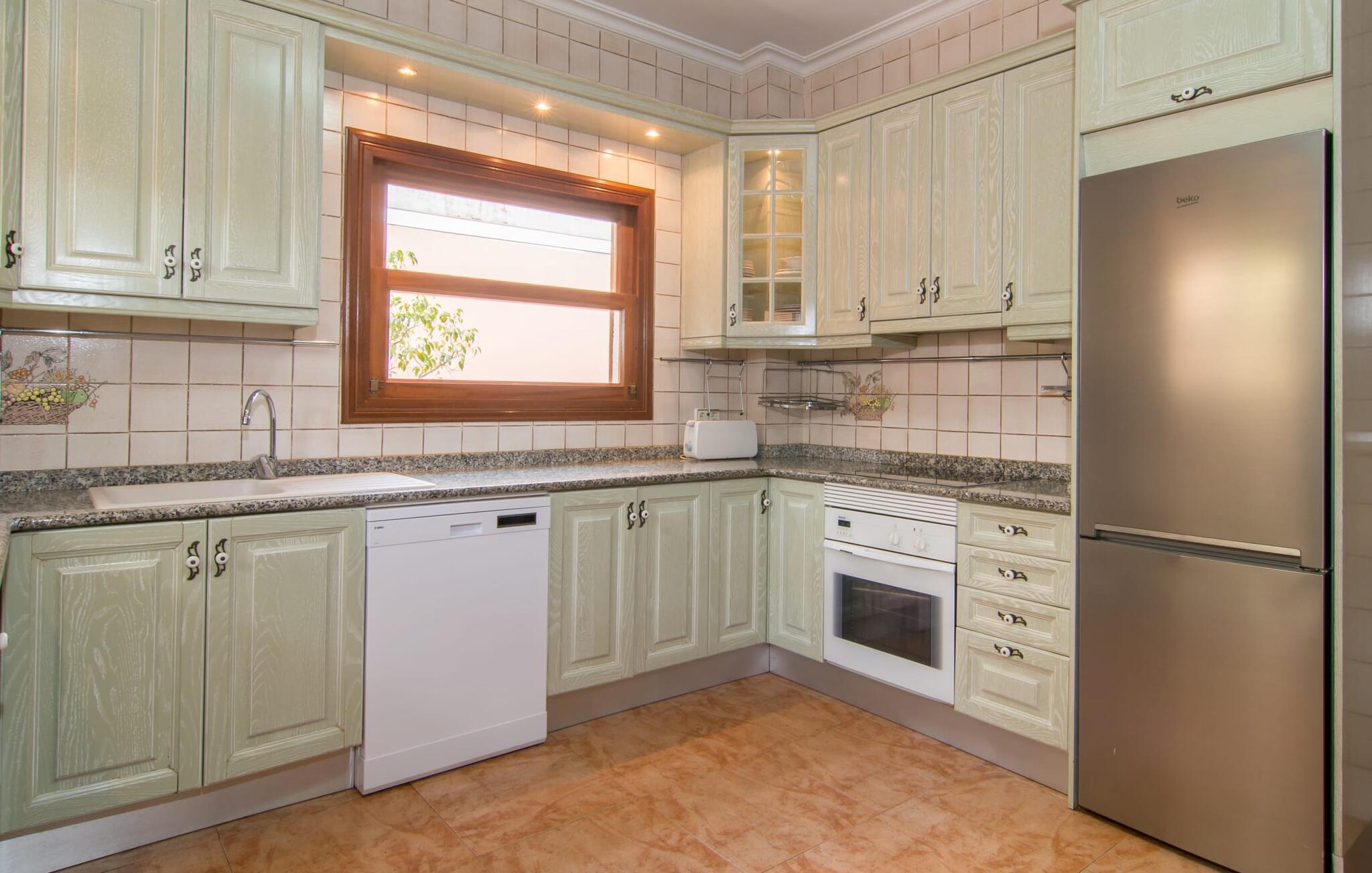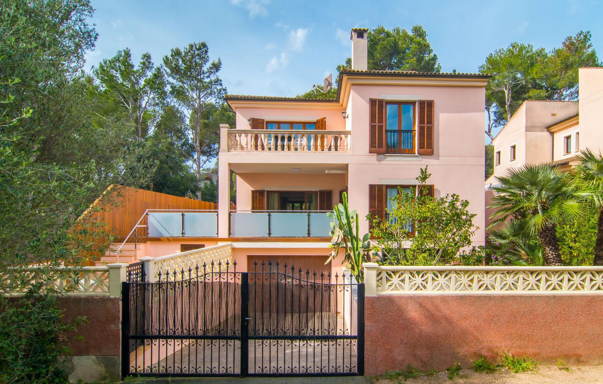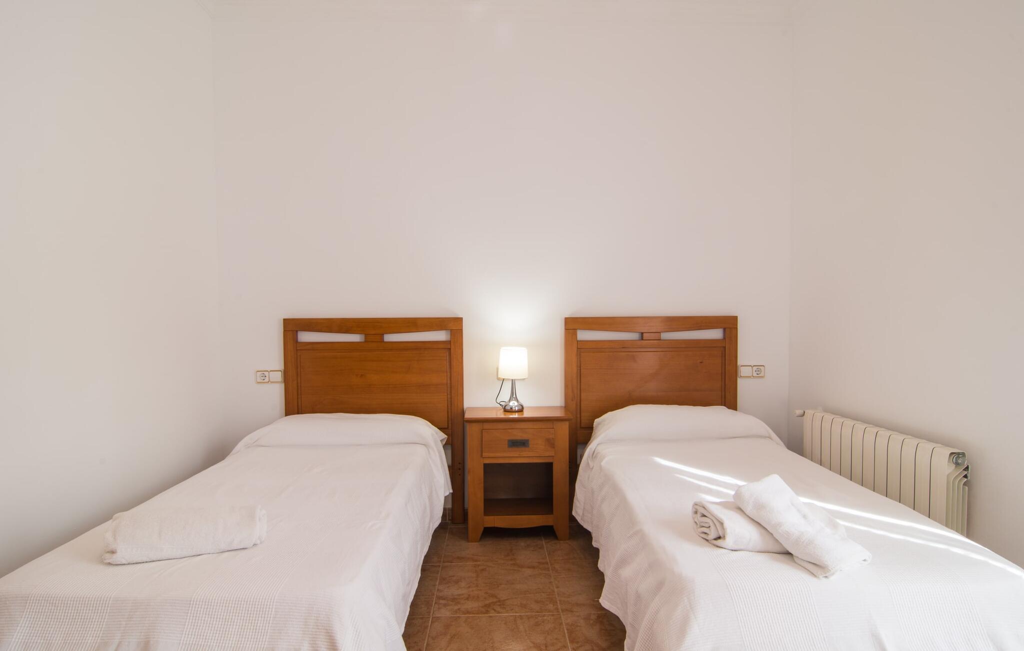 Uanset hvor moderne den indbydende villa med sine mørkebrune skodder kan virke udefra; Interiøret afspejler også den typiske mallorcanske tradition med et særligt spændende stemning. Værelserne er dejligt lyse, især den store stue og spisestue. Den separate cocina i hvid og grå landstedsstil tilbyder alle de faciliteter, I har brug for til jeres ferie med selvforplejning med to familier og/eller en gruppe venner. Terracotta fliserne skaber en afslappet og harmonisk atmosfære, som fortsætter med nogle smagfulde dekorative elementer i soveværelser og foyer. En bred trappe med drejede trægelændere fører jer til øverste etage og yderligere tre soveværelser (det andet er i stueetagen). Alle soveværelser er udstyret med to enkeltsenge eller en dobbeltseng i et anderledes, men lige så attraktivt design. De behageligt rummelige værelser tilbyder masser af opbevaringsplads, selvom I ønsker at tilføje et par mallorcanske stykker til jeres feriegarderobe, mens I shopper. Med to bruserum og eget badeværelse med rummeligt hjørnebadekar er der ingen køer selv med otte personer.