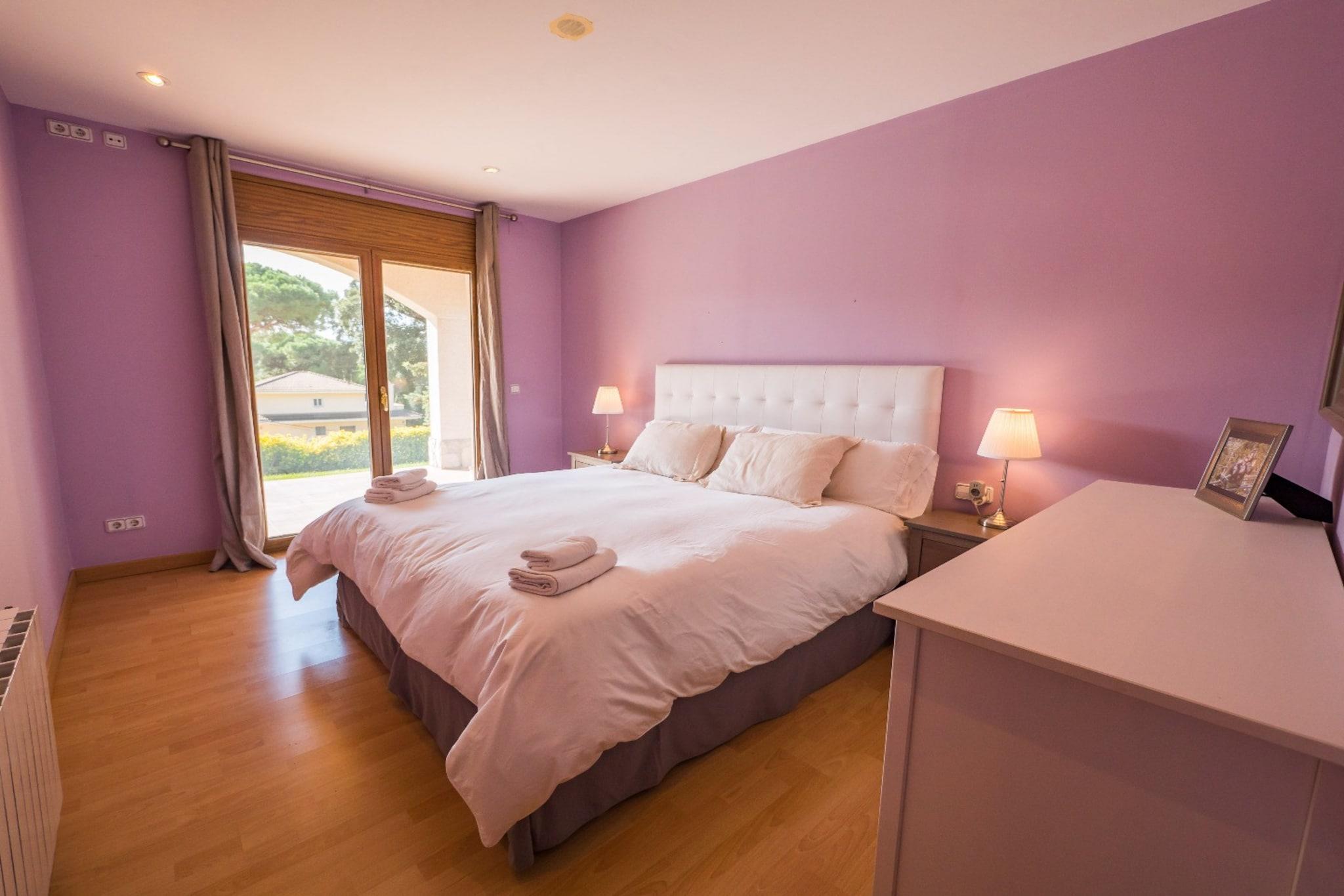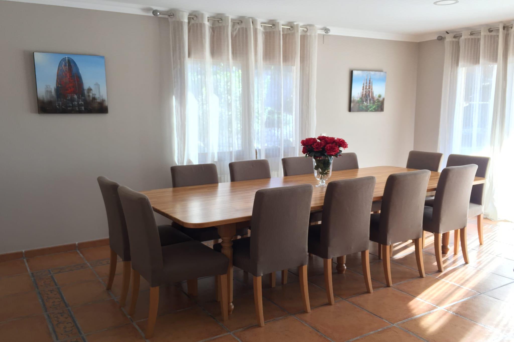 Dette rummelige og stilfulde feriehus ligger i det fredelige boligområde Mas Mora, Tordera. Kun en kort køretur fra de pulserende byer Blanes og Lloret de Mar tilbyder det nem adgang til de fantastiske strande på Costa Brava. Med 350 m² boligareal kan denne villa komfortabelt rumme op til 12 gæster fordelt på seks soveværelser - fem dobbeltværelser og et værelse med to enkeltsenge - hvilket gør den ideel til store familier eller grupper, der søger en afslappende ferie. Villaens udendørsområde er et sandt højdepunkt med en privat saltvandspool (7m x 4m), en grill og et dedikeret udendørs spiseområde, der er perfekt til at nyde måltider under åben himmel. Indenfor finder du en stor, komfortabel opholds- og spisestue med en hyggelig pejs, et fuldt udstyret køkken, tre badeværelser og masser af underholdningsmuligheder, herunder et spillerum, bordtennisbord og fitnesscenter. Parkering til tre køretøjer og gratis Wi-Fi sikrer bekvemmelighed under hele dit ophold. Villa Kiros er forpligtet til bæredygtighed og minimerer miljøpåvirkningen ved at maksimere naturressourcerne og fremme genbrug. Beliggende kun en time fra Barcelona og 20 minutter fra Girona, er den perfekt placeret til at udforske regionens attraktioner. Bemærk venligst, at villaen kun byder familier og modne grupper (25+) velkommen, og kæledyr, rygning eller fester er ikke tilladt, hvilket sikrer en fredelig atmosfære for alle gæster.
