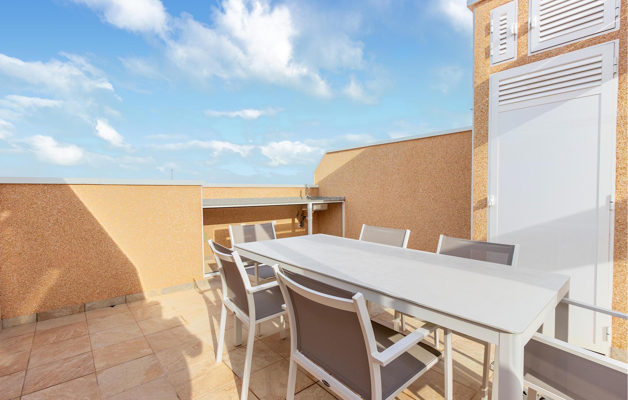 De private terrasser, både i stueetagen og på øverste etage, er perfekte til fælles måltider eller afslapning. Begynd dagen med en friskbrygget kaffe og nyd de smukke solopgange, der giver jeres ferie en magisk begyndelse. Tag en forfriskende dukkert i den store fælles pool eller gå en kort tur til Middelhavet for en badeoplevelse ved de kridhvide sandstrande.