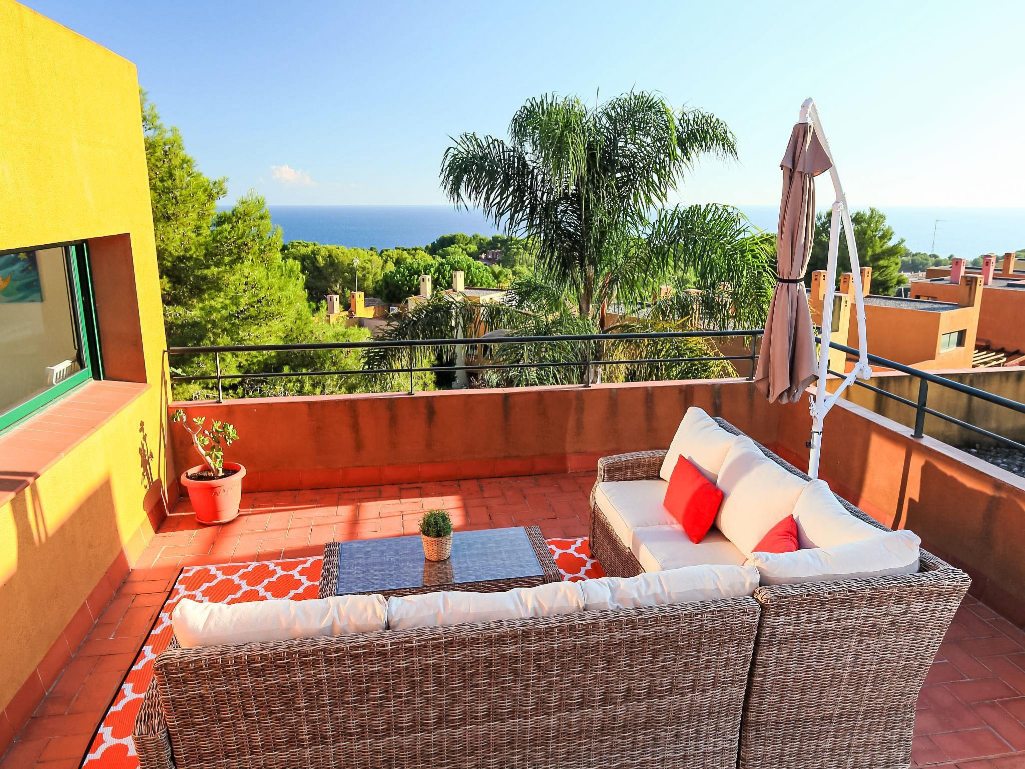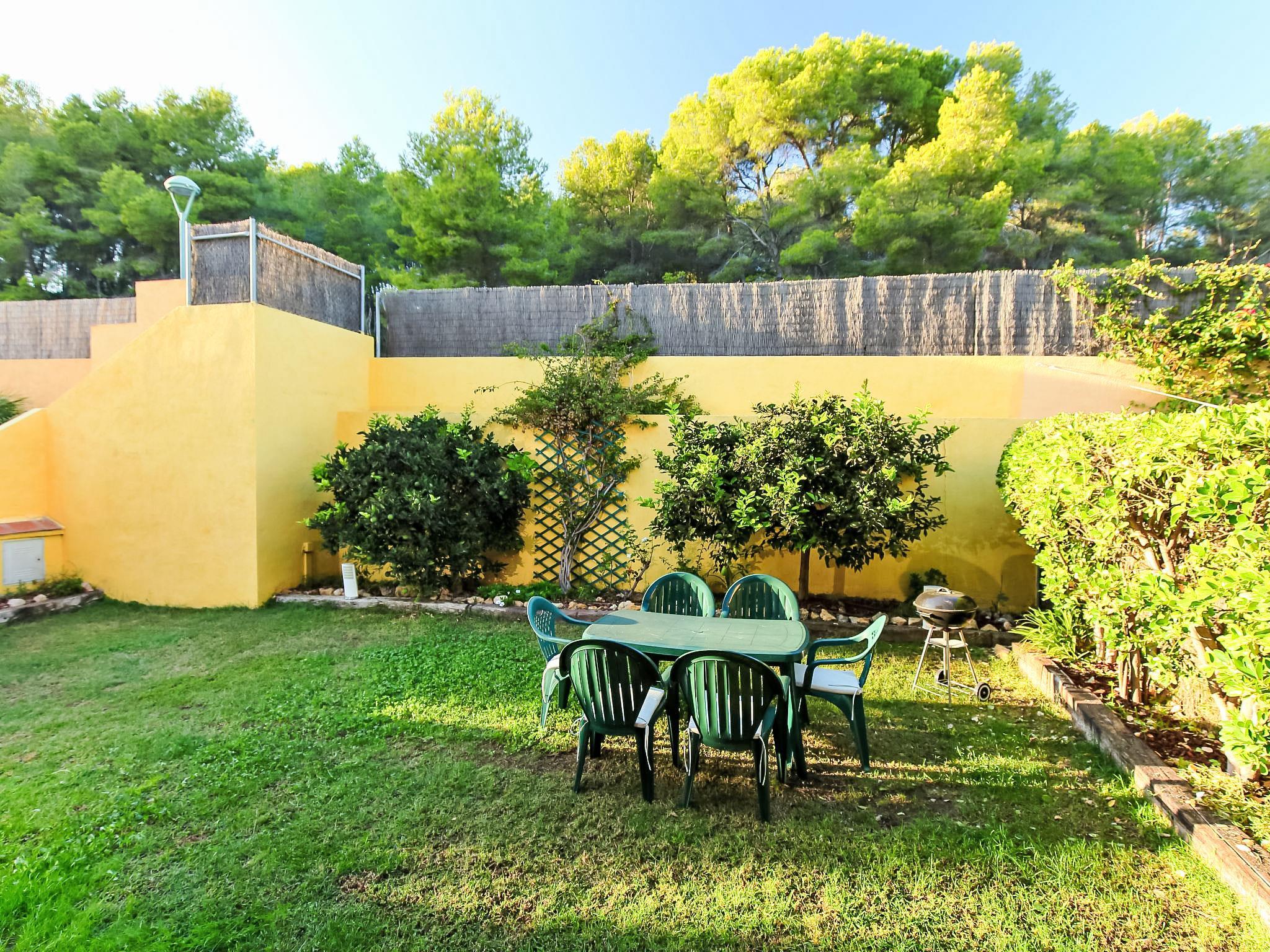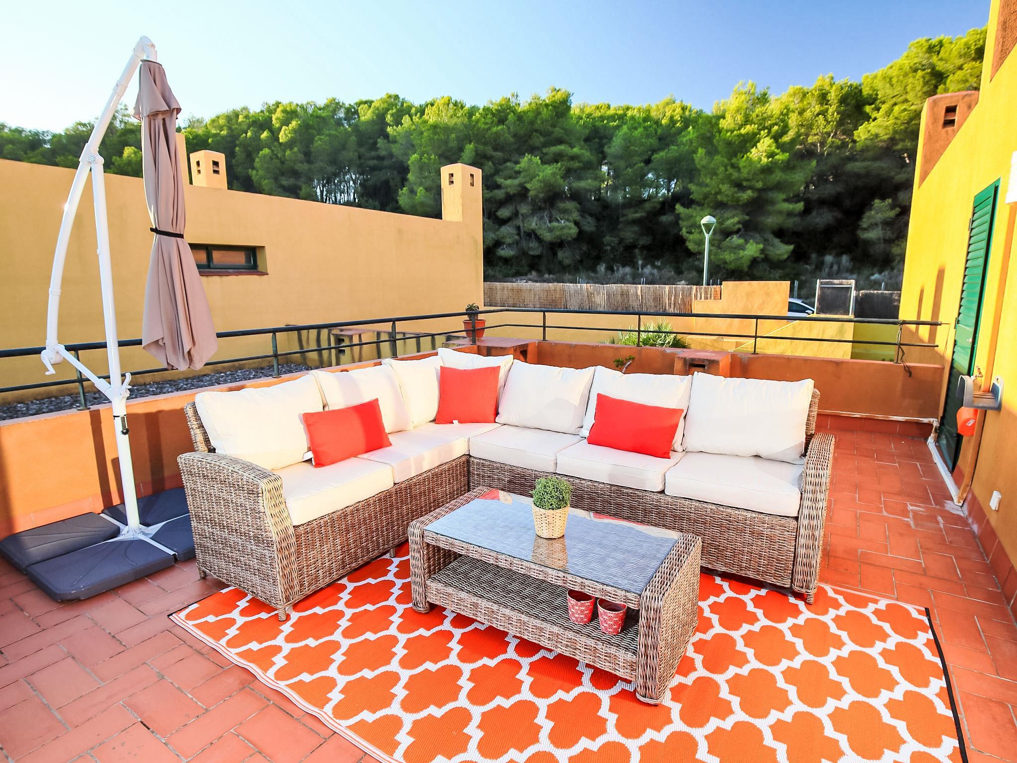 Tamarit 13 km from Tarragona: Very beautiful, comfortable terraced house "Vistamar", 2 storeys, semi-detached. 20 houses in the resort. In the district of Tamarit - La Mora, outside the resort, 13 km from the centre of Tarragona, in a quiet, sunny, elevated position residential area (villas), 10 m from the edge of the forest, 1 km from the sea, 1 km from the beach, in a cul-de-sac. For shared use: garden (fenced) with lawn, swimming pool kidney-shaped (seasonal availability: 01.Jan. - 31.Dec. pool opening hours: 10:00-22:00). Outdoor shower. Private: beautiful garden with lawn and trees. In the house: WiFi. Public parking on the road. Shop 1.4 km, grocery 1.4 km, supermarket 2.3 km, shopping centre 2.3 km, restaurant 1.4 km, bar 1.4 km, bakery 1.4 km, café 1.4 km, bus stop "Passeig de l'Esquirol" 350 m, railway station "AVE Camp de Tarragona" 25 km, sandy beach "Tamarit" 1.4 km. Sports harbour 6 km, marina 6 km, golf course (19 hole) 8 km, surf school 4 km, tennis 1 km, riding stable 11 km. Nearby attractions: Port Aventura 25 km, Aquopolis 25 km, Parque de aventura Jungle Trek 200 m, Pista de básquet y fútbol 800 m. Hiking paths: El Medol 3 km. Please note: car recommended. Suitable for families, baby equipment on request (extra). The owner does not accept any youth groups. Loading and unloading of baggage is possible at the holiday house. Neighbourhood highly sensitive to noise. Quietness and good behaviour expected.