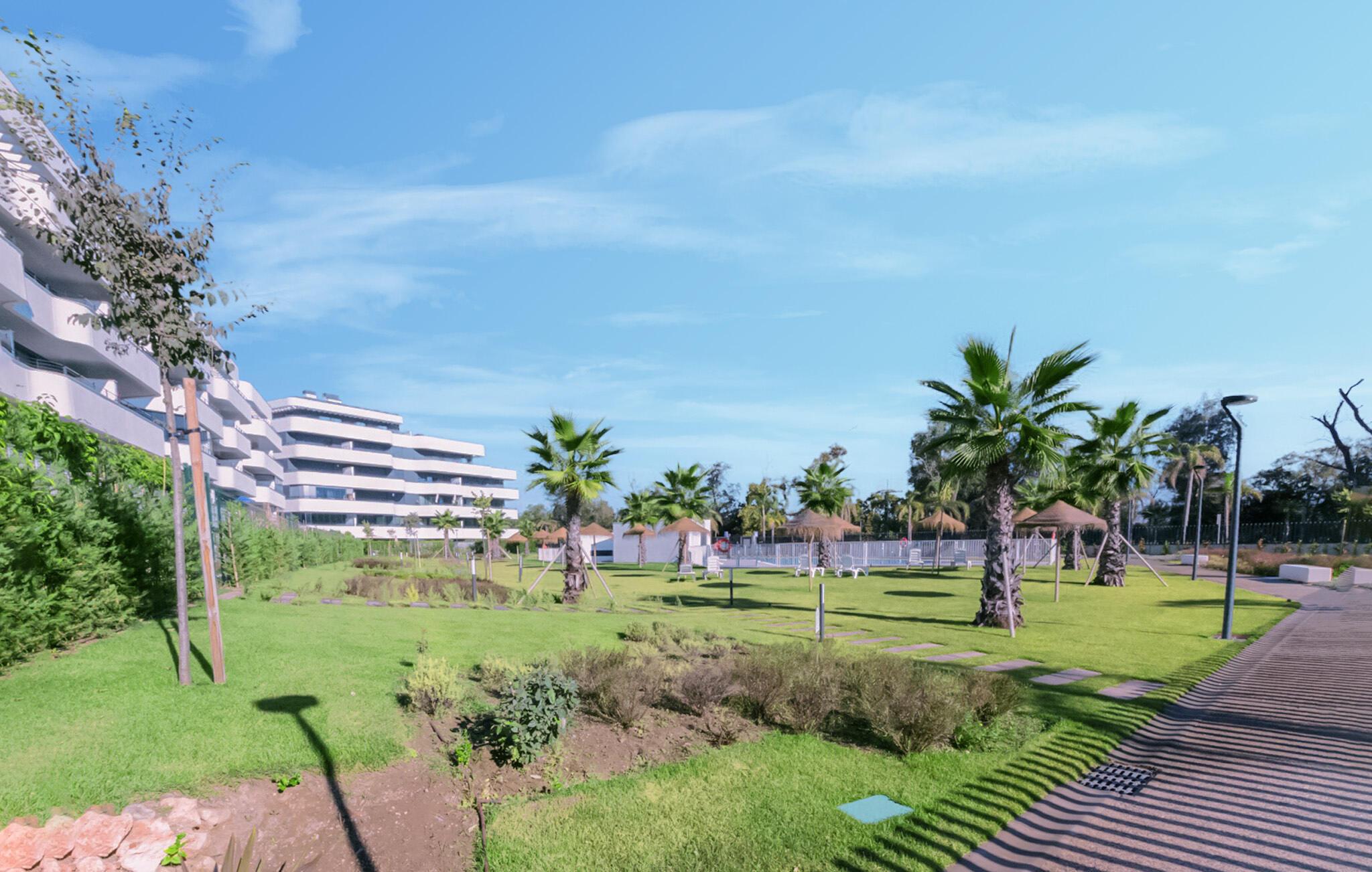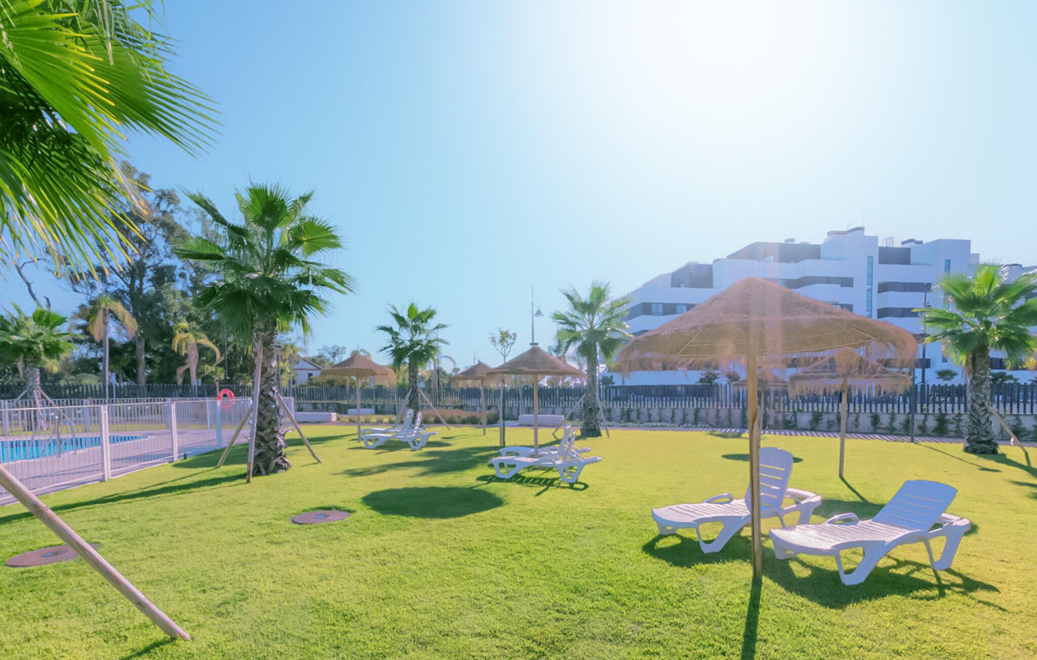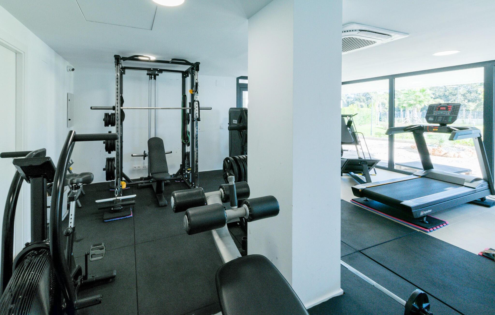 Det fælles udendørsområde tilbyder charmerende ekstrafunktioner. Brug fitnessrummet til jeres morgentræning, svøm lange baner i den store pool, og lyt til jeres yndlingspodcast på liggestolen.