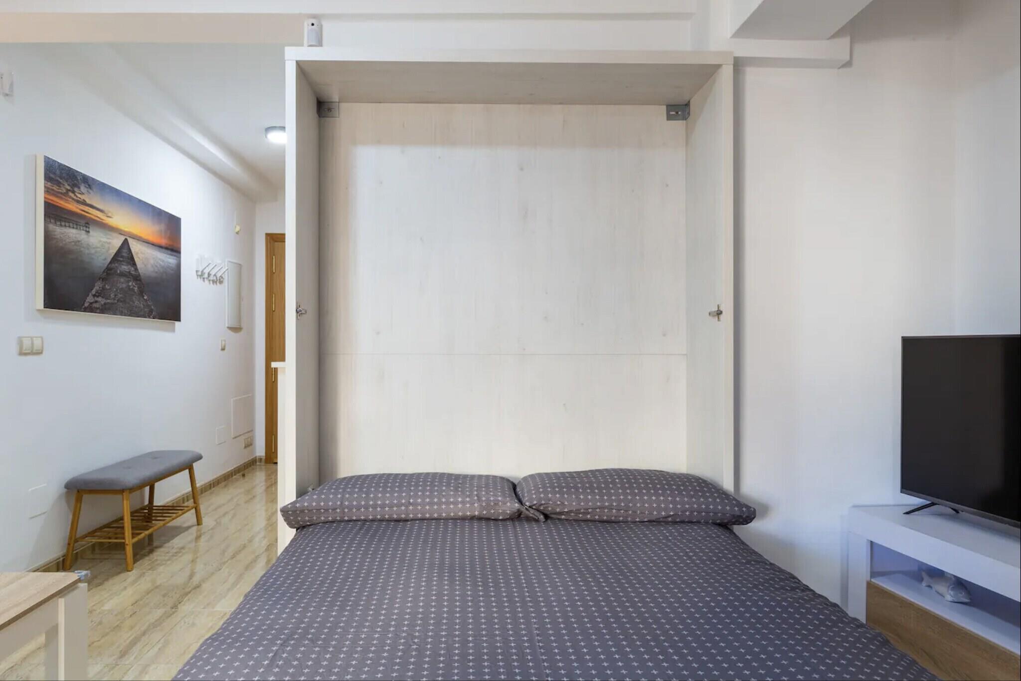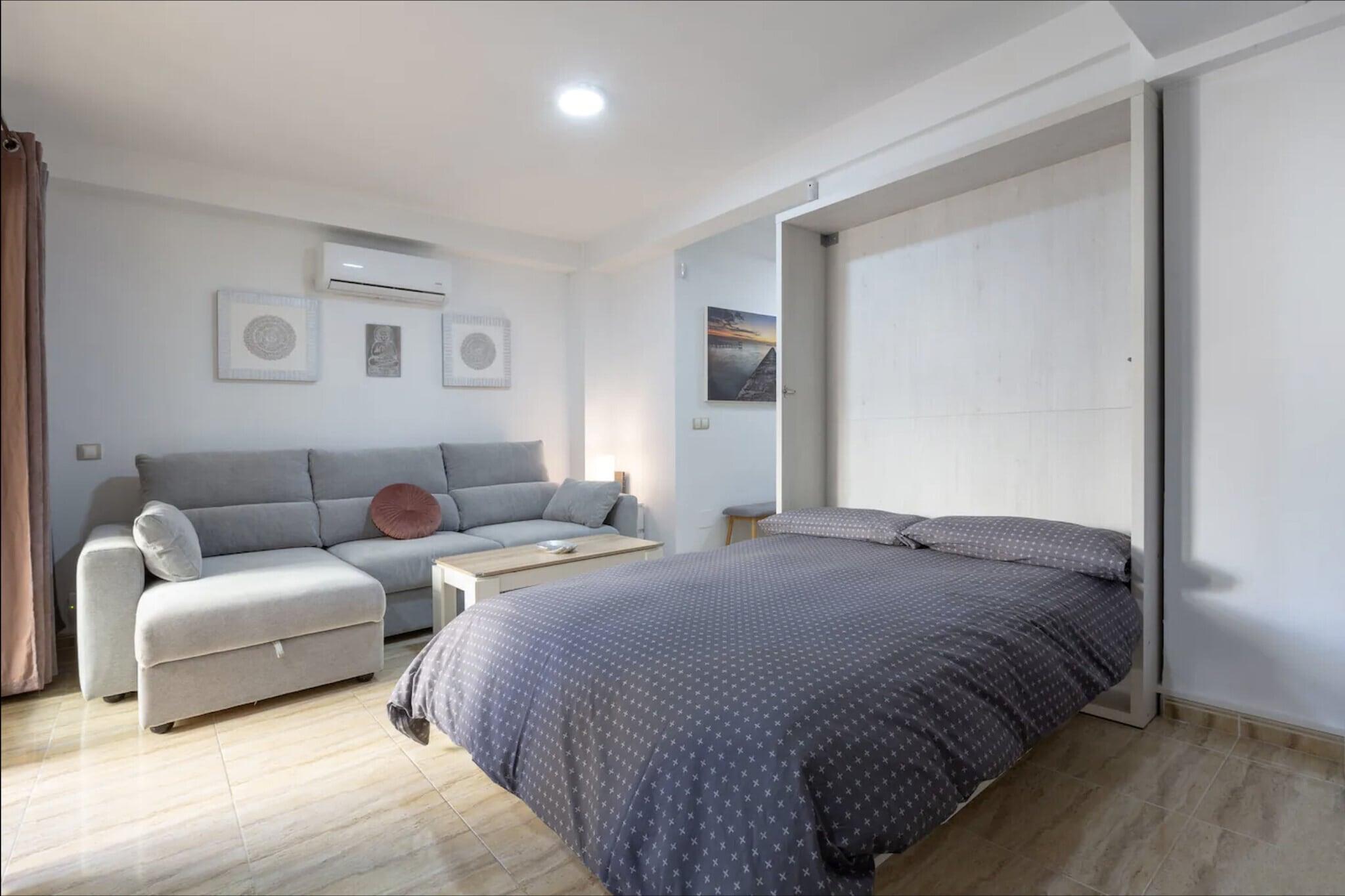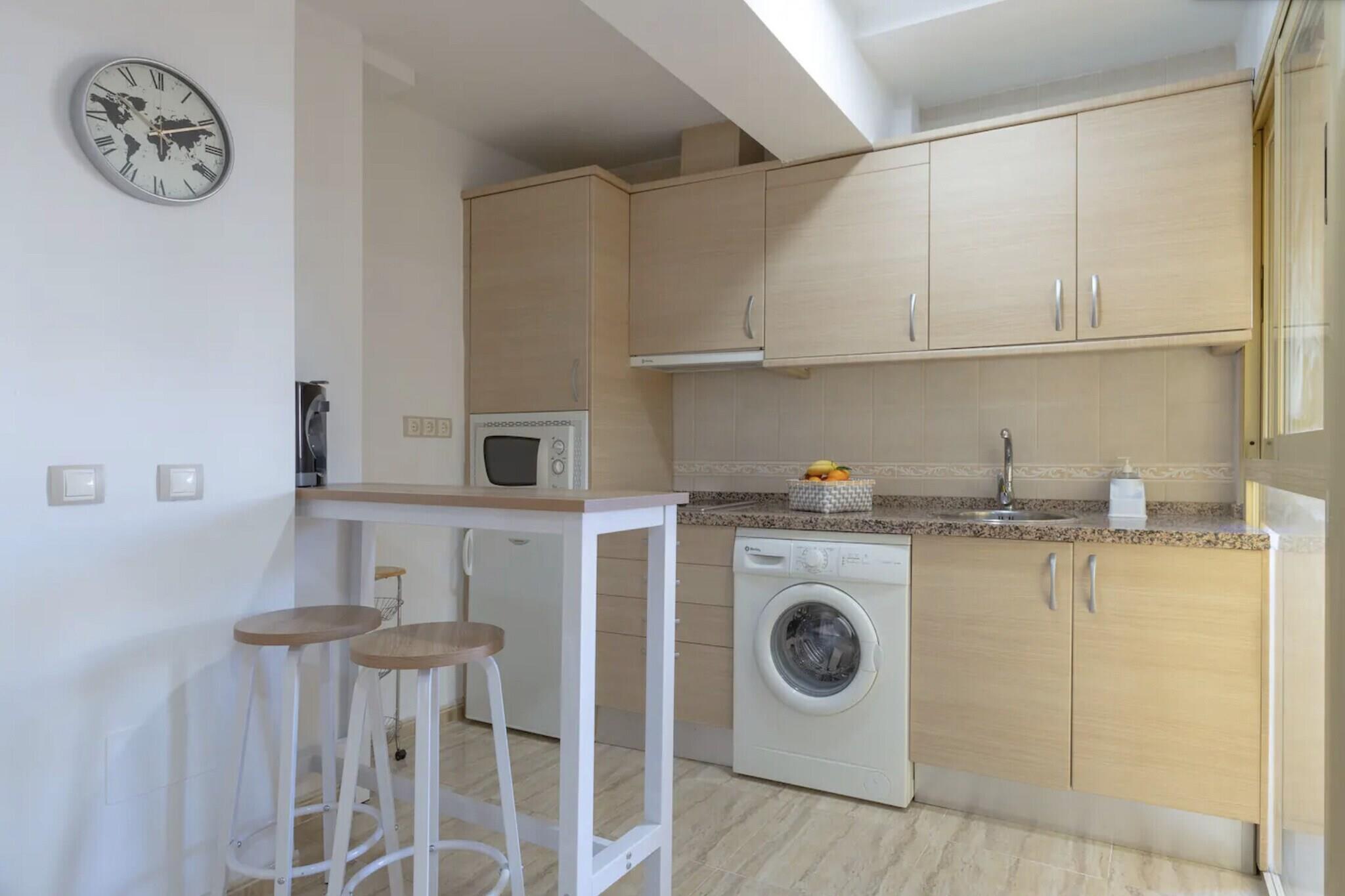 Dette charmerende feriehus, der er ideelt for par, byder på et veludstyret strandhus med et hyggeligt soveværelse med en dobbeltseng og plads til op til to gæster. Kæledyrselskere vil være glade for at vide, at ejendommen er kæledyrsvenlig, hvilket gør den til et passende valg for dem, der rejser med deres pelsede venner. Stuen har en komfortabel sofa, perfekt til afslappende aftener. Gæsterne kan også nyde frisk luft og havbrise fra en privat balkon. Under deres ophold er gæsterne velkomne til at benytte sig af gratis adgang til den fælles swimmingpool, hvilket tilføjer et ekstra element af afslapning. Beliggende kun 59 meter fra Playa de la Carihuela og en kort gåtur fra Playa de Bajondillo, er feriehuset omgivet af nogle af Torremolinos' bedste kystområder. Det ligger tæt på det travle byliv, med Calle San Miguel kun 1 km væk, der tilbyder et udvalg af caféer, restauranter og butikker. Daglige behov kan nemt opfyldes med nærliggende supermarkeder som Carrefour Express og Mercadona. Praktiske transportmuligheder omfatter Renfe Cercanías togstation 950 meter væk, Torremolinos busstation 2 km fra ejendommen og Málaga-Costa del Sol Internationale Lufthavn kun 8 km fra ejendommen, hvilket sikrer nem adgang for rejsende. Indenfor har ejendommen et funktionelt åbent køkken udstyret med glaskeramisk kogeplade, køleskab, mikrobølgeovn, ovn, fryser og alt nødvendigt køkkenudstyr, samt kaffemaskine, brødrister og elkedel. Der er også vaskemaskine, strygejern og hårtørrer til gæsternes bekvemmelighed.