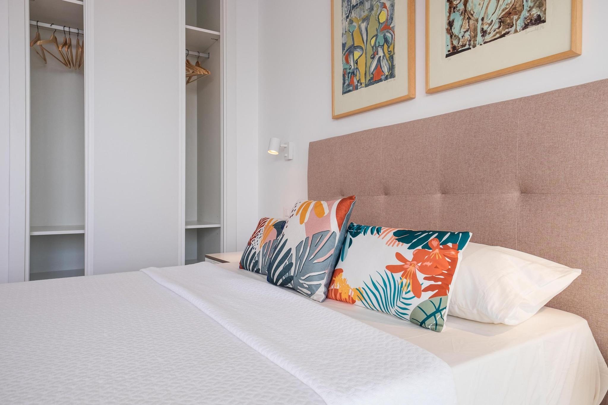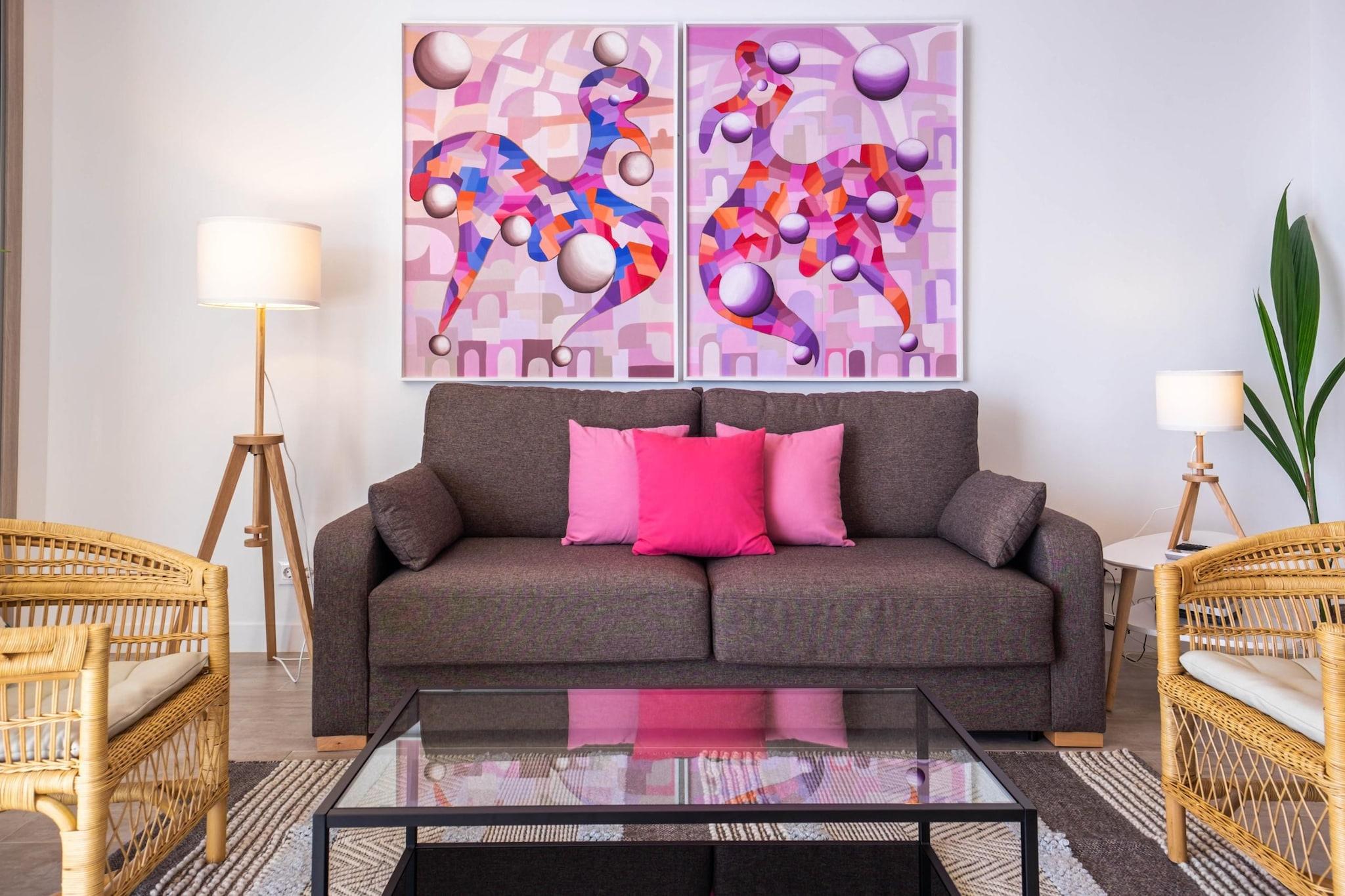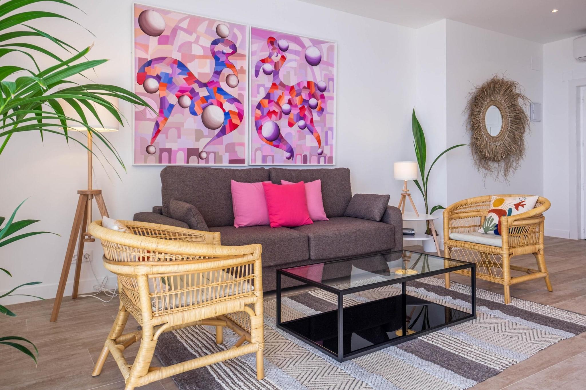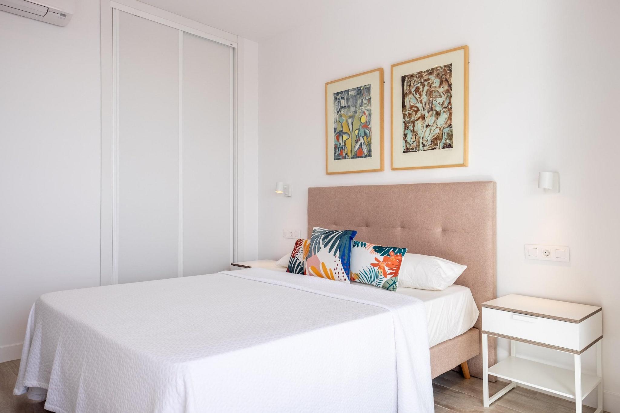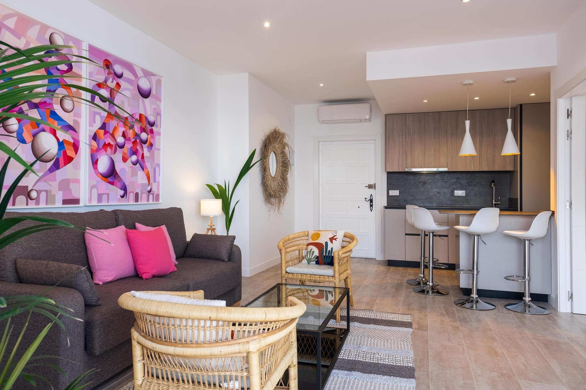Oplev et roligt kystnært tilflugtssted i Torremolinos, ideelt for par, små familier eller fjernarbejdere, der søger en blanding af komfort og middelhavscharme. Denne moderne lejlighed har to kingsize-soveværelser, der begge tilbyder en fantastisk havudsigt. Det ene soveværelse kan prale af en fuldt glaseret væg, der bringer havets skønhed direkte ind i dit rum. Træd udenfor til en rummelig privat terrasse på 60 kvadratmeter, perfekt til spisning under åben himmel eller blot afslapning, mens du nyder havbrisen. Den åbne stue er problemfrit forbundet med terrassen og skaber et luftigt og lyst miljø. Indenfor finder du et designerkøkken, to badeværelser med regnbrusere og et smart-tv med højhastigheds-Wi-Fi, der sørger for både afslapning og produktivitet. Lejligheden ligger kun et minuts gang fra Bajondillo-stranden og fem minutter fra La Carihuela-stranden og tilbyder direkte elevatoradgang til stranden, så gæsterne nemt kan nyde solen og havet. Nærliggende attraktioner omfatter Pablo Ruiz Picasso Kulturcenter, Casa de los Navajas og en livlig promenade fyldt med butikker og restauranter. For dem, der er interesserede i vandale, ligger Aqualand Torremolinos og Crocodile Park i nærheden. Yderligere faciliteter inkluderer aircondition, et fuldt udstyret køkken og valgfrie tjenester som leje af liggestole i sommermånederne og et refunderbart nøgledepositum for adgang til elevator. Uanset om du planlægger en romantisk weekendtur, en familieferie eller et fjernarbejde, tilbyder denne lejlighed de perfekte rammer til at slappe af og udforske Costa del Sols skønhed.