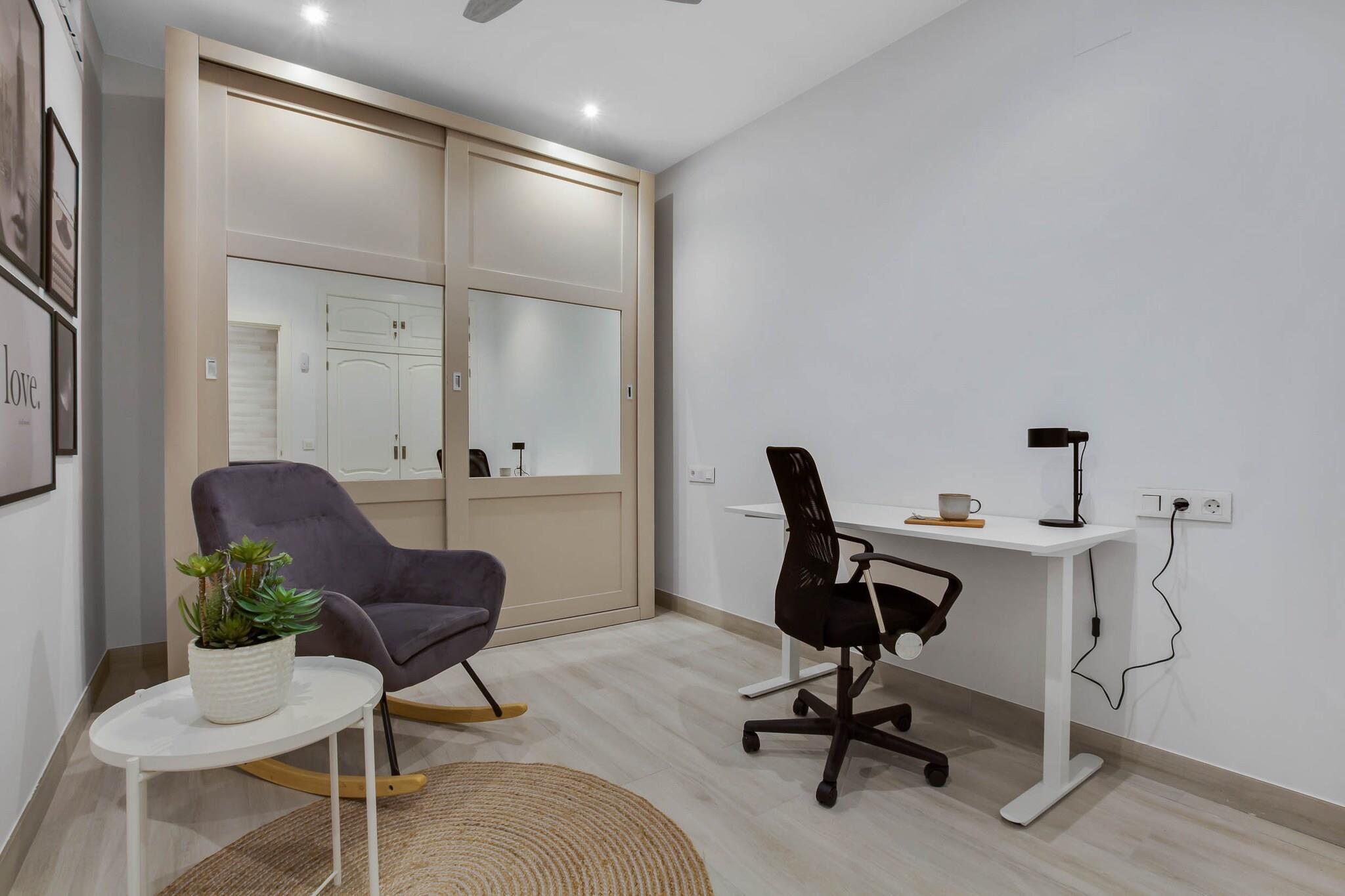 Denne moderne lejlighed i stueetagen ligger i hjertet af La Carihuela og tilbyder et komfortabelt tilflugtssted for familier på op til fire personer. Soveværelset har en hyggelig queensize-seng, mens stuen har en sovesofa, der er egnet til to gæster. Med to komplette badeværelser udstyret med brusere sikrer lejligheden privatliv og bekvemmelighed for alle. Der er også et dedikeret arbejdsområde til rådighed for dem, der har brug for at holde sig forbundet under deres ophold. Det fuldt udstyrede køkken kan prale af moderne apparater, herunder vaskemaskine og tørretumbler, hvilket giver mulighed for hjemmelavede måltider og nem tøjvask. Aircondition i både stue og soveværelse sikrer et behageligt indeklima, mens højhastigheds-Wi-Fi holder dig forbundet. Gå udenfor for at nyde fællesområderne i det lukkede område, der tilbyder et sikkert og roligt miljø. Lejligheden ligger kun et minuts gang fra La Carihuela-stranden og tilbyder nem adgang til sol og hav. Udforsk den nærliggende promenade med fiskerestauranter og butikker, eller besøg lokale attraktioner såsom det historiske Casa de los Navajas og den travle shoppinggade Calle San Miguel. Afslut din tur med en sjov dag på Aqualand Torremolinos eller en naturskøn gåtur til Benalmádena Marina, hvor du afslutter med traditionelle churros og chokolade. Bemærk venligst, at der kan opstå yderligere omkostninger ved et refunderbart depositum og valgfrie tjenester i højsæsonen. Uanset om du søger afslapning eller eventyr, er denne lejlighed en ideel base for din ferie på Costa del Sol.