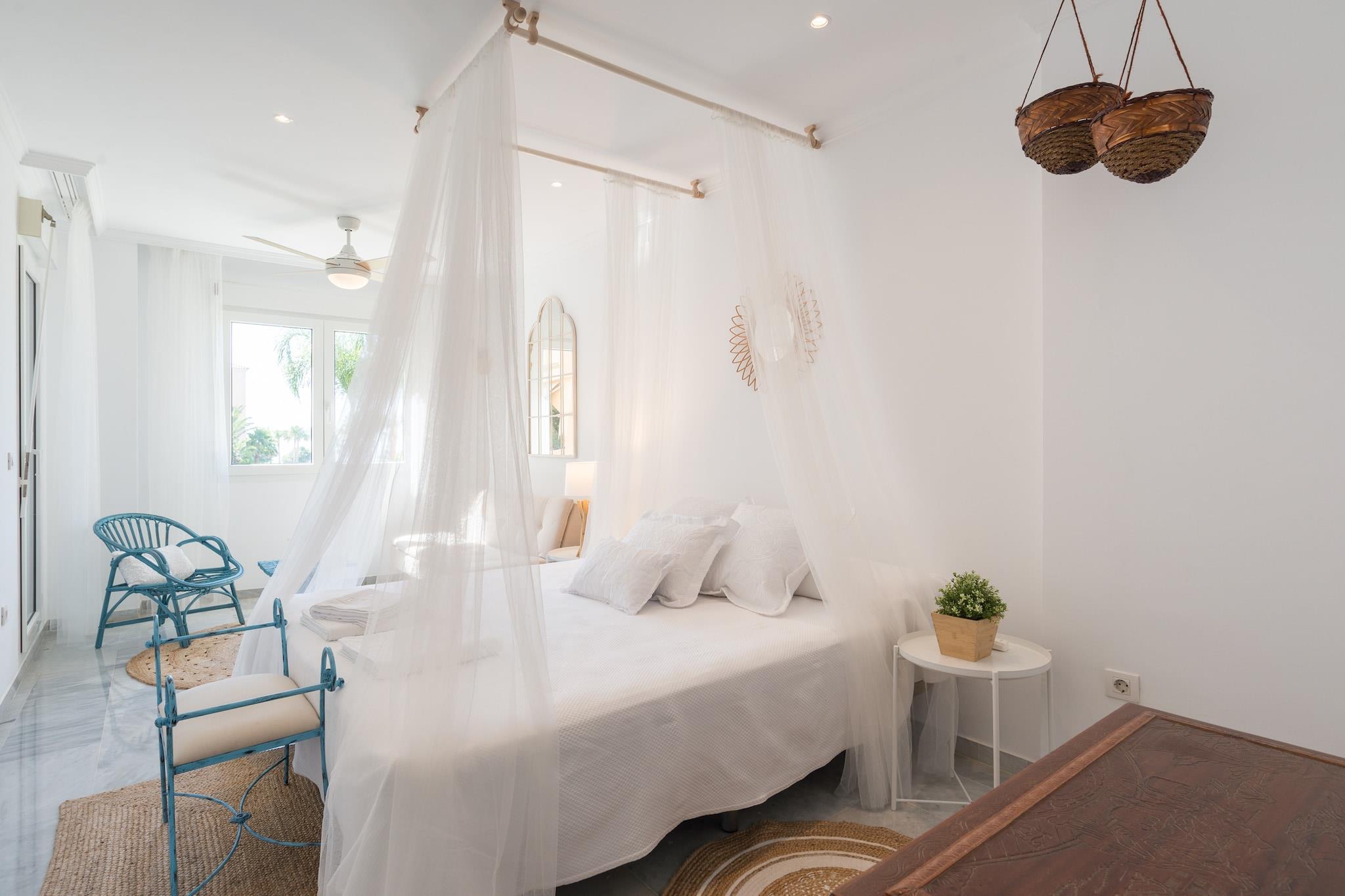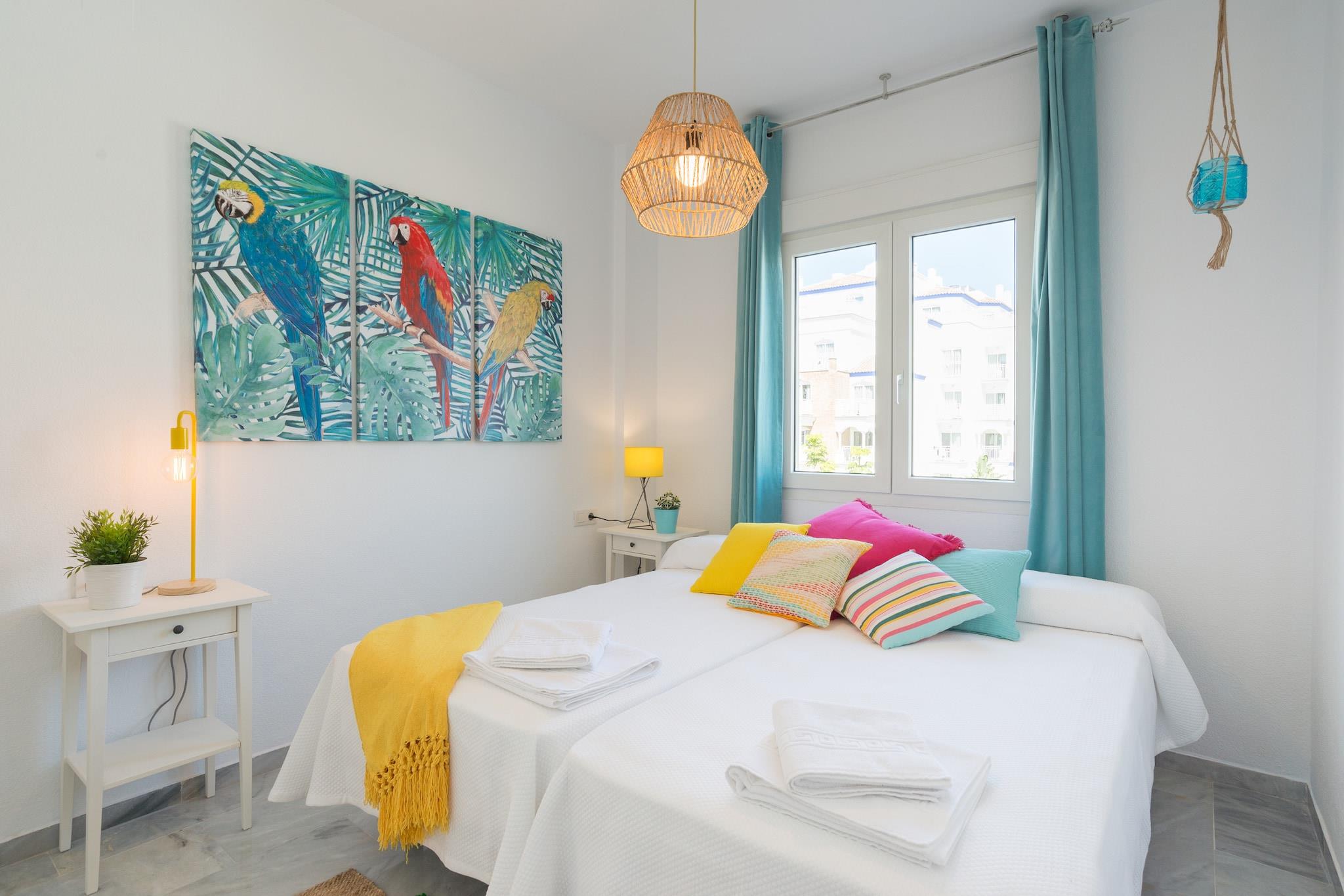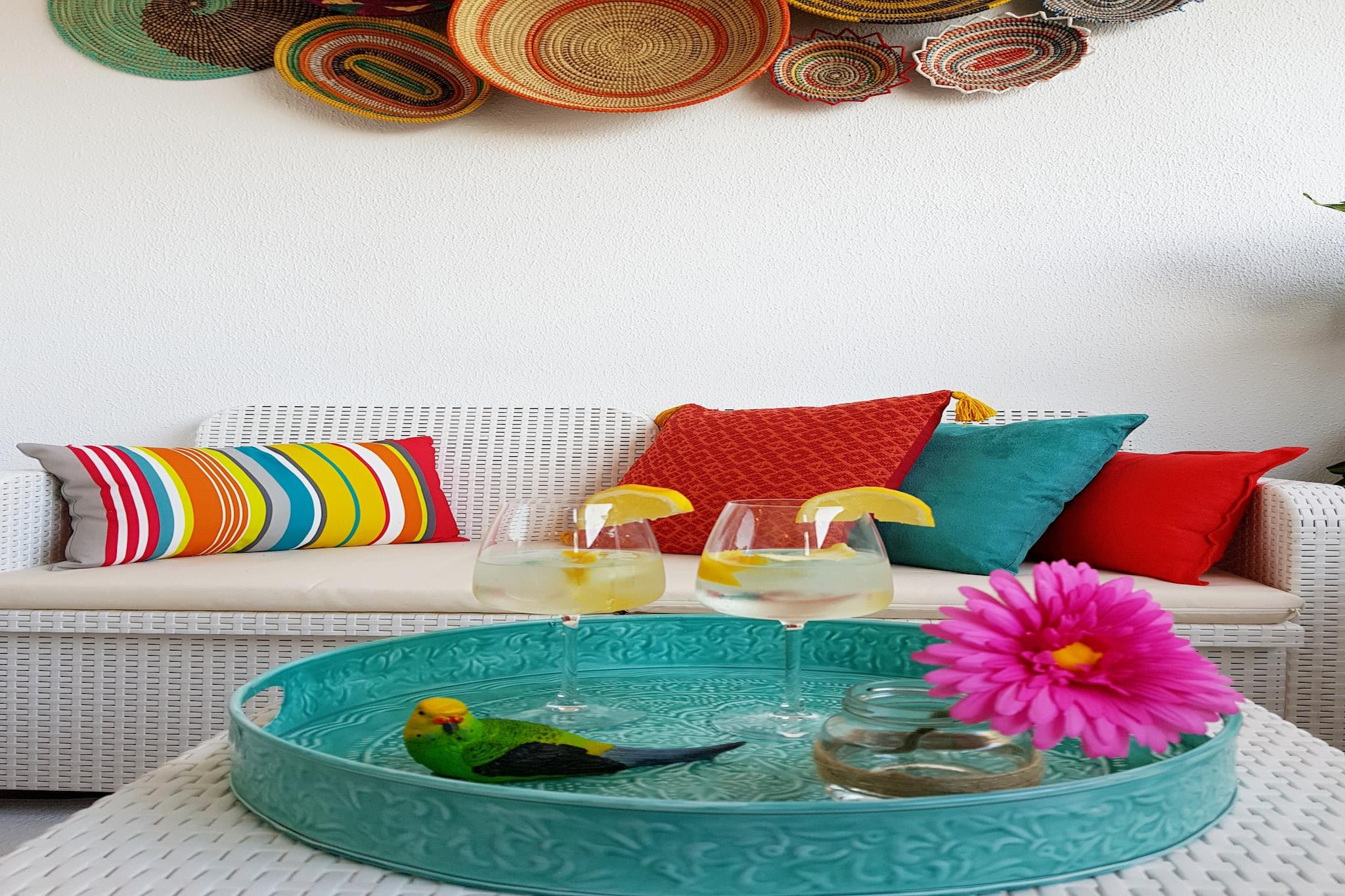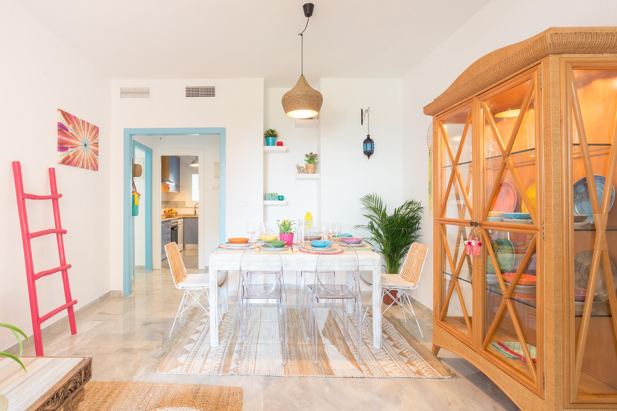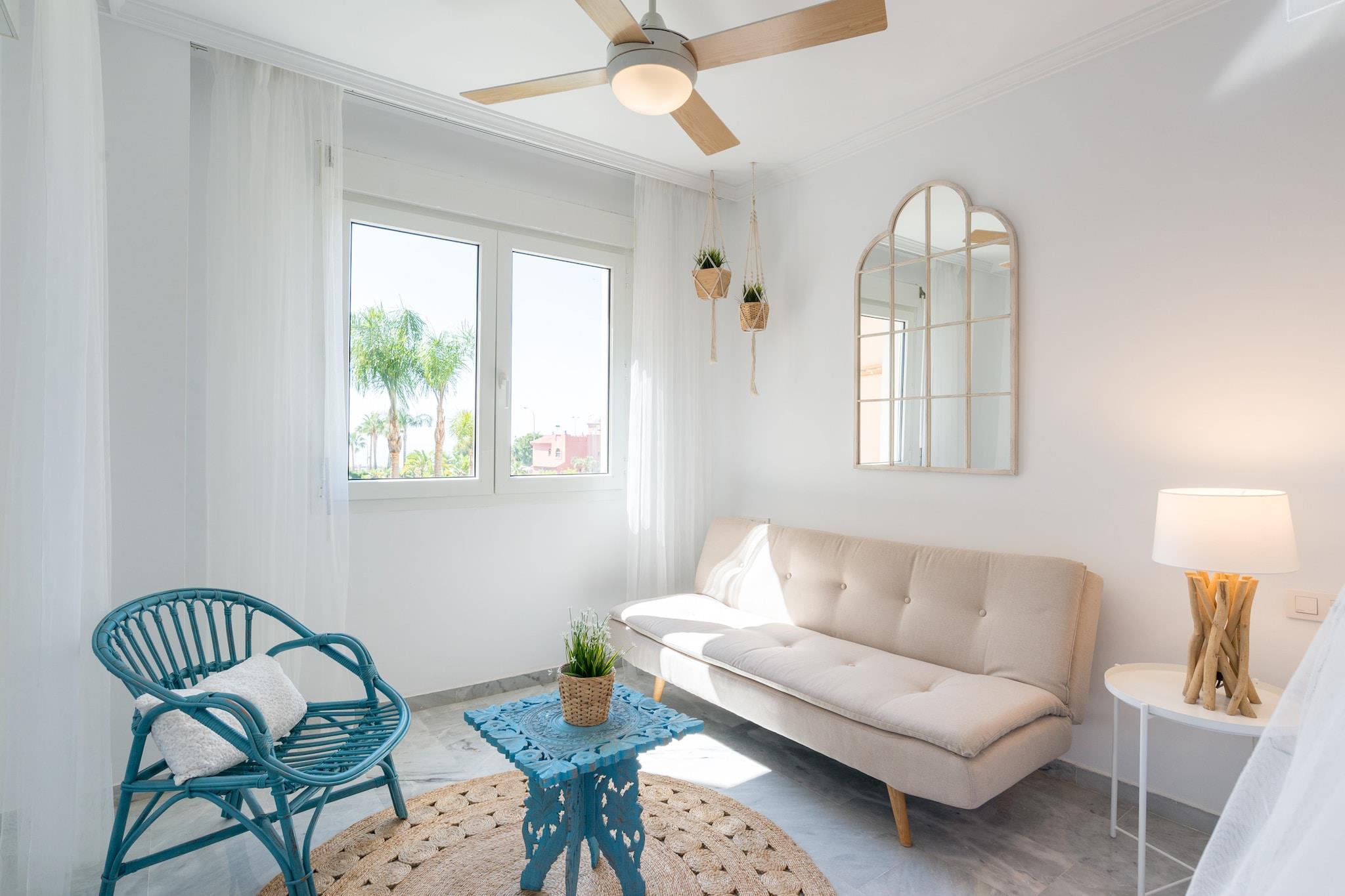 Nyd den afslappede elegance i denne boheme chikke 2-værelses lejlighed, ideelt beliggende kun få skridt fra Torremolinos' gyldne sandstrand. Lejligheden er designet til at rumme op til 8 gæster og har et soveværelse med en XXL himmelseng, et andet soveværelse med to enkeltsenge, der kan adskilles, og en rummelig opholdsstue med en sovesofa, der er egnet til to voksne. Det fuldt udstyrede køkken kan prale af moderne apparater, herunder opvaskemaskine, Nespresso-kaffemaskine og juicer, hvilket sikrer et behageligt ophold. En privat terrasse tilbyder en fantastisk havudsigt og er den perfekte ramme for afslapning. Denne lejlighed er perfekt til familier, vennegrupper eller par, der søger et rummeligt og stilfuldt strandparadis. Dens nærhed til stranden og lokale attraktioner gør den til en fremragende base for at udforske den pulserende kultur og naturlige skønhed på Costa del Sol. Gæsterne kan nyde den sæsonåbne saltvandspool, der er åben fra 1. juni til 15. september, og slappe af i de frodige haveområder med hængekøjer. Der tilbydes gratis cykler til at køre langs den maleriske promenade. Lejligheden er også kæledyrsvenlig, så dine pelsede venner kan deltage i det sjove. Nærliggende attraktioner inkluderer Playa El Bajondillo, La Carihuela-stranden, det historiske Casa de los Navajas og det store vandland Aqualand. Med nem adgang til offentlig transport og Málaga Lufthavn kun 6 km væk, er eventyr og afslapning lige uden for døren. Yderligere information Gebyrer for sen indtjekning: Ankomst mellem kl. 21:00 og 23:00 medfører et gebyr på EURO30; mellem kl. 23:00 og 01:00, EURO50. Depositum: Et refunderbart depositum på op til EURO300 kan være påkrævet for at dække eventuelle skader under dit ophold. Sæsonbestemt pool: Den udendørs pool er åben fra 1. juni til 15. september.