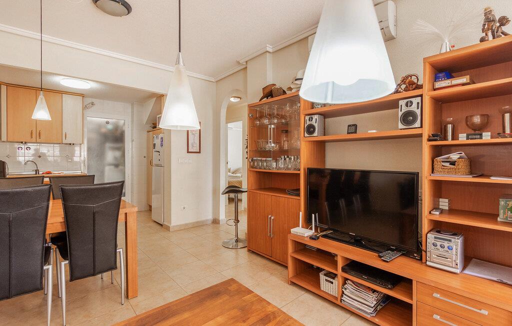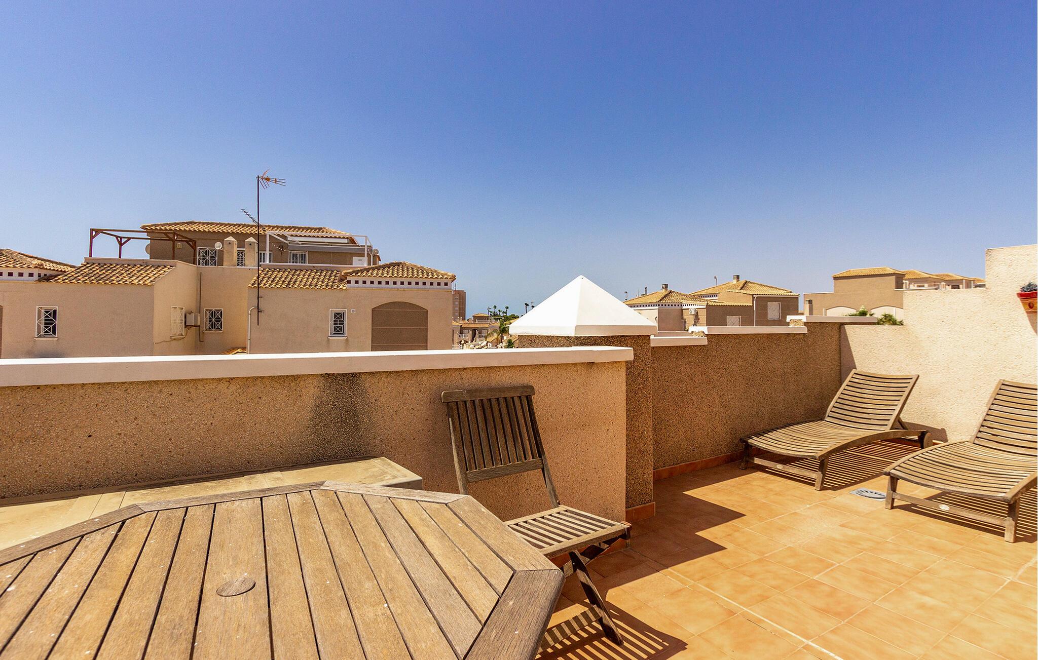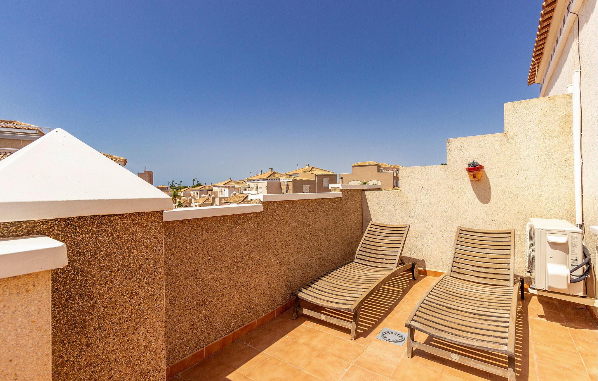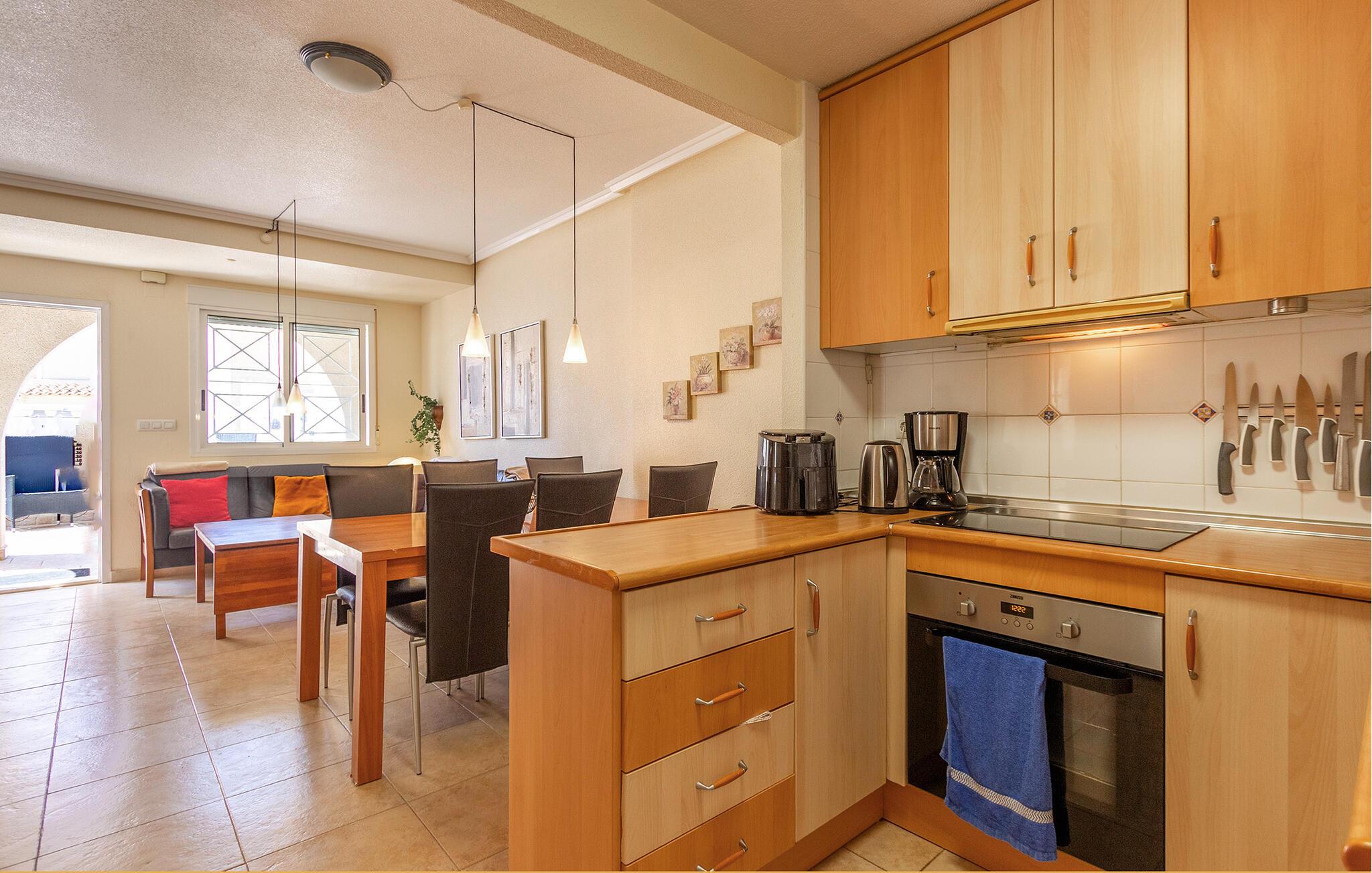 Begynd dagene med en fælles morgenmad, som I kan tilberede i det åbne, veludstyrede køkken. Tag plads ved det tilstødende spisebord og planlæg dagen frem. Den hyggelige opholdsstue lægger op til hyggestunder. Sæt jer godt til rette i sofaen, se en sjov film sammen eller spil et spil kort. På balkonen til jeres rækkehus i Torrevieja kan I nyde den vidunderlige udsigt med en forfriskende drink.