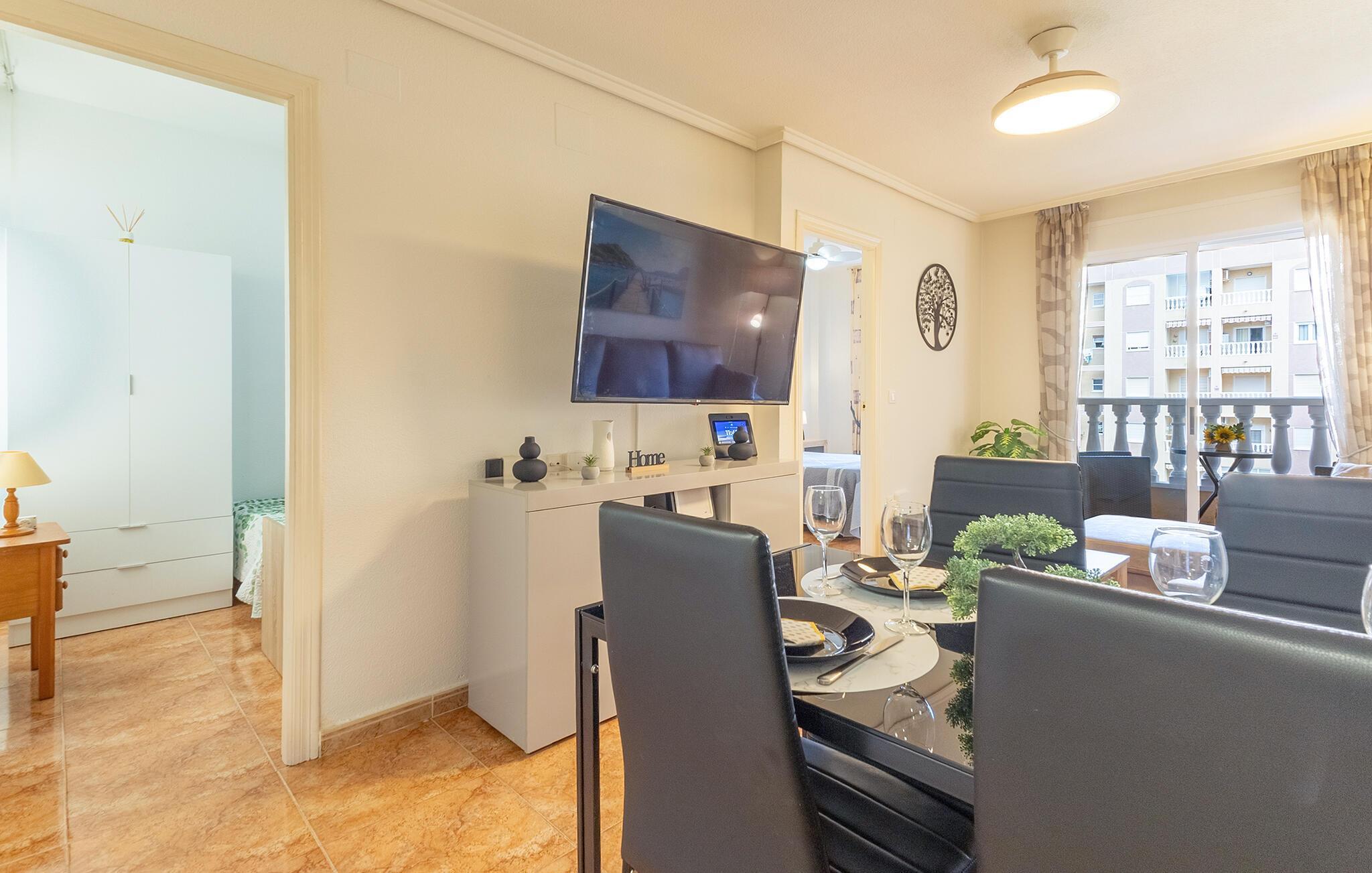 Denne moderne og smagfulde ferielejlighed tilbyder jer et komfortabelt hjem på den solbeskinnede Costa Blanca. Føl jer hjemme med familien, mens I tilbereder lækre tapas i det moderne køkken, som I derefter kan nyde i den lyse opholdsstue. Gør det behageligt i sofaen, vær vært for en spilleaften, eller stream en film, som alle nyder.