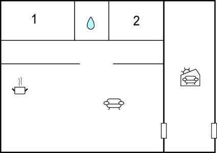 Lejligheden består af to soveværelser samt bad, stue og et åbent køkken med dejlig udsigt over poolområdet. I vintermånederne kan I sidde dejligt lunt i udestuen.