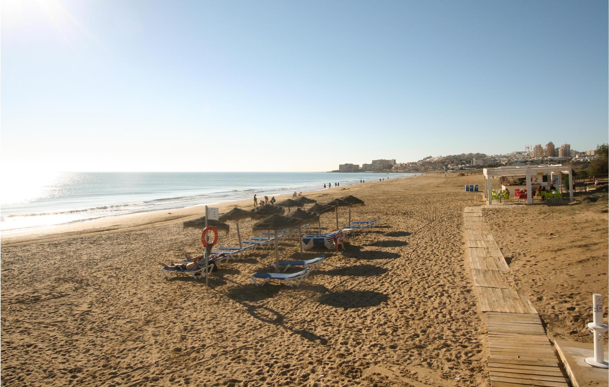 Torrevieja tilbyder sine besøgende alle mulige aktiviteter . lige fra vandsport i fiskerihavnen til dejlige gåture på promenaderne omgivet af caféer og restauranter. Her kan du finde alle slags internationale og nationale retter såsom ris, fisk og fantastiske tapas. Torrevieja er også kendt for sine berømte saltsøer, som er omgivet af smukke naturparker. Ejendommen ligger ikke langt fra byens største strand, La Mata. Huset ligger i et boligkompleks med en smuk fælles pool. Lejligheden er meget komfortabel, da den har en åben terrasse, vinterhave, 2 soveværelser, badeværelse, stue og køkken i stueetagen. En udvendig trappe fører bagfra til en stor, privat terrasse.