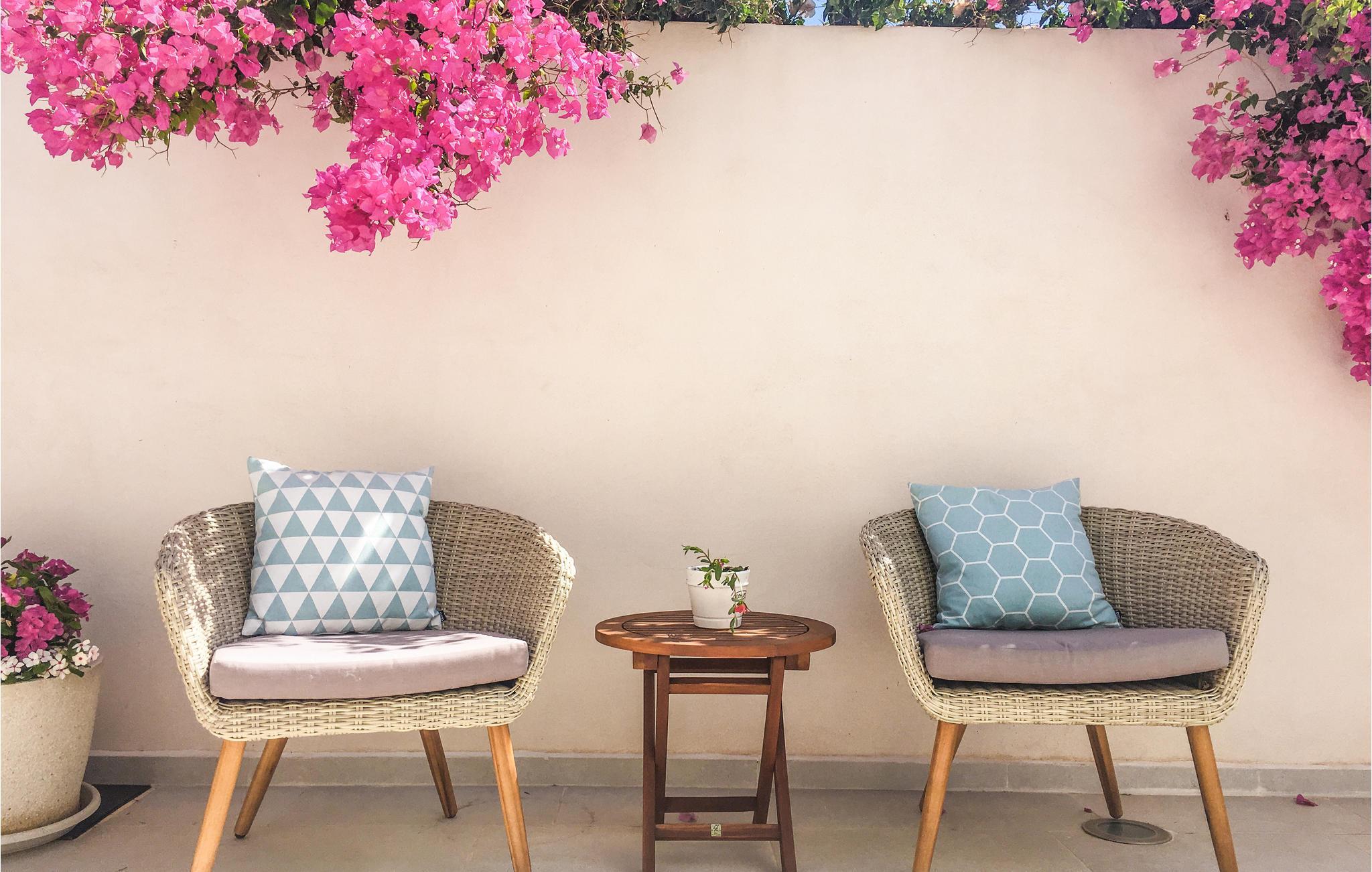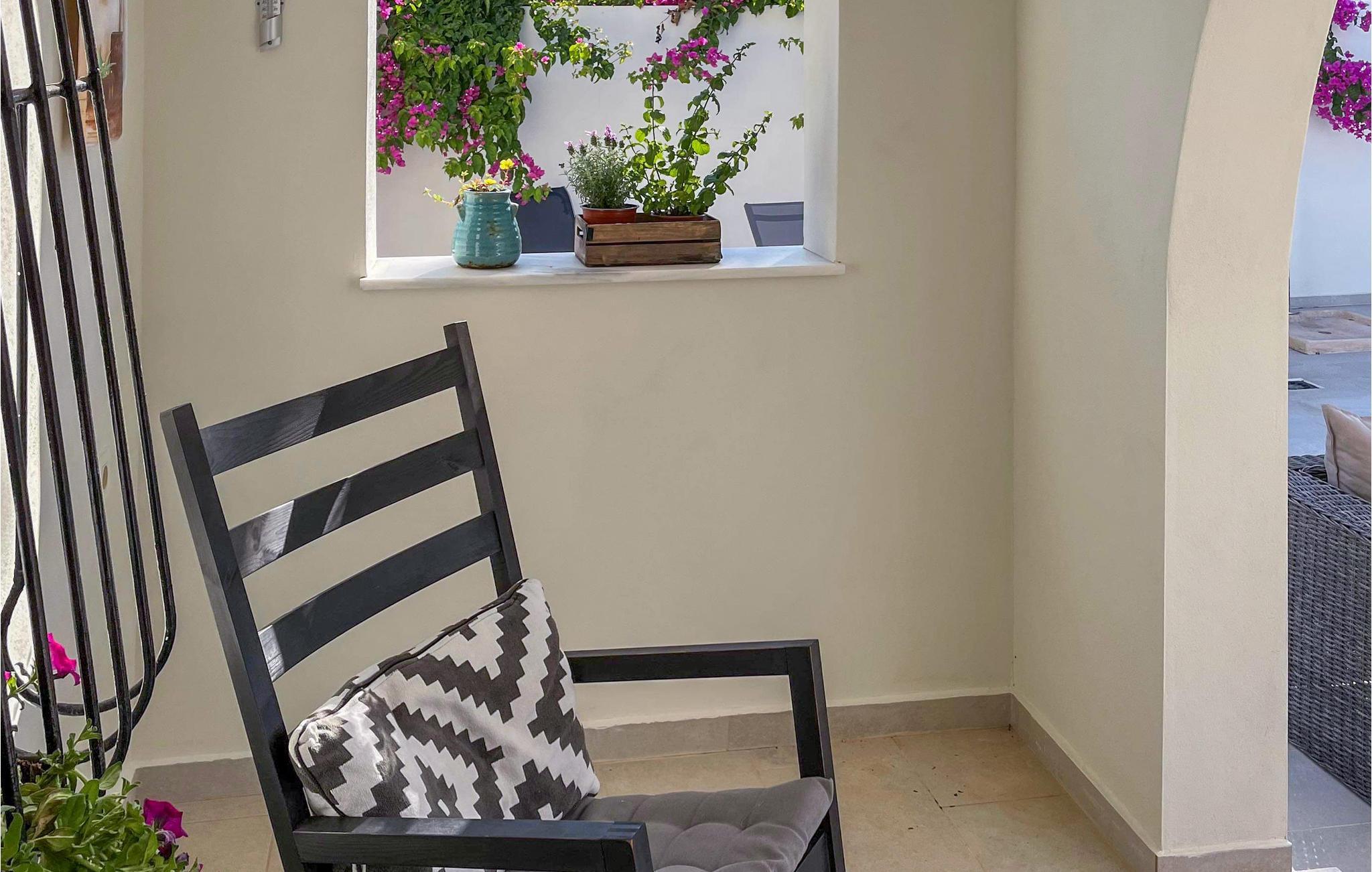 Fra opholdsområdet kan I træde direkte ud på terrassen og nyde solen. Svøm et par runder i poolen og sæt jer derefter til rette i en loungestol.