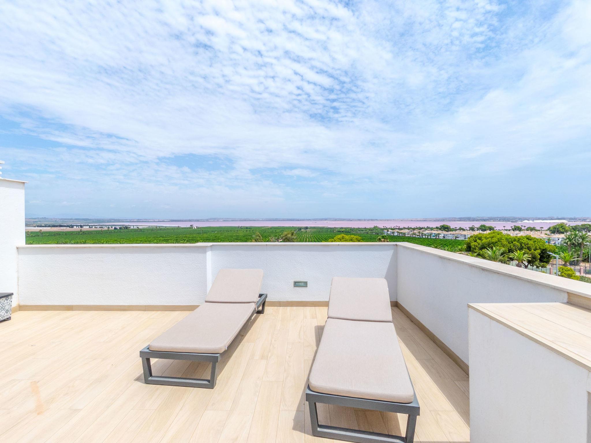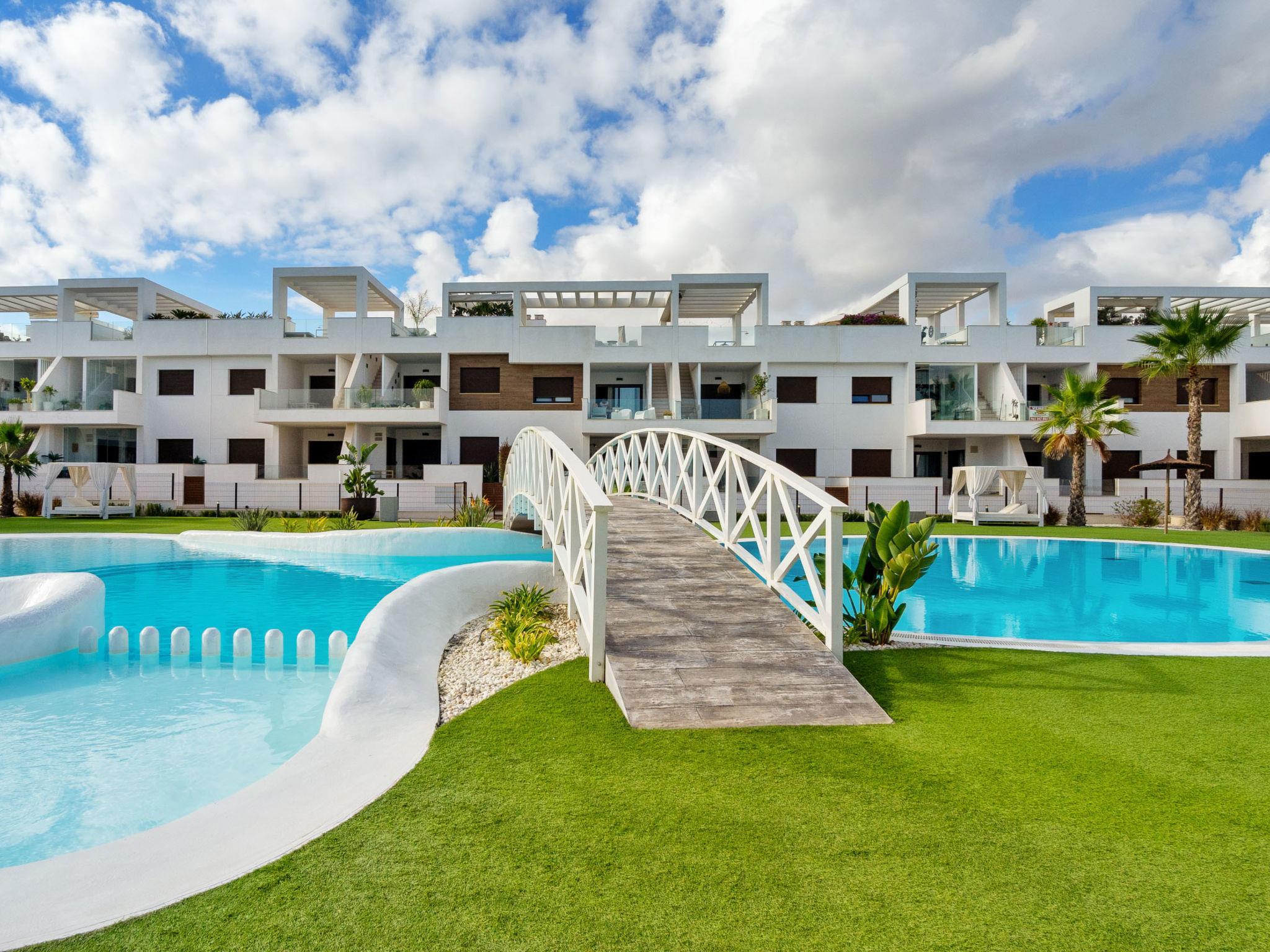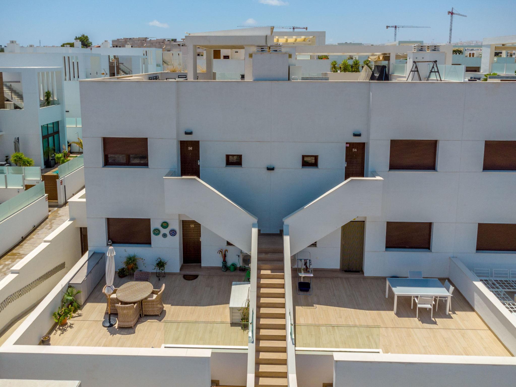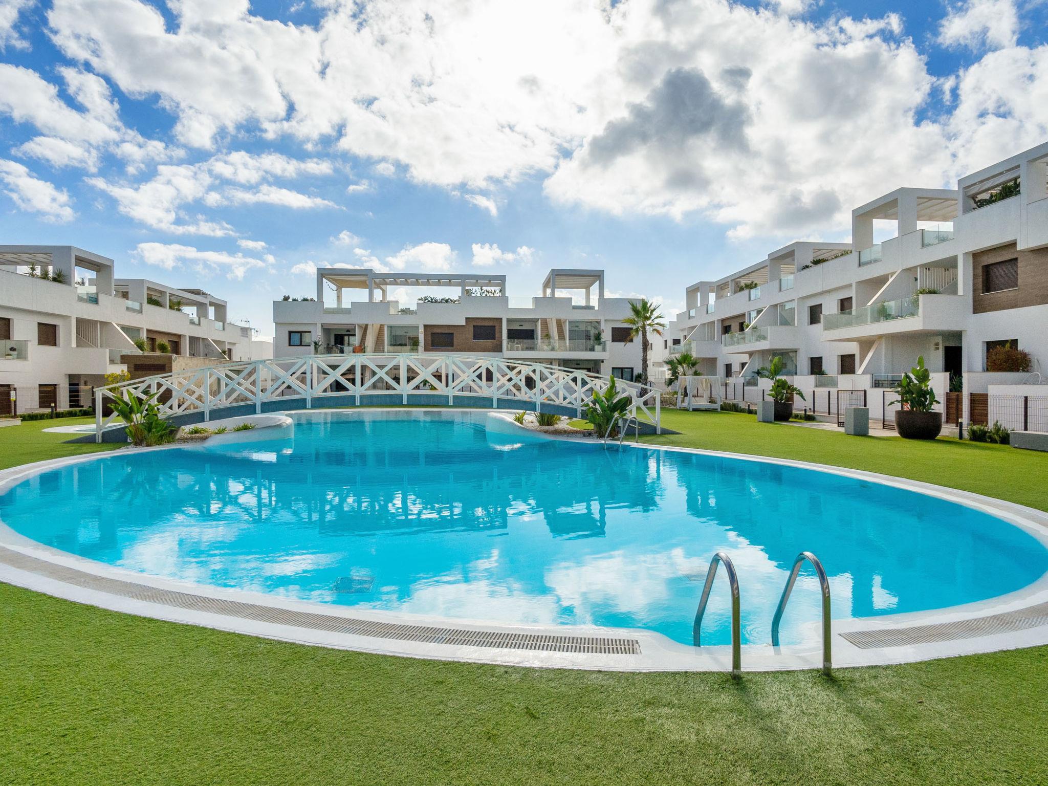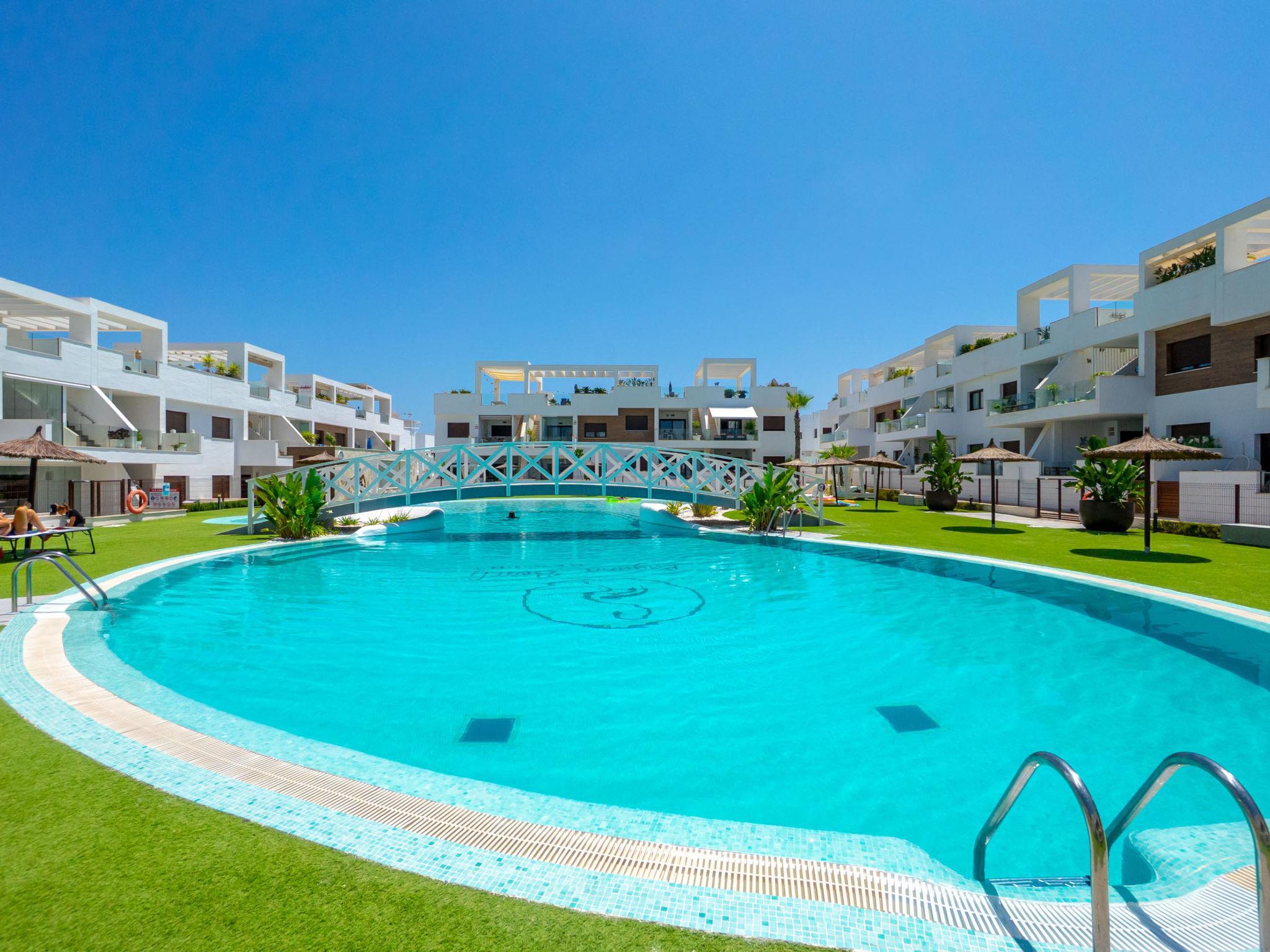 Modern, beautiful residence "Laguna Beach Resort", 2 storeys. 7 km from the centre of Torrevieja, 5 km from the centre of Punta Prima, 4 km from the sea, 4 km from the beach. For shared use: property (fenced), swimming pool (32 x 14 m, seasonal availability: 01.Jan. - 31.Dec.). Children's pool, outdoor shower. In the house: roof terrace. Grocery, supermarket 700 m, restaurant 850 m, bar 700 m, bus stop 750 m, sandy beach "Playa Punta Prima" 6 km. Sports harbour 6 km, marina 6 km, golf course (12 hole) 5 km.