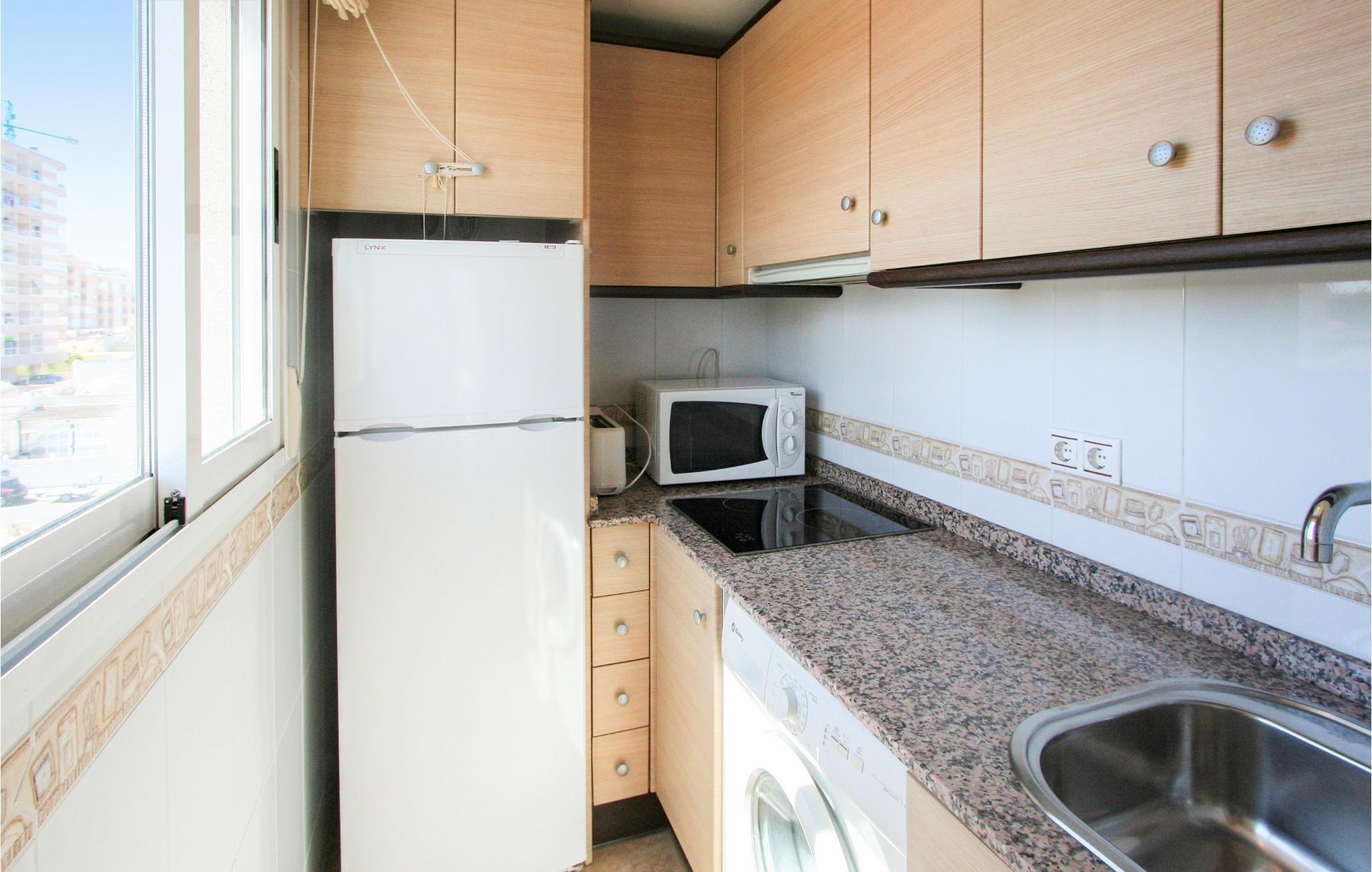 Den ligger i en lejlighedskompleks med en fælles pool og en fantastisk udsigt over byen. Med 2 soveværelser, et veludstyret køkken, et badeværelse og en rummelig stue, tilbyder denne lejlighed jer moderne komfort til en vidunderlig ferie. Der er mange restauranter og barer i området, hvor I kan prøve lækre middelhavsretter. Kun 1 km væk kan I nå stranden, som er ideel til afslappende vandreture på stranden. Der er et supermarked kun 400 meter væk og en restaurant 300 meter væk. Der kører busser til centrum af Torrevieja hvert 30. minut.