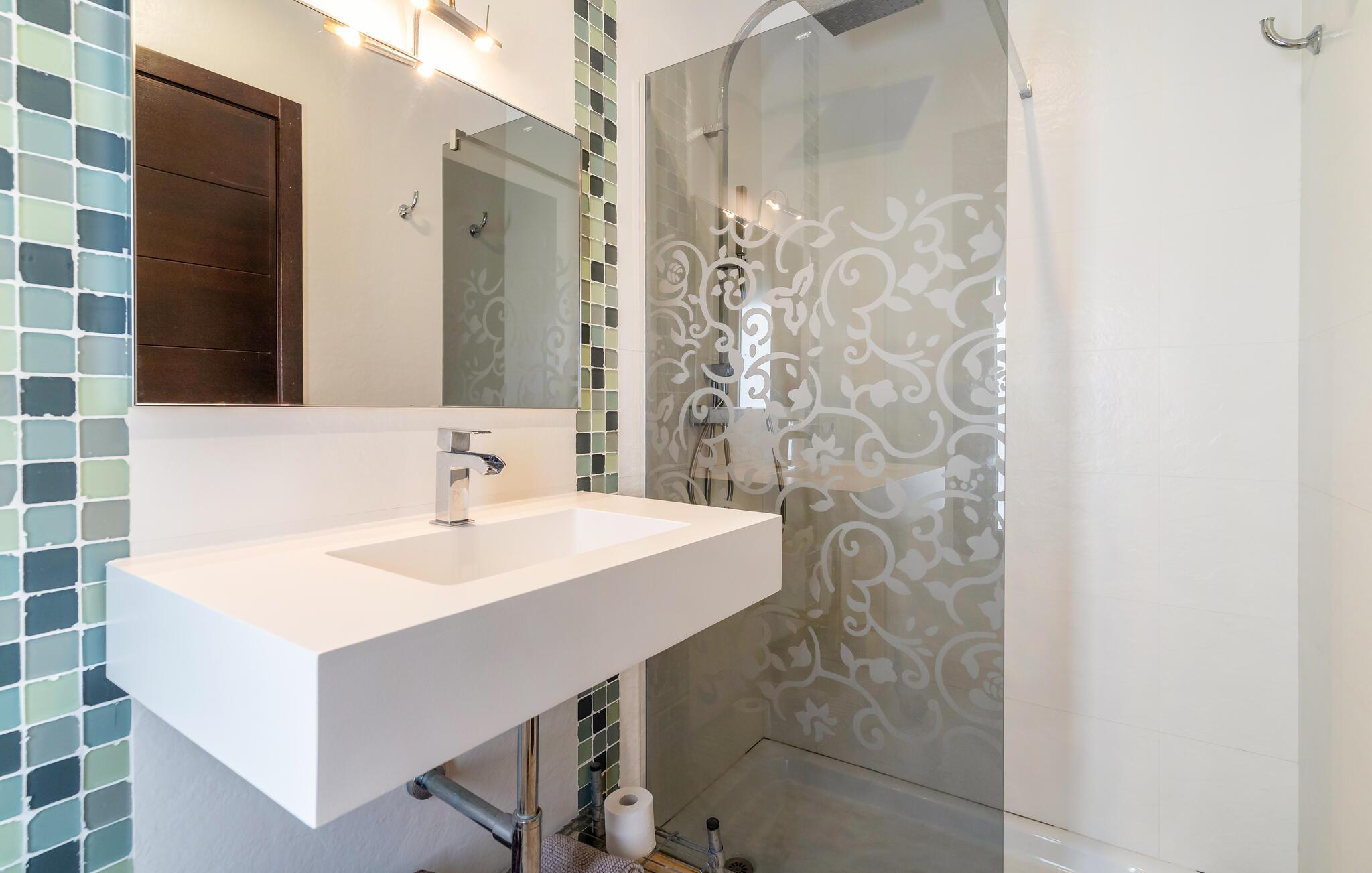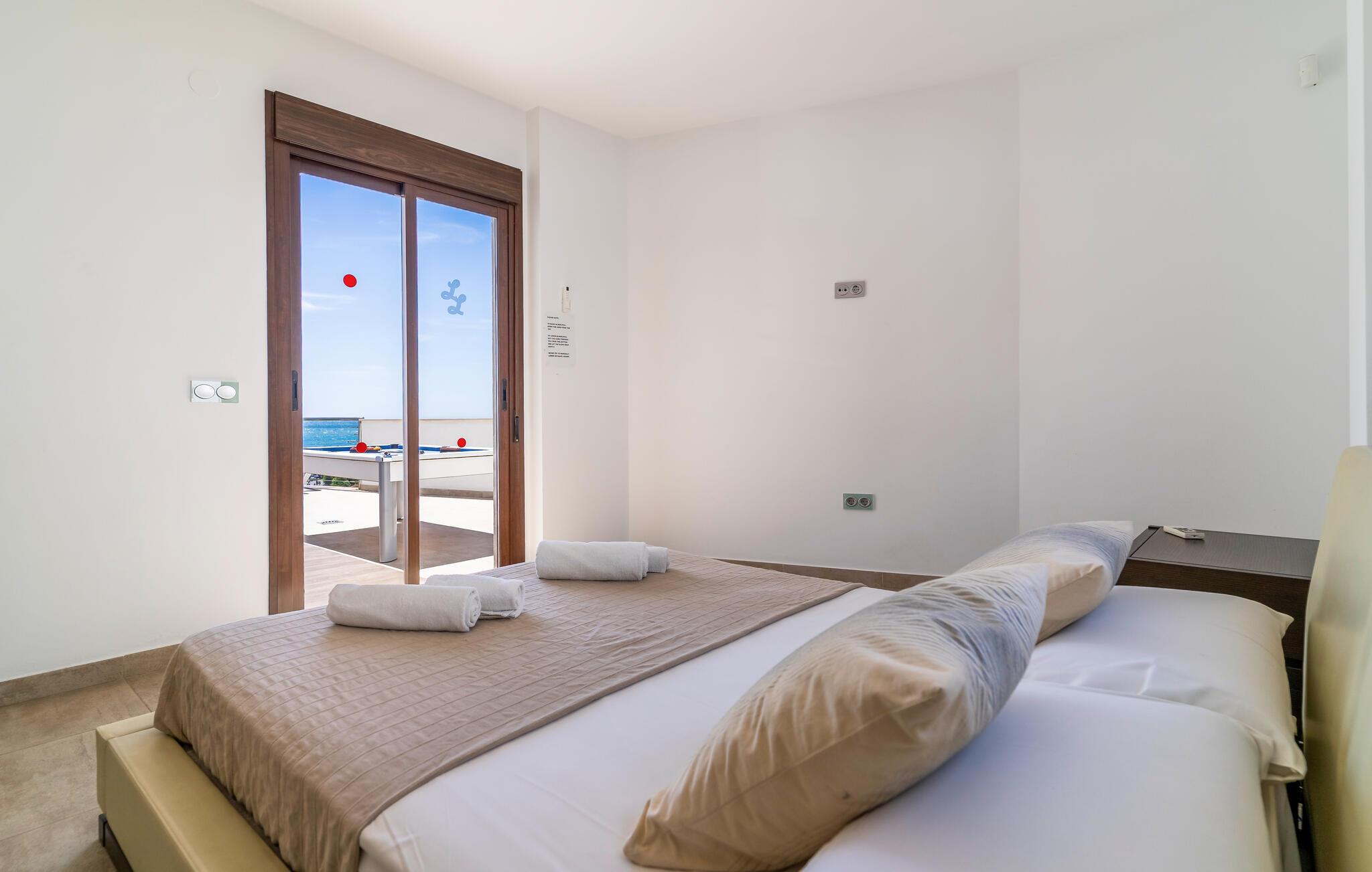 De brede skydedøre i glas giver nem adgang til den rummelige terrasse, hvor en charmerende udsigt over havet venter dig. Start dagen med friskpresset appelsinjuice, forfrisk jer i jeres lille private pool, og slap af på de komfortable liggestole. Der er en grill til stemningsfulde aftener med vin og stearinlys.