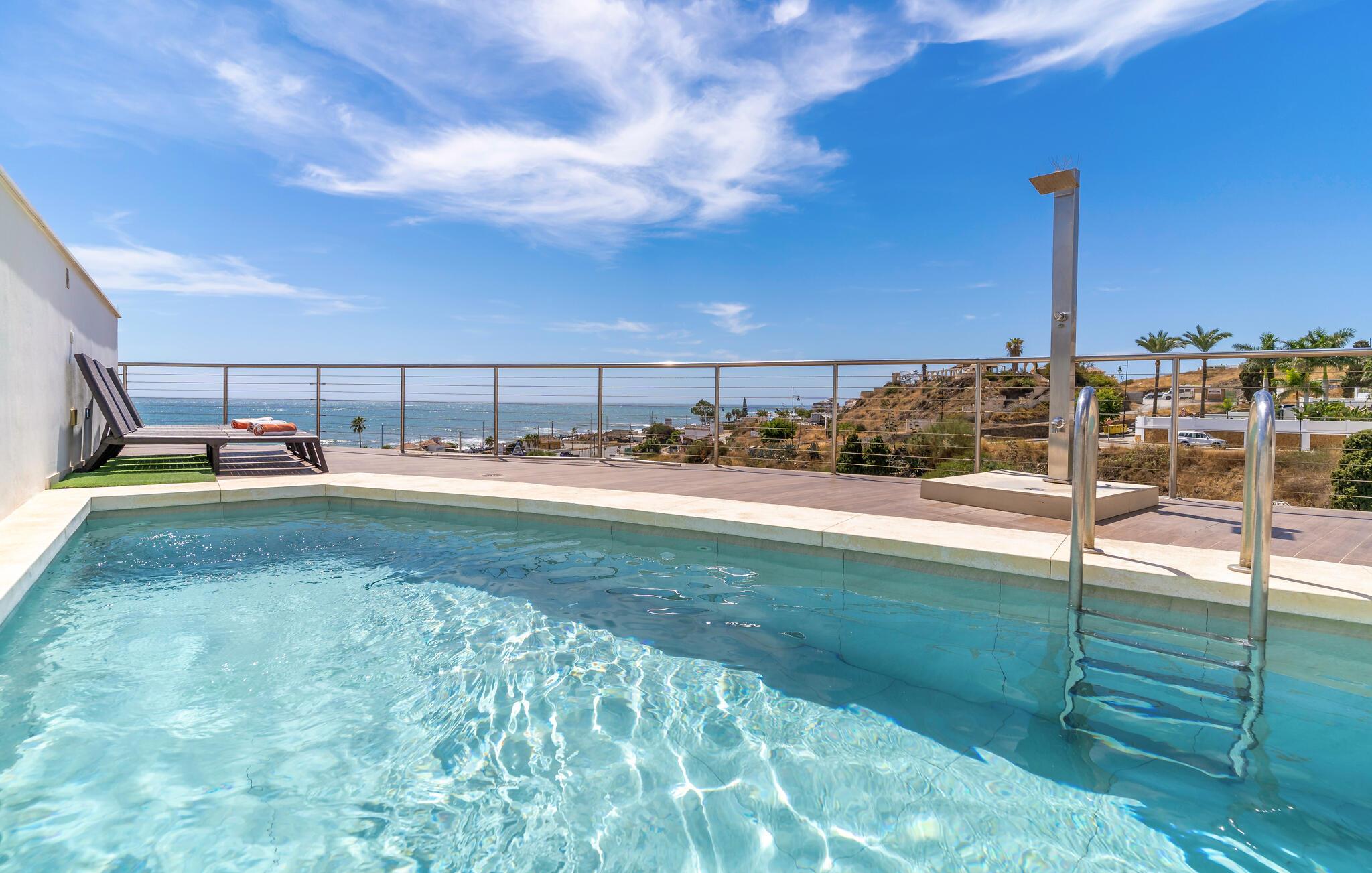 Forkæl jer selv med en solrig ferie i dette komfortable feriehus med pool og havudsigt.